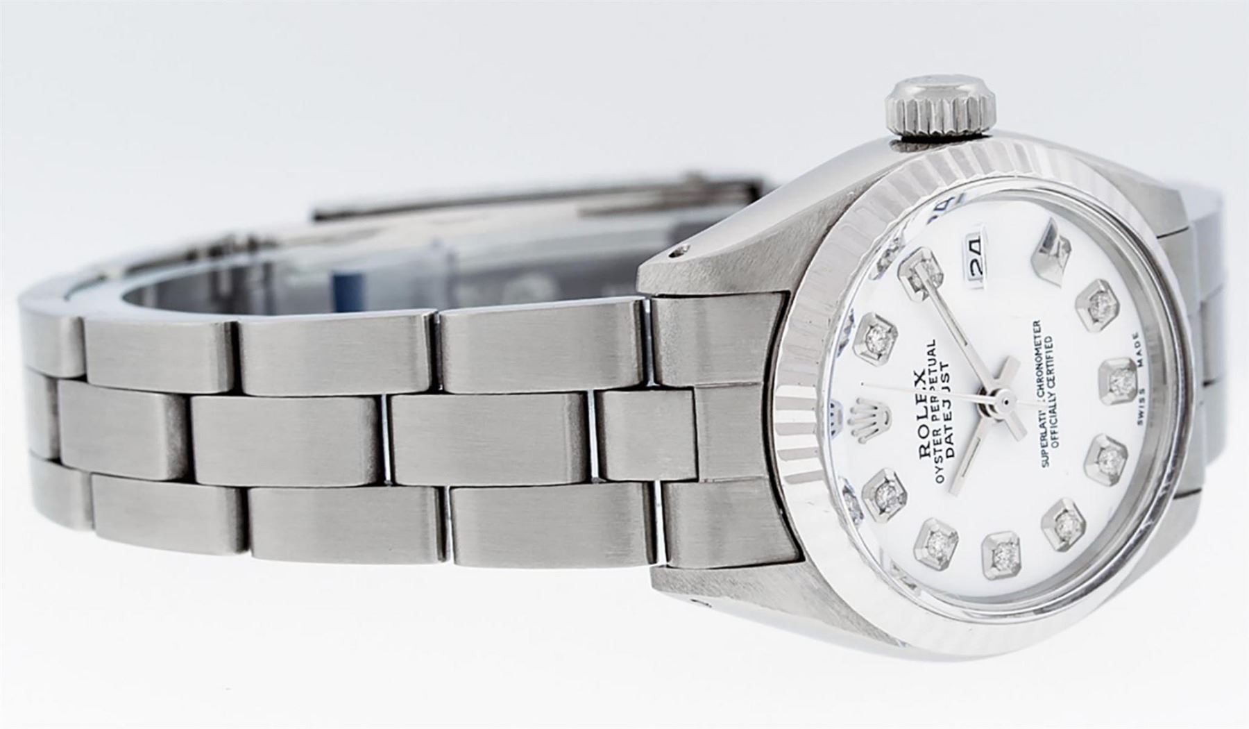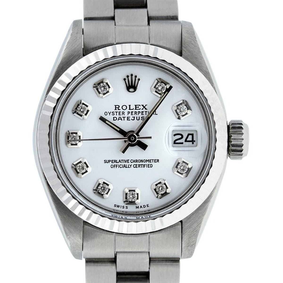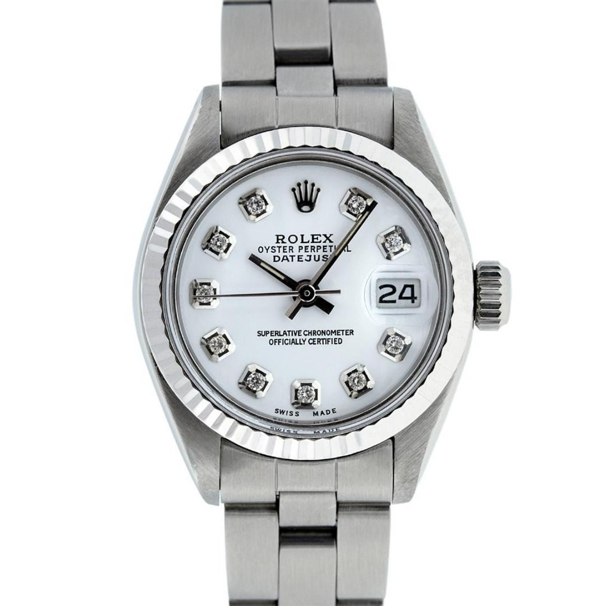 One Ladies Stainless Steel Rolex Datejust Polished Bright with Satin Finish, Serviced & Electronically Tested, Stainless Steel Case: 26mm, Stainless Steel Crown, Bezel: 14K White Gold Bezel. Custom Crystal: New Acrylic Cyclops Lens. Custom Hands: New Luminescent Hands. Movement: Automatic Winding Movement. Dial: White Diamond Dial, Diamond Count: 10 Diamonds In Dial, Color: G to H, Clarity: SI-VS. Date Window: 3 O'Clock Position Date Display, Model: Datejust. Condition: G-6 Extra Fine. Bracelet: Stainless Steel Oyster Band. Bright Polish & Satin Finish. 6.0 Inch Length, Adjustable. Standard Clasp, With Rolex Logo. This Watch Has Been Serviced Time Tested And Is In Excellent Condition It Is Free Of All Scratches And Dents.