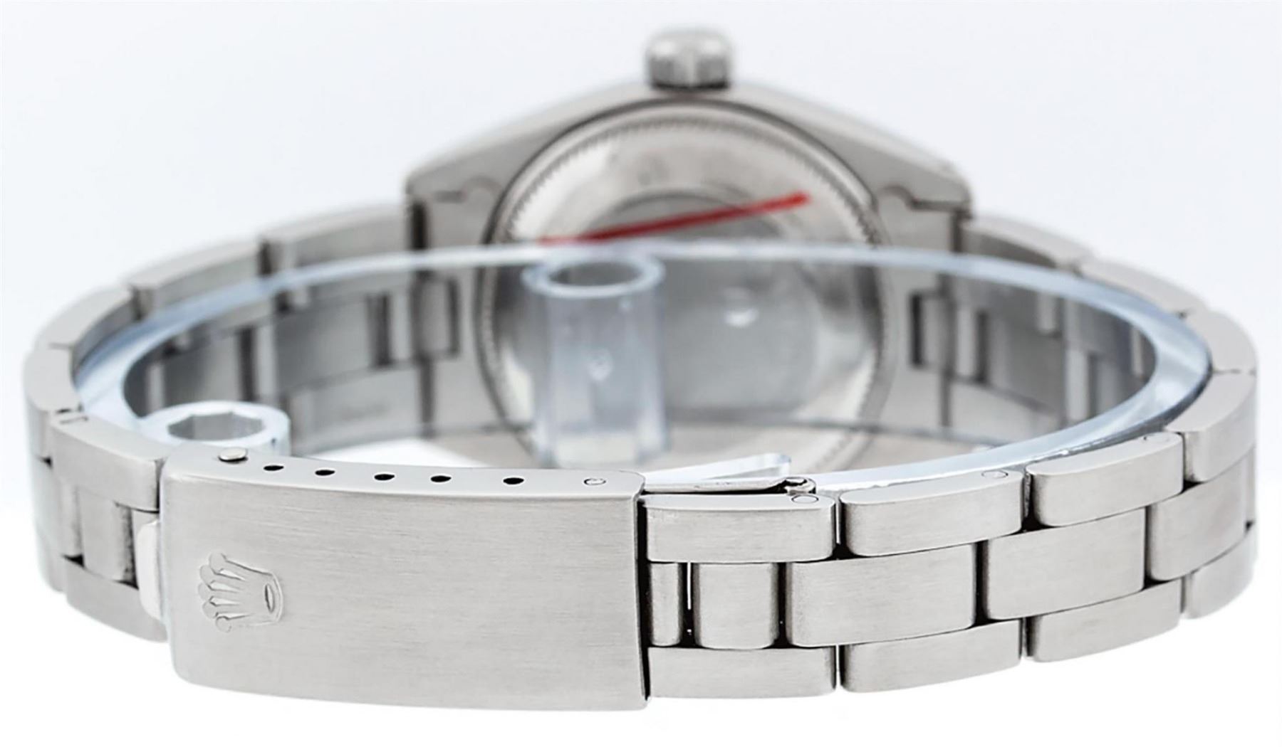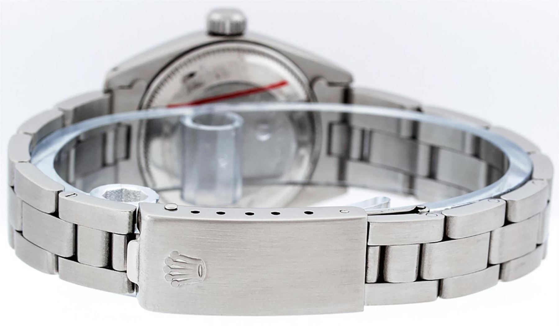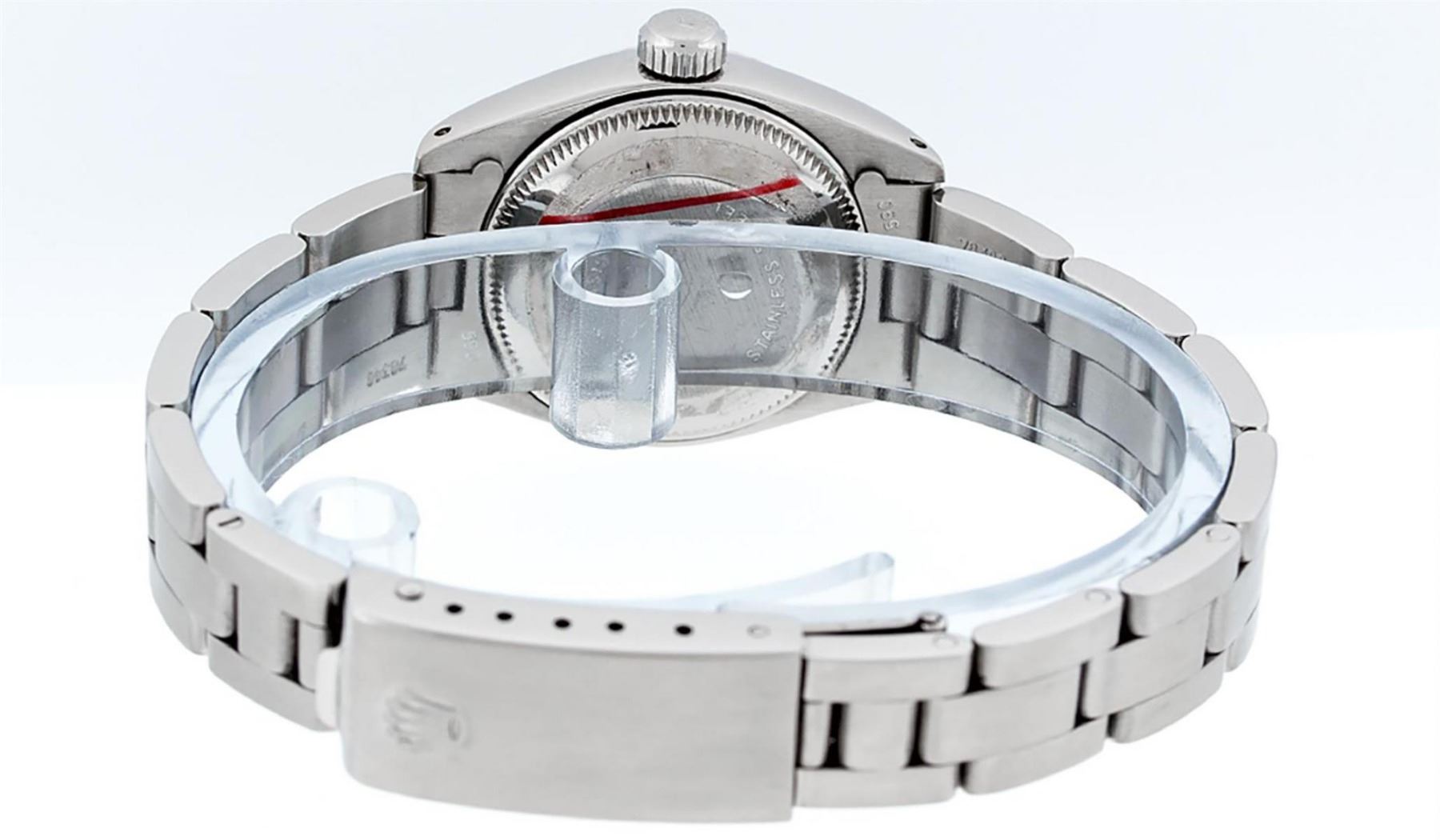One Ladies Stainless Steel Rolex Datejust Polished Bright with Satin Finish, Serviced & Electronically Tested, Stainless Steel Case: 26mm, Stainless Steel Crown, Bezel: 14K White Gold Bezel. Custom Crystal: New Acrylic Cyclops Lens. Custom Hands: New Luminescent Hands. Movement: Automatic Winding Movement. Dial: White Diamond Dial, Diamond Count: 10 Diamonds In Dial, Color: G to H, Clarity: SI-VS. Date Window: 3 O'Clock Position Date Display, Model: Datejust. Condition: G-6 Extra Fine. Bracelet: Stainless Steel Oyster Band. Bright Polish & Satin Finish. 6.0 Inch Length, Adjustable. Standard Clasp, With Rolex Logo. This Watch Has Been Serviced Time Tested And Is In Excellent Condition It Is Free Of All Scratches And Dents.