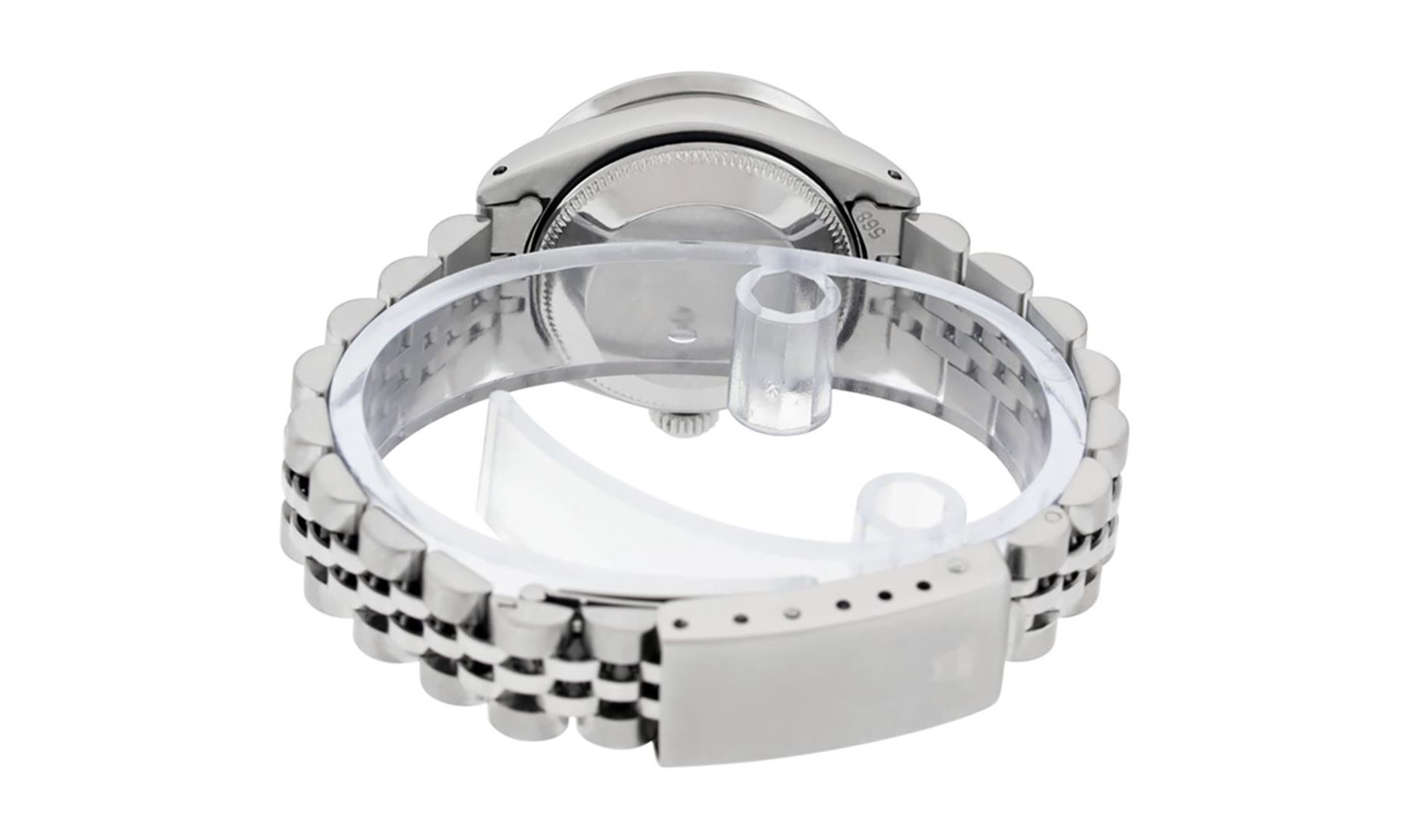 One Ladies Pre Owned Rolex Stainless Steel Wristwatch Polished Bright with Satin Finish, Serviced & Electronically Tested, Stainless Steel Case: 26mm, Stainless Steel Crown, Custom Bezel: New 18K White Gold Beadset Diamond Bezel, Diamond Count: 32 Diamonds. Custom Crystal: New Sapphire With Date Window. Custom Hands: New Luminescent Hands. Rolex Movement: Automatic Winding Movement 2035. Custom Dial: Custom White Dial With Added Diamonds, Diamond Count: 10 Diamonds On Dial. Date Window: 3 O'Clock Position Date Display, Model: Datejust. Condition: G-6 Extra Fine. Rolex Bracelet: Stainless Steel Jubilee Band. Bright Polish & Satin Finish. 6.0 Inch Length, Adjustable. Standard Clasp, With Rolex Logo. This Watch Has Been Serviced Time Tested And Is In Excellent Condition It Is Free Of All Scratches And Dents.