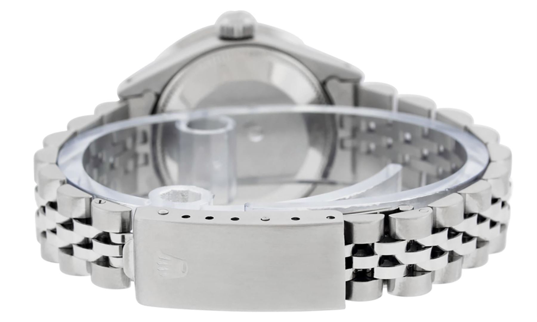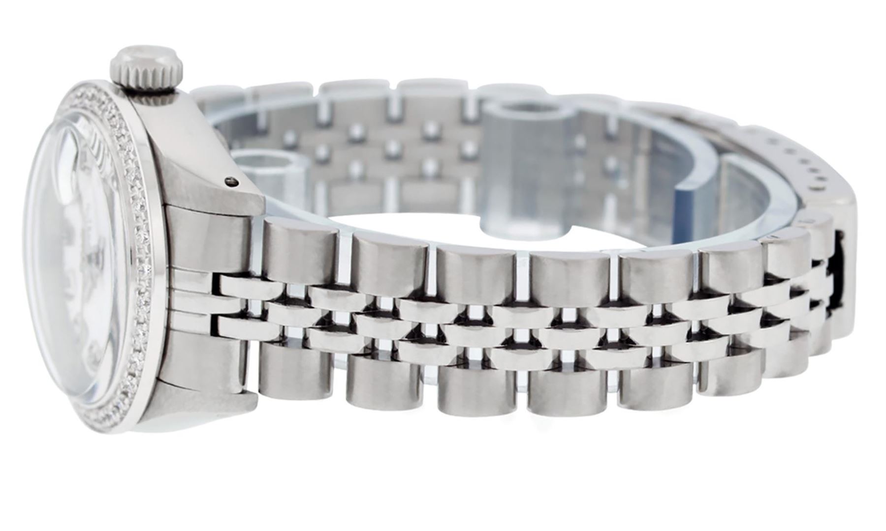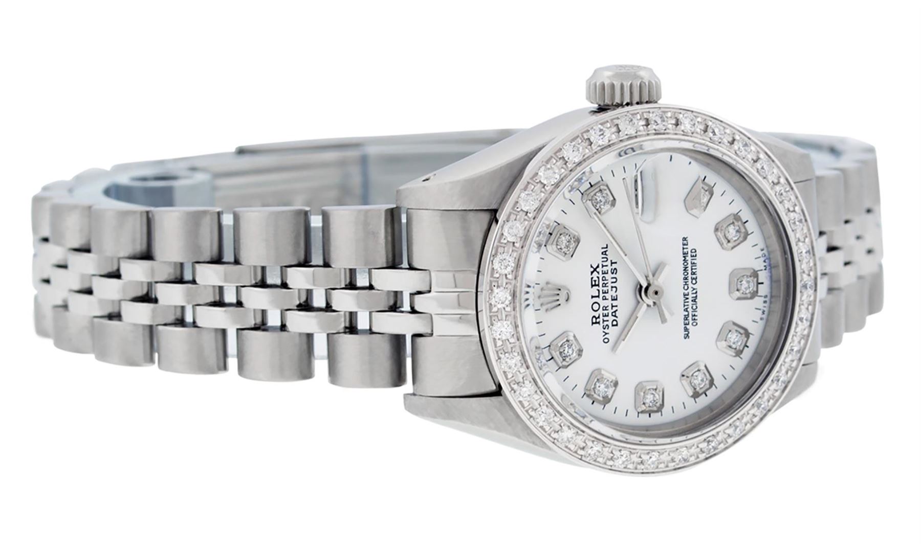 One Ladies Pre Owned Rolex Stainless Steel Wristwatch Polished Bright with Satin Finish, Serviced & Electronically Tested, Stainless Steel Case: 26mm, Stainless Steel Crown, Custom Bezel: New 18K White Gold Beadset Diamond Bezel, Diamond Count: 32 Diamonds. Custom Crystal: New Sapphire With Date Window. Custom Hands: New Luminescent Hands. Rolex Movement: Automatic Winding Movement 2035. Custom Dial: Custom White Dial With Added Diamonds, Diamond Count: 10 Diamonds On Dial. Date Window: 3 O'Clock Position Date Display, Model: Datejust. Condition: G-6 Extra Fine. Rolex Bracelet: Stainless Steel Jubilee Band. Bright Polish & Satin Finish. 6.0 Inch Length, Adjustable. Standard Clasp, With Rolex Logo. This Watch Has Been Serviced Time Tested And Is In Excellent Condition It Is Free Of All Scratches And Dents.