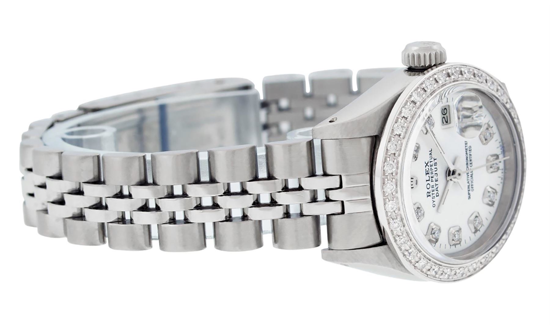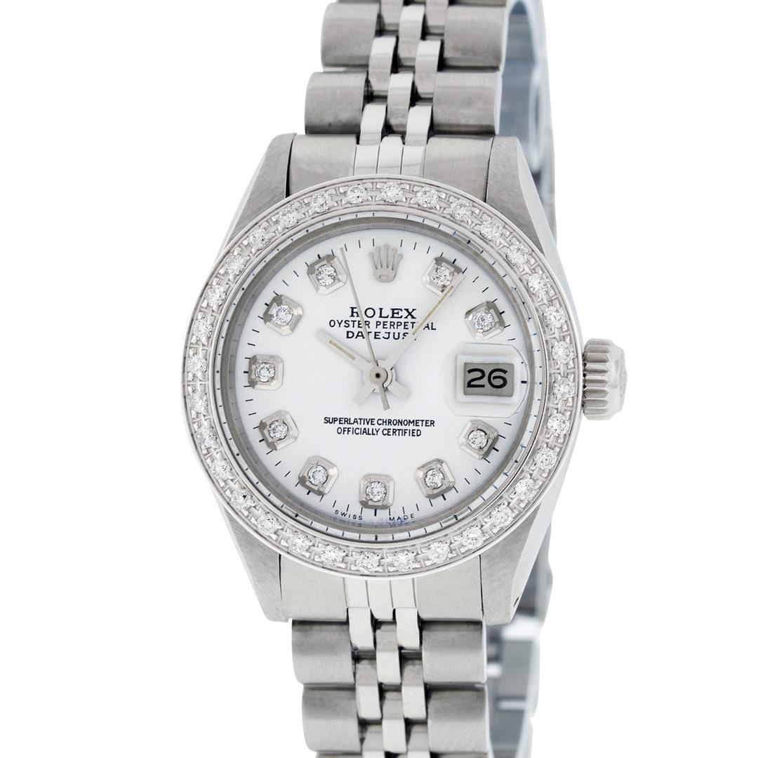 One Ladies Pre Owned Rolex Stainless Steel Wristwatch Polished Bright with Satin Finish, Serviced & Electronically Tested, Stainless Steel Case: 26mm, Stainless Steel Crown, Custom Bezel: New 18K White Gold Beadset Diamond Bezel, Diamond Count: 32 Diamonds. Custom Crystal: New Sapphire With Date Window. Custom Hands: New Luminescent Hands. Rolex Movement: Automatic Winding Movement 2035. Custom Dial: Custom White Dial With Added Diamonds, Diamond Count: 10 Diamonds On Dial. Date Window: 3 O'Clock Position Date Display, Model: Datejust. Condition: G-6 Extra Fine. Rolex Bracelet: Stainless Steel Jubilee Band. Bright Polish & Satin Finish. 6.0 Inch Length, Adjustable. Standard Clasp, With Rolex Logo. This Watch Has Been Serviced Time Tested And Is In Excellent Condition It Is Free Of All Scratches And Dents.