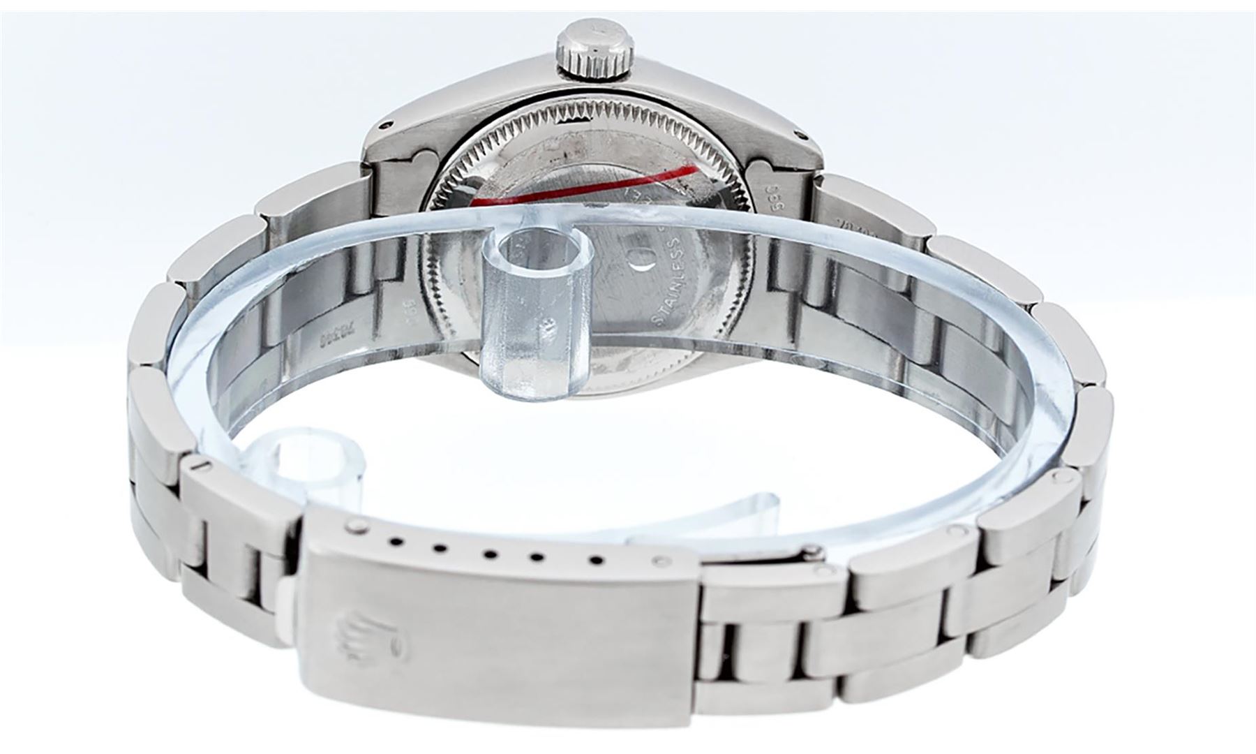 One Ladies Stainless Steel Rolex Wristwatch Polished Bright with Satin Finish, Serviced & Electronically Tested, Stainless Steel Case: 26mm, Stainless Steel Crown, Bezel: White Gold Bezel. Custom Crystal: New Sapphire With Magnified Date Window. Custom Hands: New Luminescent Hands. Rolex Movement: Automatic Winding Movement. Custom Dial: Custom White Dial With Added Diamond Hour Markers, Diamond Count: 10 Diamonds In Dial. Date Window: 3 O'Clock Position Date Display. Condition: G-6 Extra Fine. Rolex Bracelet: Stainless Steel Oyster Band. Bright Polish & Satin Finish. 6.0 Inch Length, Adjustable. Standard Clasp, With Rolex Logo. This Watch Has Been Serviced Time Tested And Is In Excellent Condition It Is Free Of All Scratches And Dents.