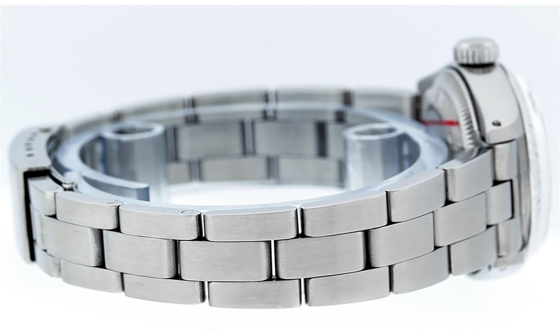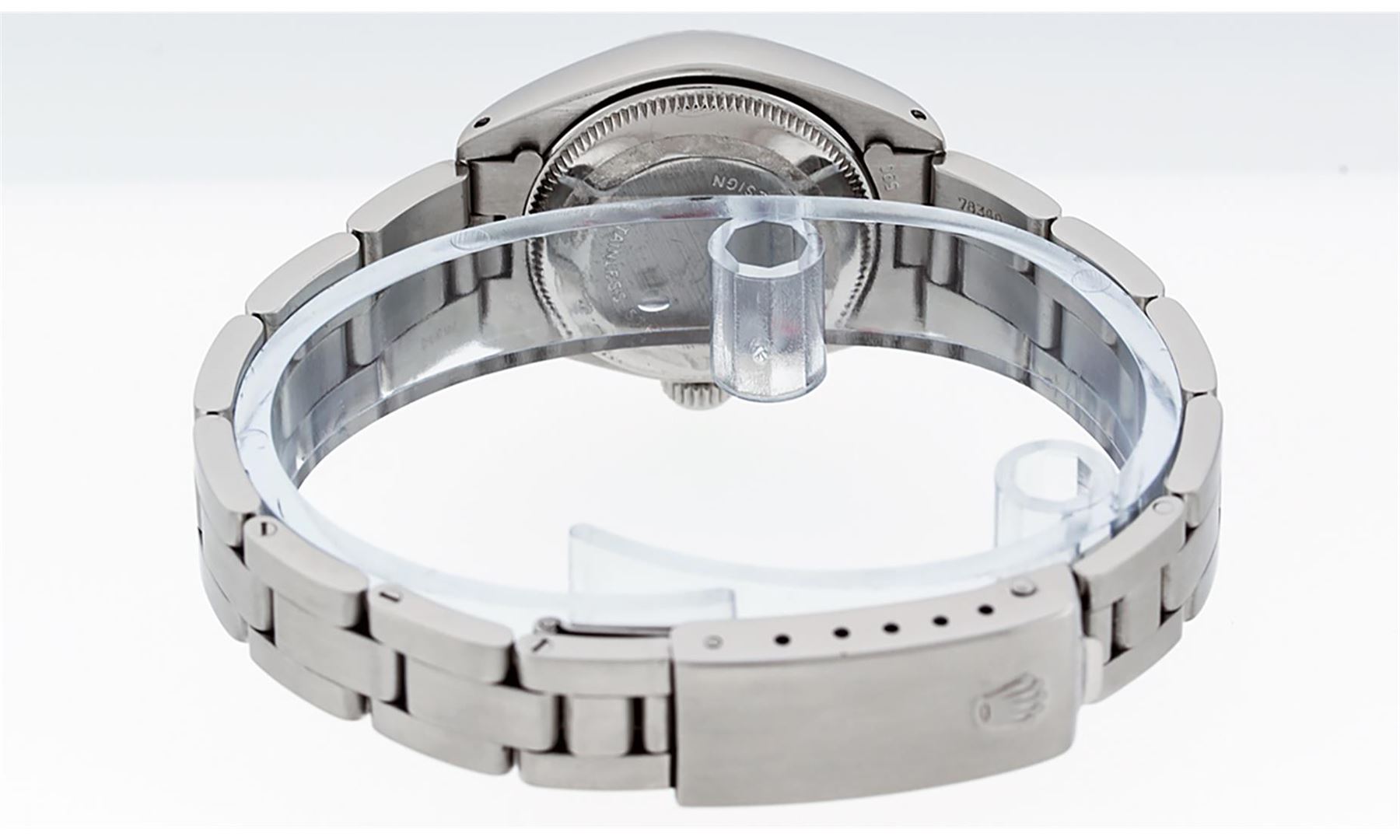 One Ladies Stainless Steel Rolex Wristwatch Polished Bright with Satin Finish, Serviced & Electronically Tested, Stainless Steel Case: 26mm, Stainless Steel Crown, Bezel: White Gold Bezel. Custom Crystal: New Sapphire With Magnified Date Window. Custom Hands: New Luminescent Hands. Rolex Movement: Automatic Winding Movement. Custom Dial: Custom White Dial With Added Diamond Hour Markers, Diamond Count: 10 Diamonds In Dial. Date Window: 3 O'Clock Position Date Display. Condition: G-6 Extra Fine. Rolex Bracelet: Stainless Steel Oyster Band. Bright Polish & Satin Finish. 6.0 Inch Length, Adjustable. Standard Clasp, With Rolex Logo. This Watch Has Been Serviced Time Tested And Is In Excellent Condition It Is Free Of All Scratches And Dents.