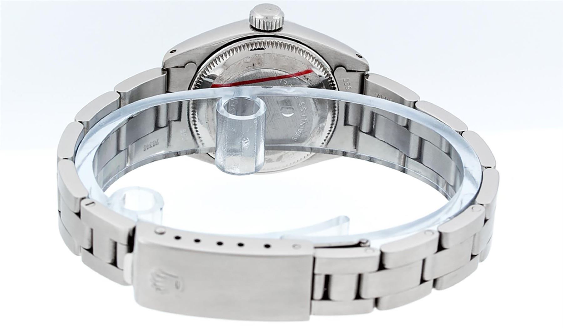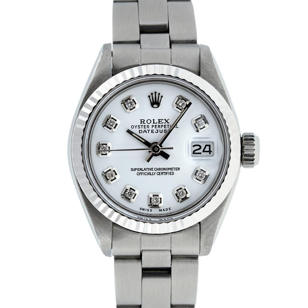 One Ladies Stainless Steel Rolex Wristwatch Polished Bright with Satin Finish, Serviced & Electronically Tested, Stainless Steel Case: 26mm, Stainless Steel Crown, Bezel: White Gold Bezel. Custom Crystal: New Sapphire With Magnified Date Window. Custom Hands: New Luminescent Hands. Rolex Movement: Automatic Winding Movement. Custom Dial: Custom White Dial With Added Diamond Hour Markers, Diamond Count: 10 Diamonds In Dial. Date Window: 3 O'Clock Position Date Display. Condition: G-6 Extra Fine. Rolex Bracelet: Stainless Steel Oyster Band. Bright Polish & Satin Finish. 6.0 Inch Length, Adjustable. Standard Clasp, With Rolex Logo. This Watch Has Been Serviced Time Tested And Is In Excellent Condition It Is Free Of All Scratches And Dents.