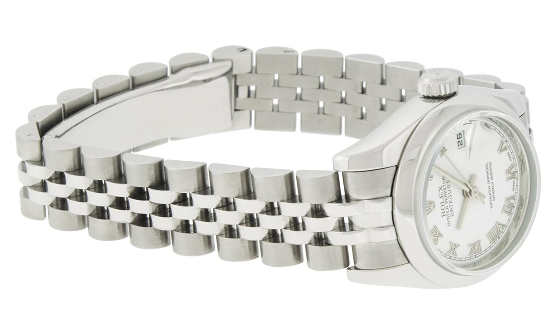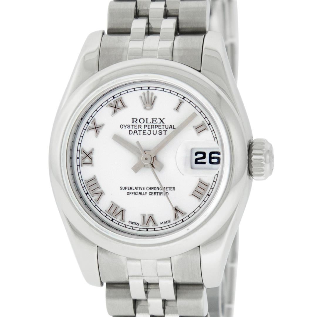 One Ladies Quickset Stainless Steel Rolex Datejust Polished Bright with Satin Finish, Serviced & Electronically Tested, Stainless Steel Case: 26mm, Stainless Steel Crown, Bezel: Stainless Steel Smooth Bezel. Custom Crystal: New Scratch Resistant Sapphire Cyclops Lens. Custom Hands: New Luminescent Hands. Movement: Automatic Winding Movement. Custom Dial: White Roman Dial With Square Track, Color: G to H, Clarity: VS. Date Window: 3 O'Clock Position Date Display, Model: 179160 Quickset Datejust Caliber 2230. Condition: G-6 Extra Fine. Bracelet: Stainless Steel Jubilee Band. Bright Polish & Satin Finish. 6.0 Inch Length, Adjustable. Standard Clasp, With Rolex Logo. This Watch Has Been Serviced Time Tested And Is In Excellent Condition It Is Free Of All Scratches And Dents. This Watch Comes With A Rolex Box.