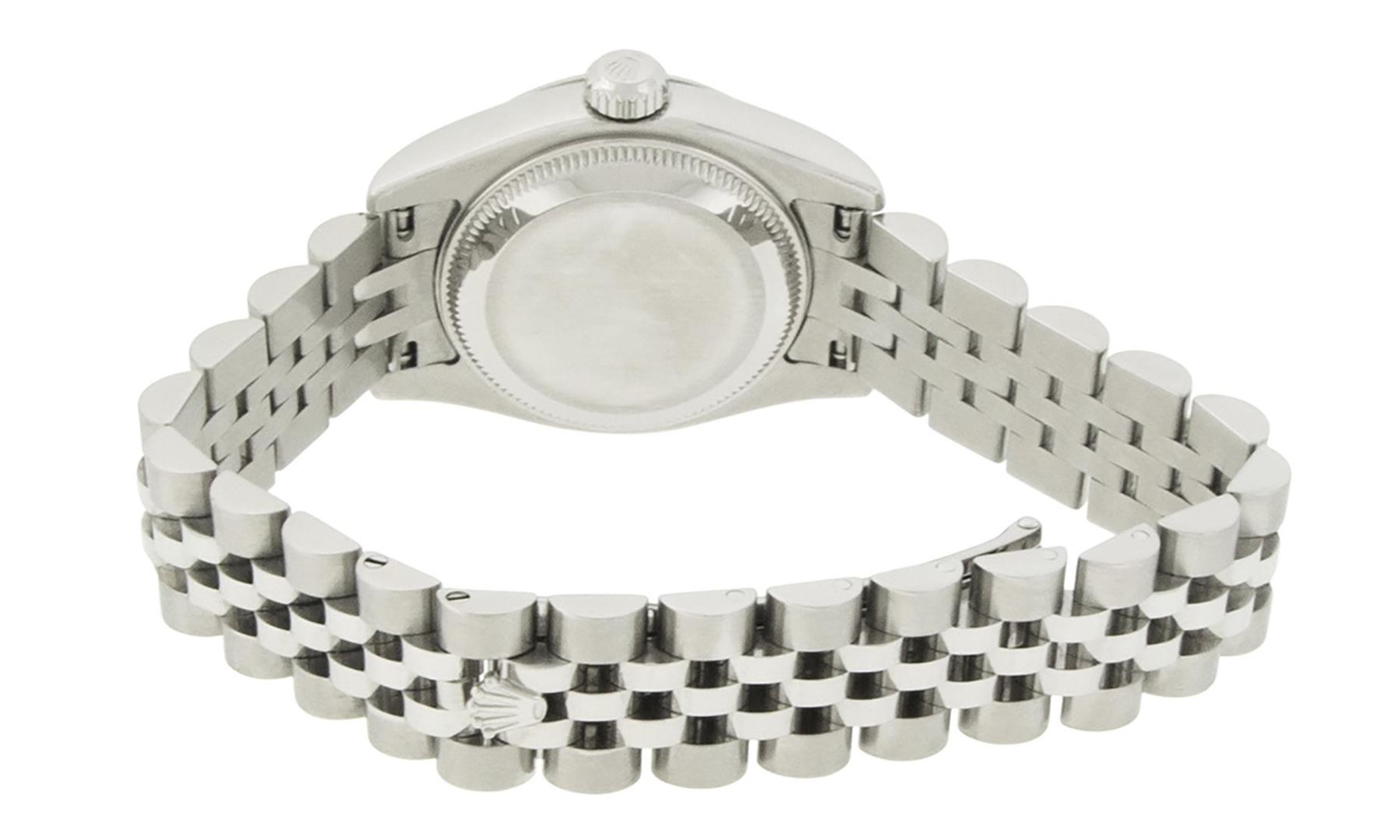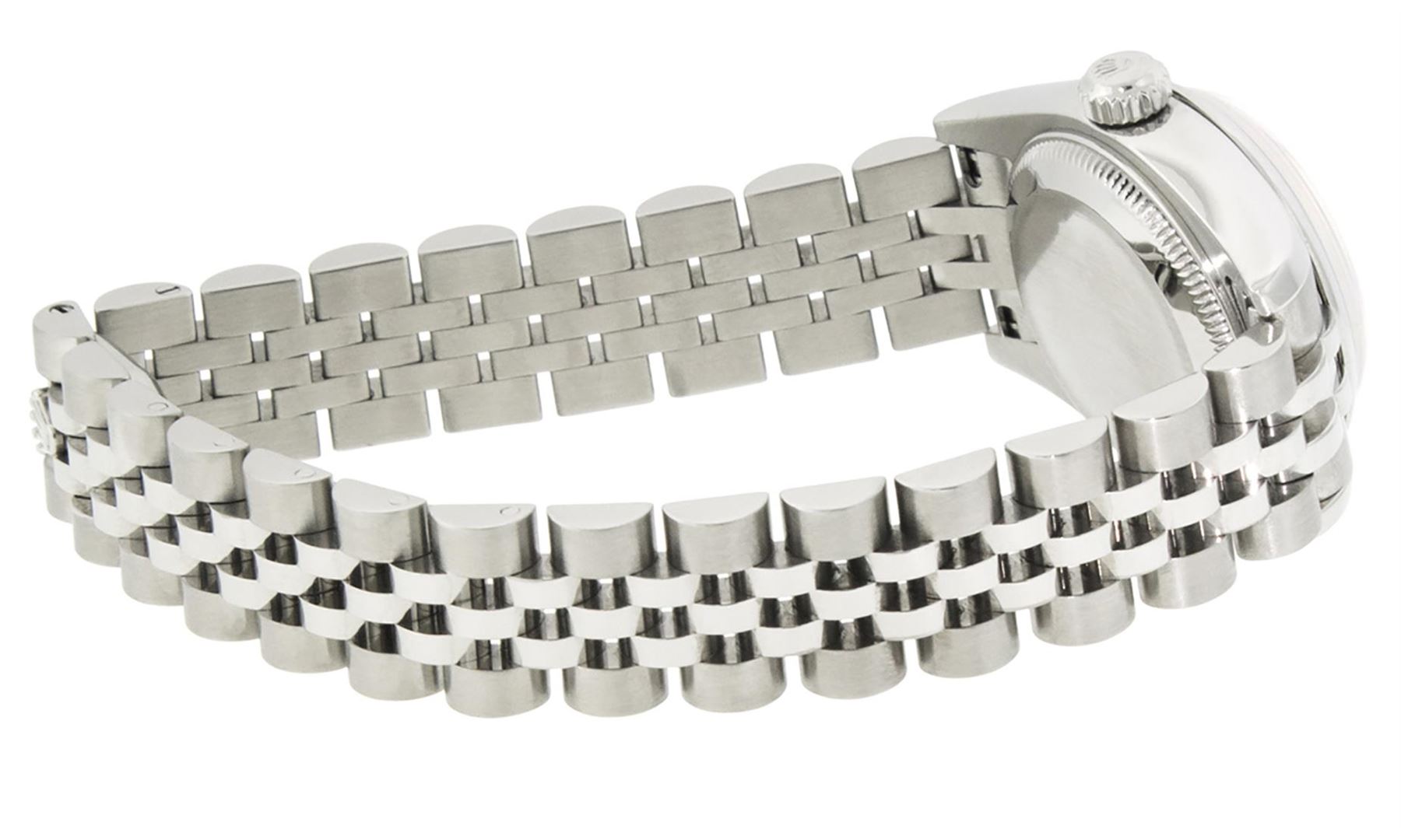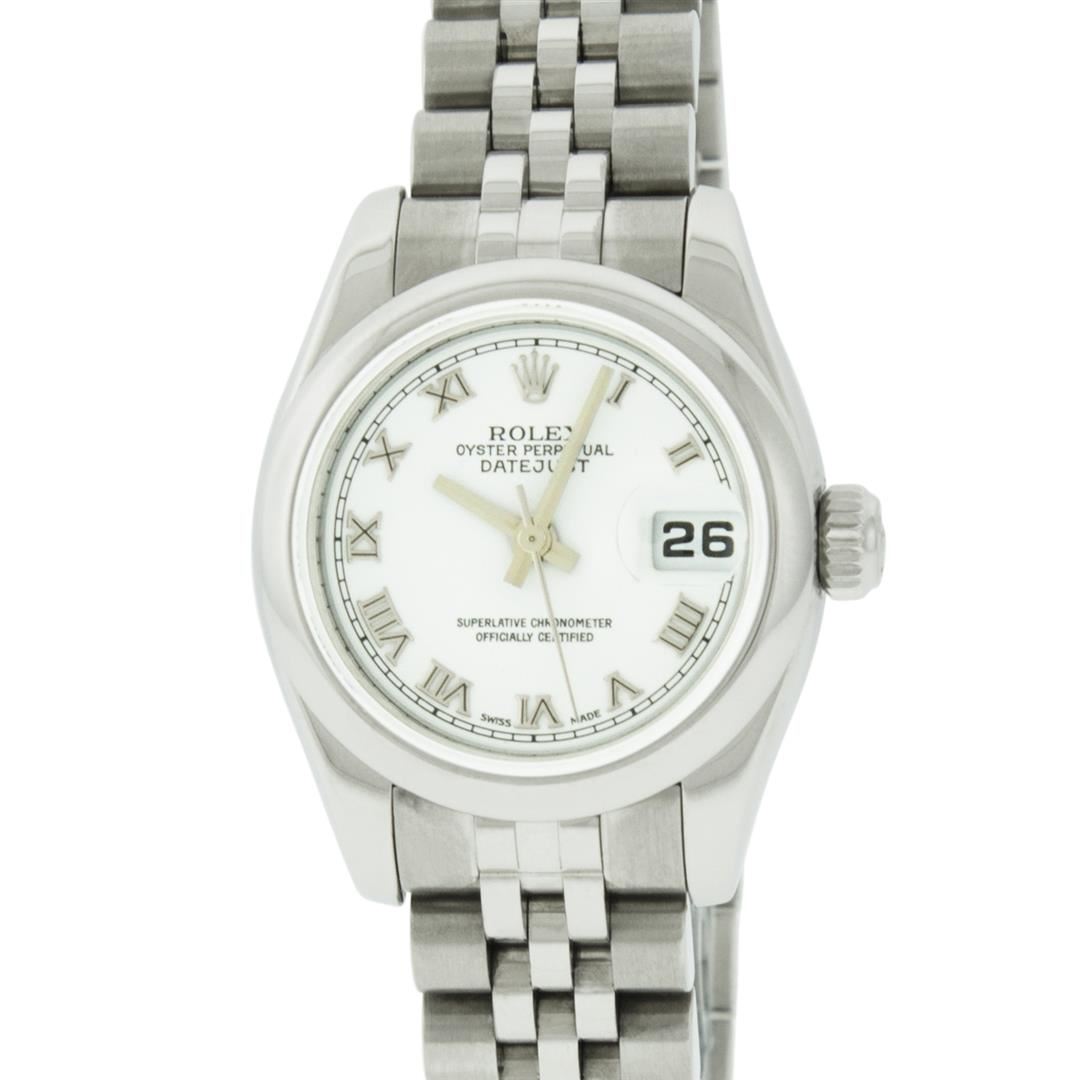 One Ladies Quickset Stainless Steel Rolex Datejust Polished Bright with Satin Finish, Serviced & Electronically Tested, Stainless Steel Case: 26mm, Stainless Steel Crown, Bezel: Stainless Steel Smooth Bezel. Custom Crystal: New Scratch Resistant Sapphire Cyclops Lens. Custom Hands: New Luminescent Hands. Movement: Automatic Winding Movement. Custom Dial: White Roman Dial With Square Track, Color: G to H, Clarity: VS. Date Window: 3 O'Clock Position Date Display, Model: 179160 Quickset Datejust Caliber 2230. Condition: G-6 Extra Fine. Bracelet: Stainless Steel Jubilee Band. Bright Polish & Satin Finish. 6.0 Inch Length, Adjustable. Standard Clasp, With Rolex Logo. This Watch Has Been Serviced Time Tested And Is In Excellent Condition It Is Free Of All Scratches And Dents. This Watch Comes With A Rolex Box.