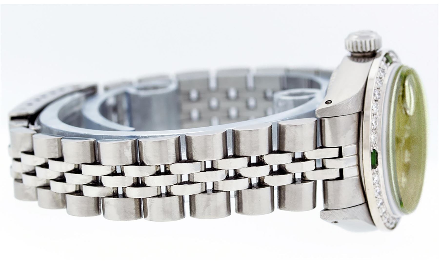 One Ladies Stainless Steel Rolex Datejust Polished Bright with Satin Finish, Serviced & Electronically Tested, Stainless Steel Case: 26mm, Stainless Steel Crown, Custom Bezel: New 18K White Gold Emerald Beadset Diamond Bezel, Diamond + Gem Count: 28 Diamonds + 4 Emeralds. Total Weight .70 Carat, Clarity: SI-VS, Color: G to H. Custom Crystal: New Scratch Resistant Synthetic Sapphire Cyclops Lens. Custom Hands: New Luminescent Hands. Movement: Automatic Winding Movement. Custom Dial: Refinished Yellow With Diamond Hour Markers & Dash Tracks, 10 Diamonds in Dial, G To H In Color, Clarity: SI-VS. Date Window: 3 O'Clock Position Date Display, Model: Datejust. Condition: G-6 Extra Fine. Bracelet: Stainless Steel Jubilee Band. Bright Polish & Satin Finish. 6.0 Inch Length, Adjustable. Standard Clasp, With Rolex Logo. This Watch Has Been Serviced Time Tested And Is In Excellent Condition It Is Free Of All Scratches And Dents.