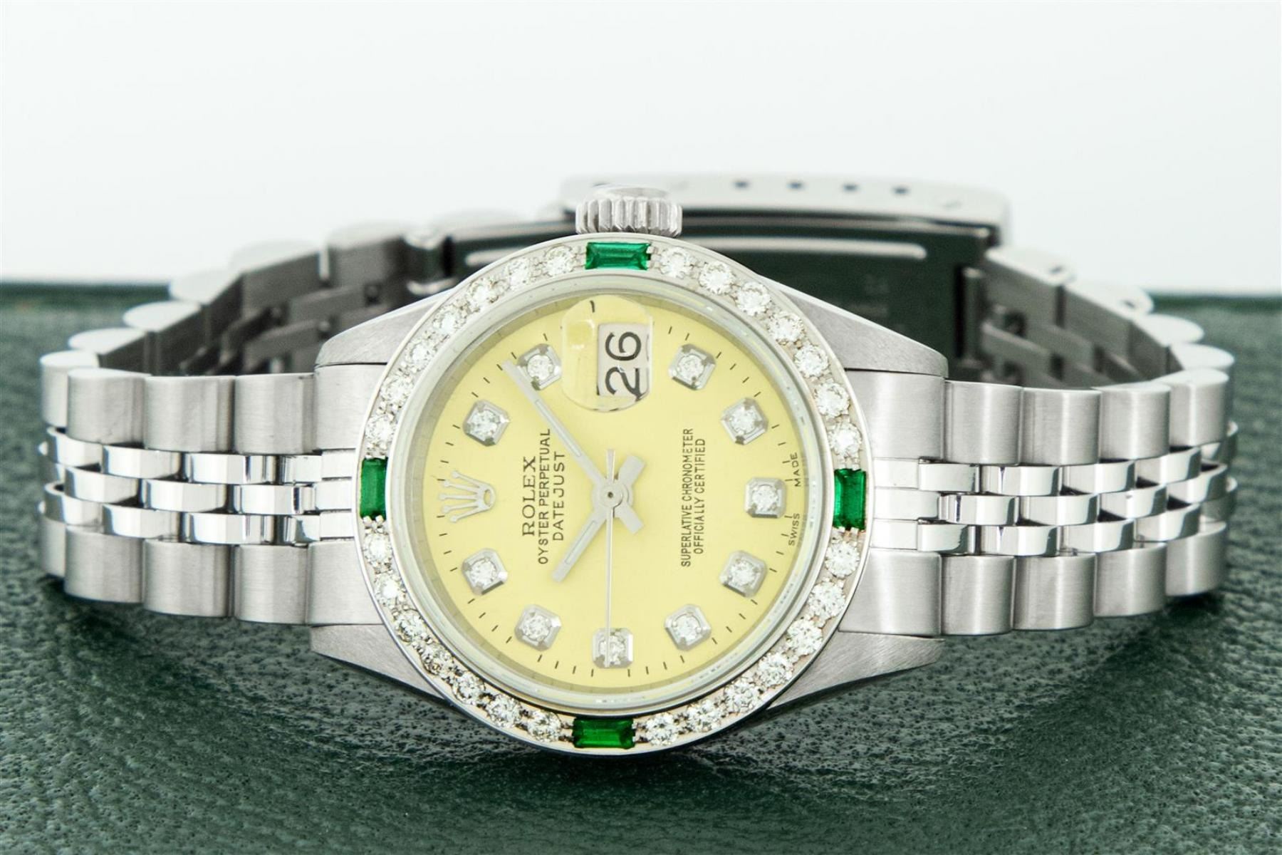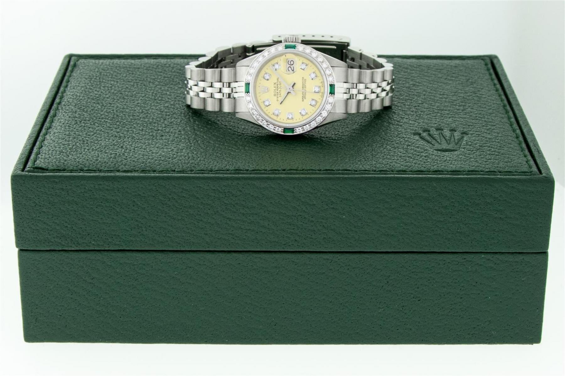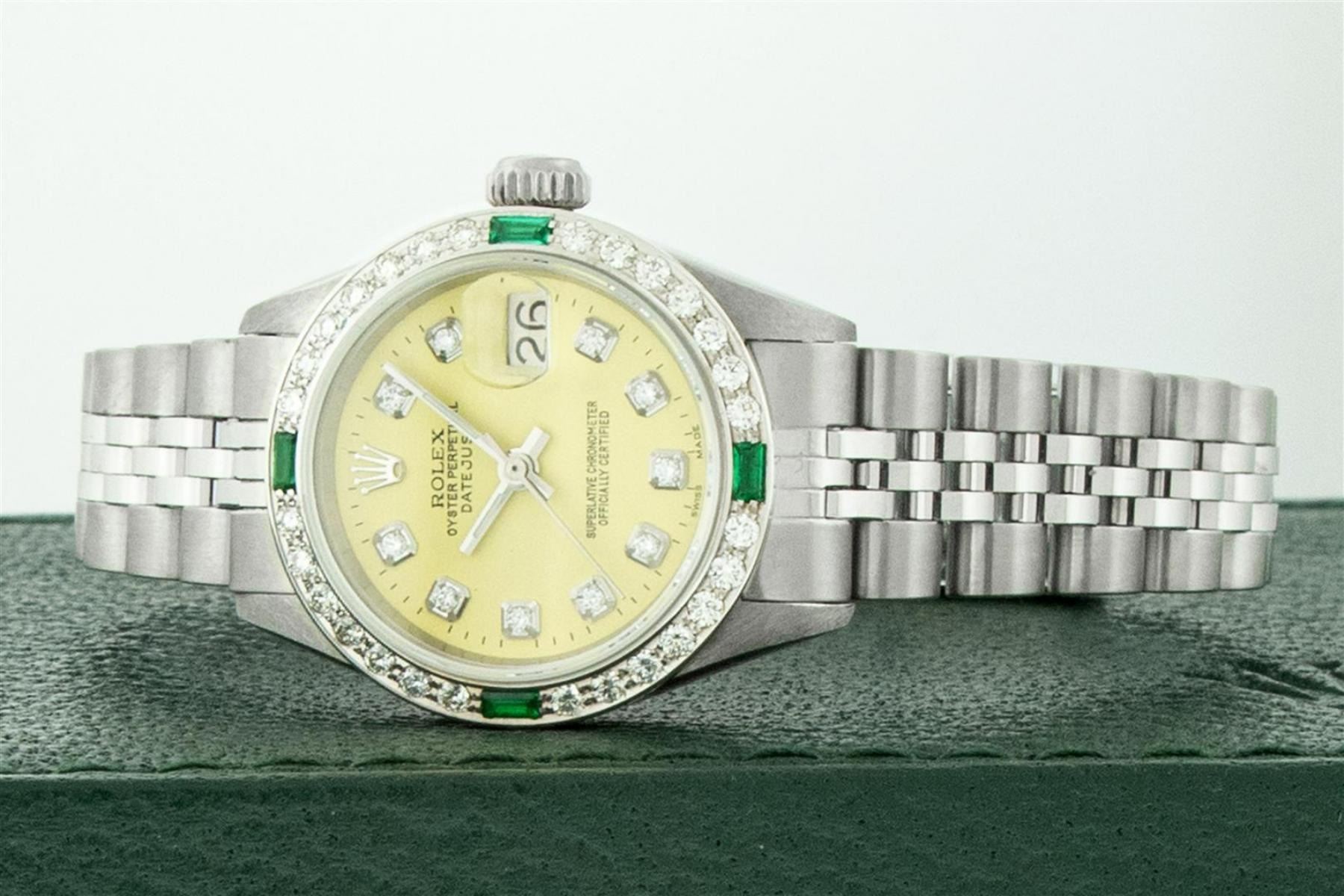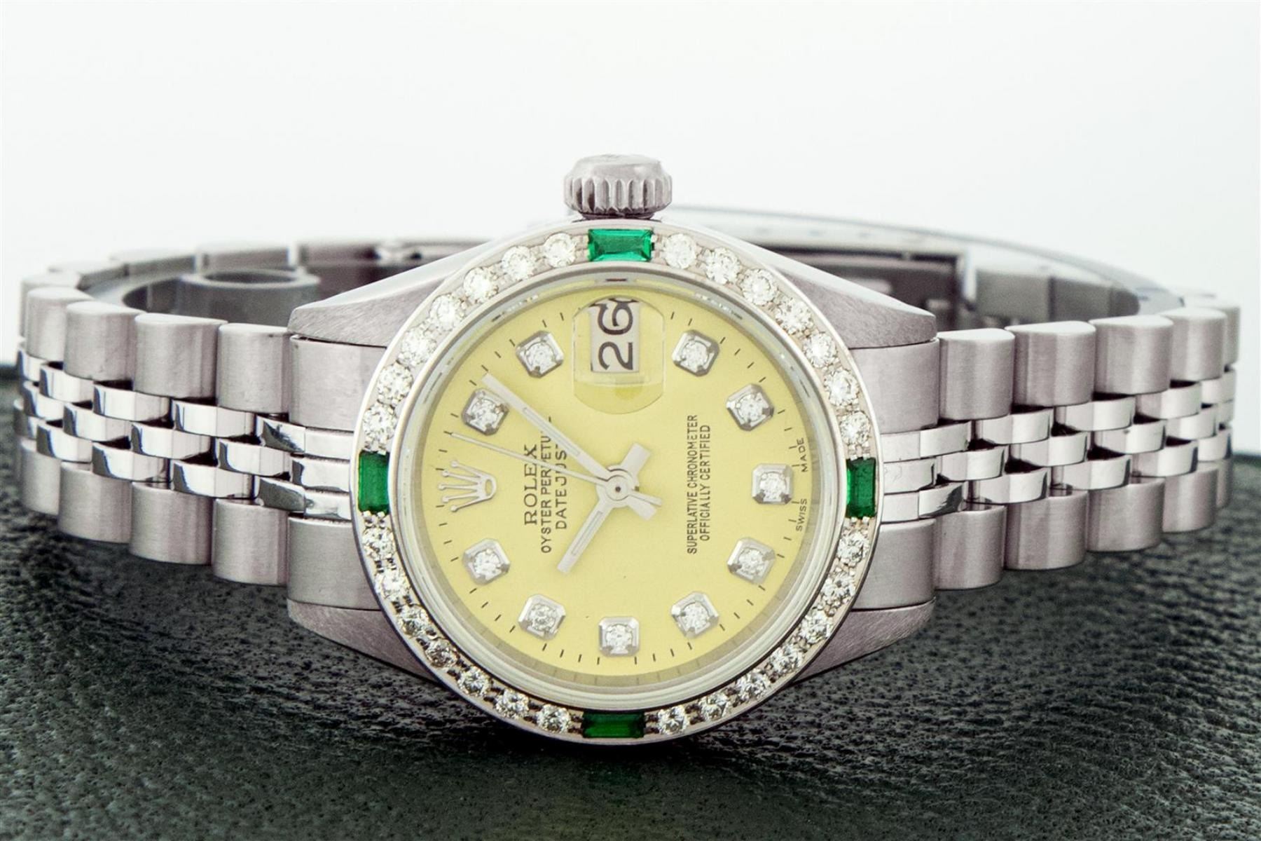 One Ladies Stainless Steel Rolex Datejust Polished Bright with Satin Finish, Serviced & Electronically Tested, Stainless Steel Case: 26mm, Stainless Steel Crown, Custom Bezel: New 18K White Gold Emerald Beadset Diamond Bezel, Diamond + Gem Count: 28 Diamonds + 4 Emeralds. Total Weight .70 Carat, Clarity: SI-VS, Color: G to H. Custom Crystal: New Scratch Resistant Synthetic Sapphire Cyclops Lens. Custom Hands: New Luminescent Hands. Movement: Automatic Winding Movement. Custom Dial: Refinished Yellow With Diamond Hour Markers & Dash Tracks, 10 Diamonds in Dial, G To H In Color, Clarity: SI-VS. Date Window: 3 O'Clock Position Date Display, Model: Datejust. Condition: G-6 Extra Fine. Bracelet: Stainless Steel Jubilee Band. Bright Polish & Satin Finish. 6.0 Inch Length, Adjustable. Standard Clasp, With Rolex Logo. This Watch Has Been Serviced Time Tested And Is In Excellent Condition It Is Free Of All Scratches And Dents. This Watch Comes With A Rolex Box.