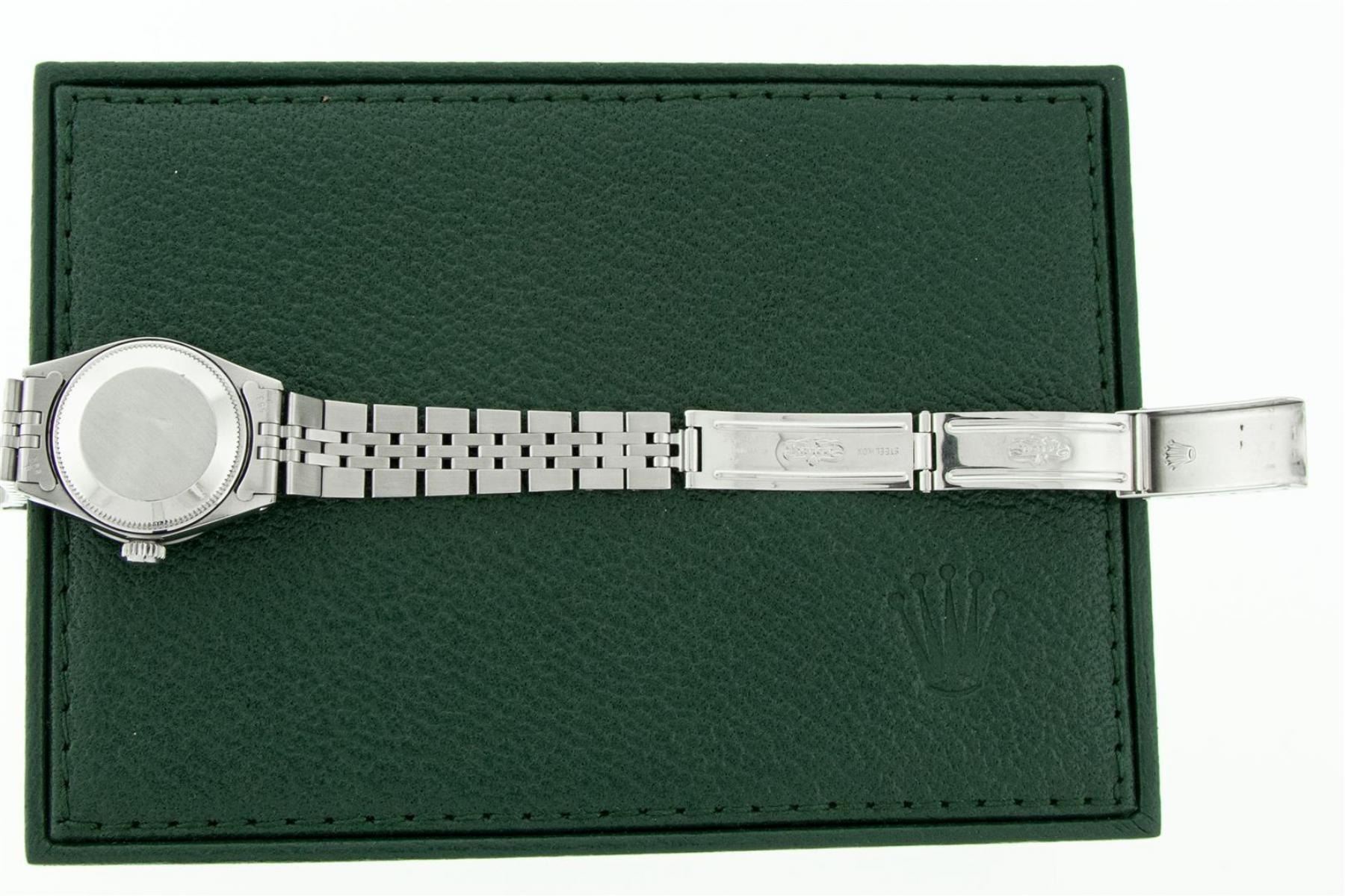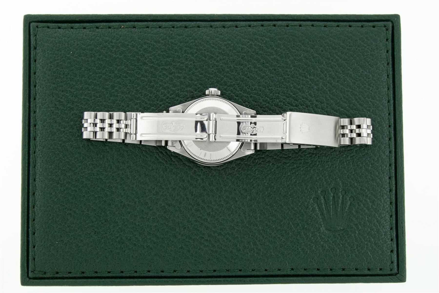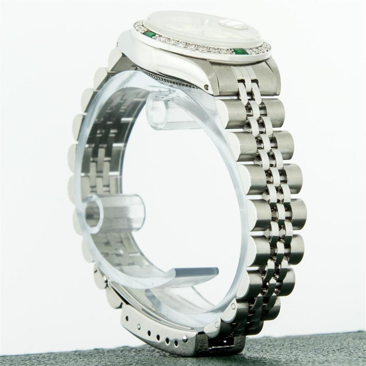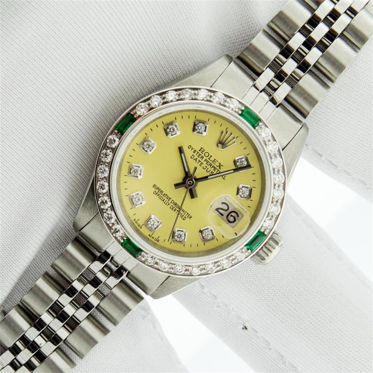 One Ladies Stainless Steel Rolex Datejust Polished Bright with Satin Finish, Serviced & Electronically Tested, Stainless Steel Case: 26mm, Stainless Steel Crown, Custom Bezel: New 18K White Gold Emerald Beadset Diamond Bezel, Diamond + Gem Count: 28 Diamonds + 4 Emeralds. Total Weight .70 Carat, Clarity: SI-VS, Color: G to H. Custom Crystal: New Scratch Resistant Synthetic Sapphire Cyclops Lens. Custom Hands: New Luminescent Hands. Movement: Automatic Winding Movement. Custom Dial: Refinished Yellow With Diamond Hour Markers & Dash Tracks, 10 Diamonds in Dial, G To H In Color, Clarity: SI-VS. Date Window: 3 O'Clock Position Date Display, Model: Datejust. Condition: G-6 Extra Fine. Bracelet: Stainless Steel Jubilee Band. Bright Polish & Satin Finish. 6.0 Inch Length, Adjustable. Standard Clasp, With Rolex Logo. This Watch Has Been Serviced Time Tested And Is In Excellent Condition It Is Free Of All Scratches And Dents. This Watch Comes With A Rolex Box.