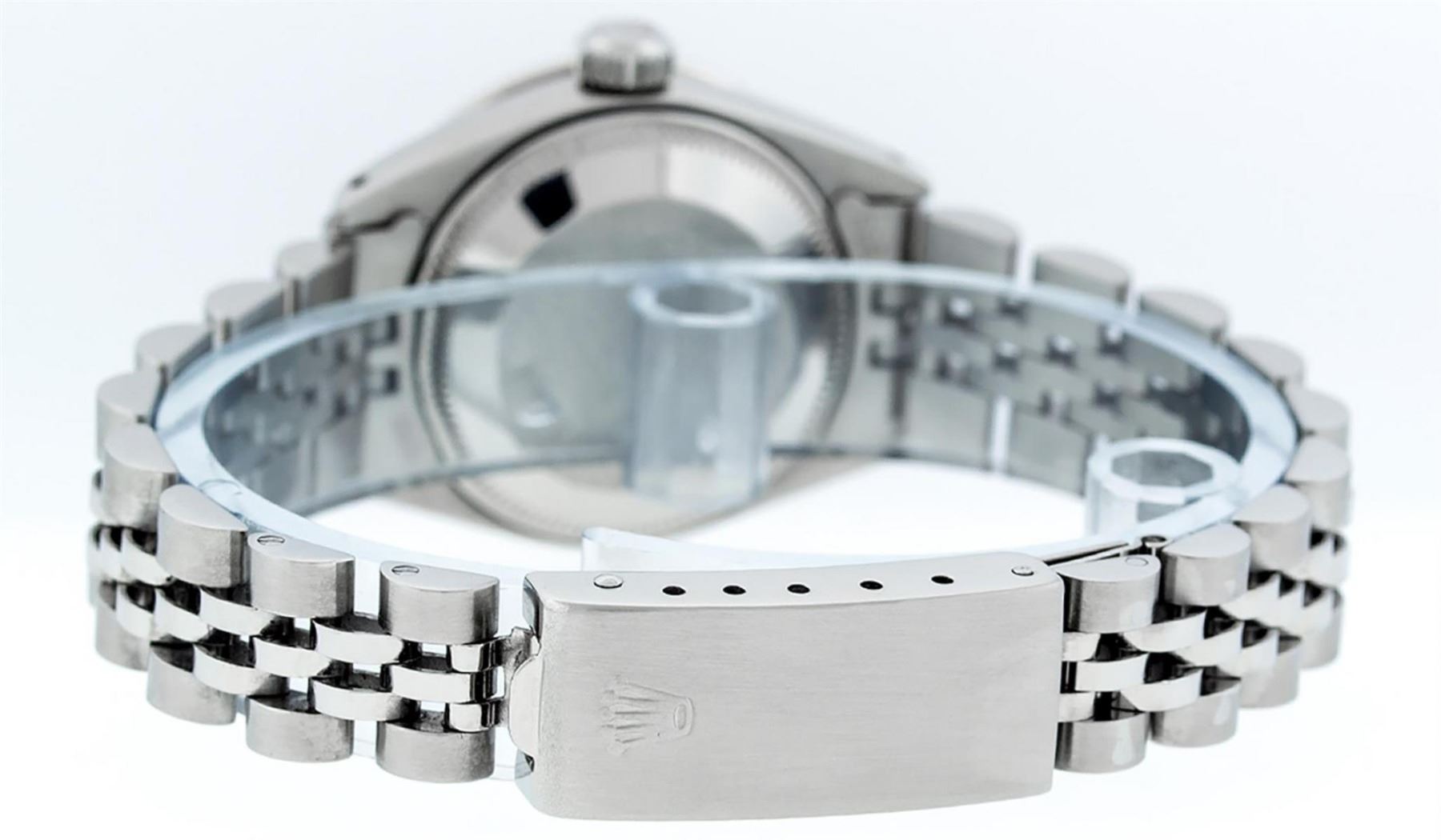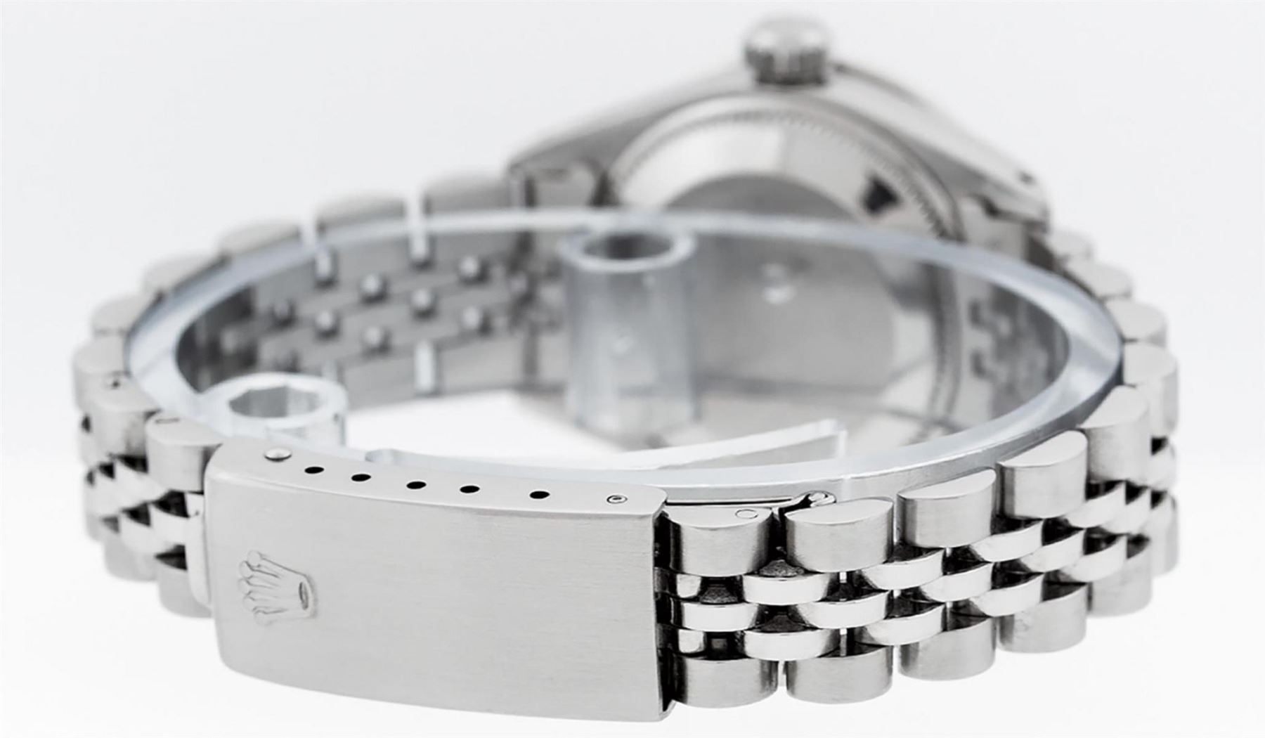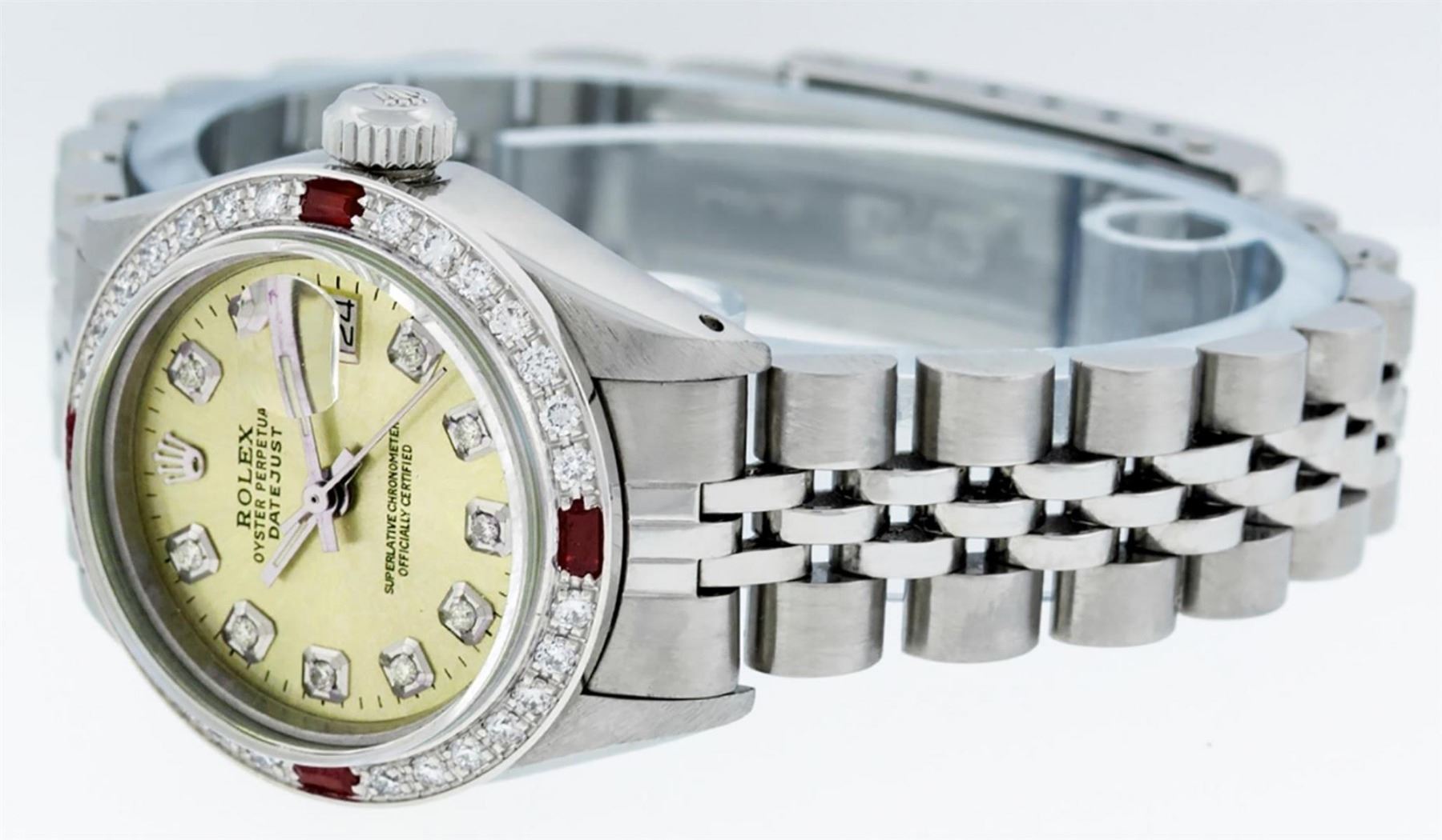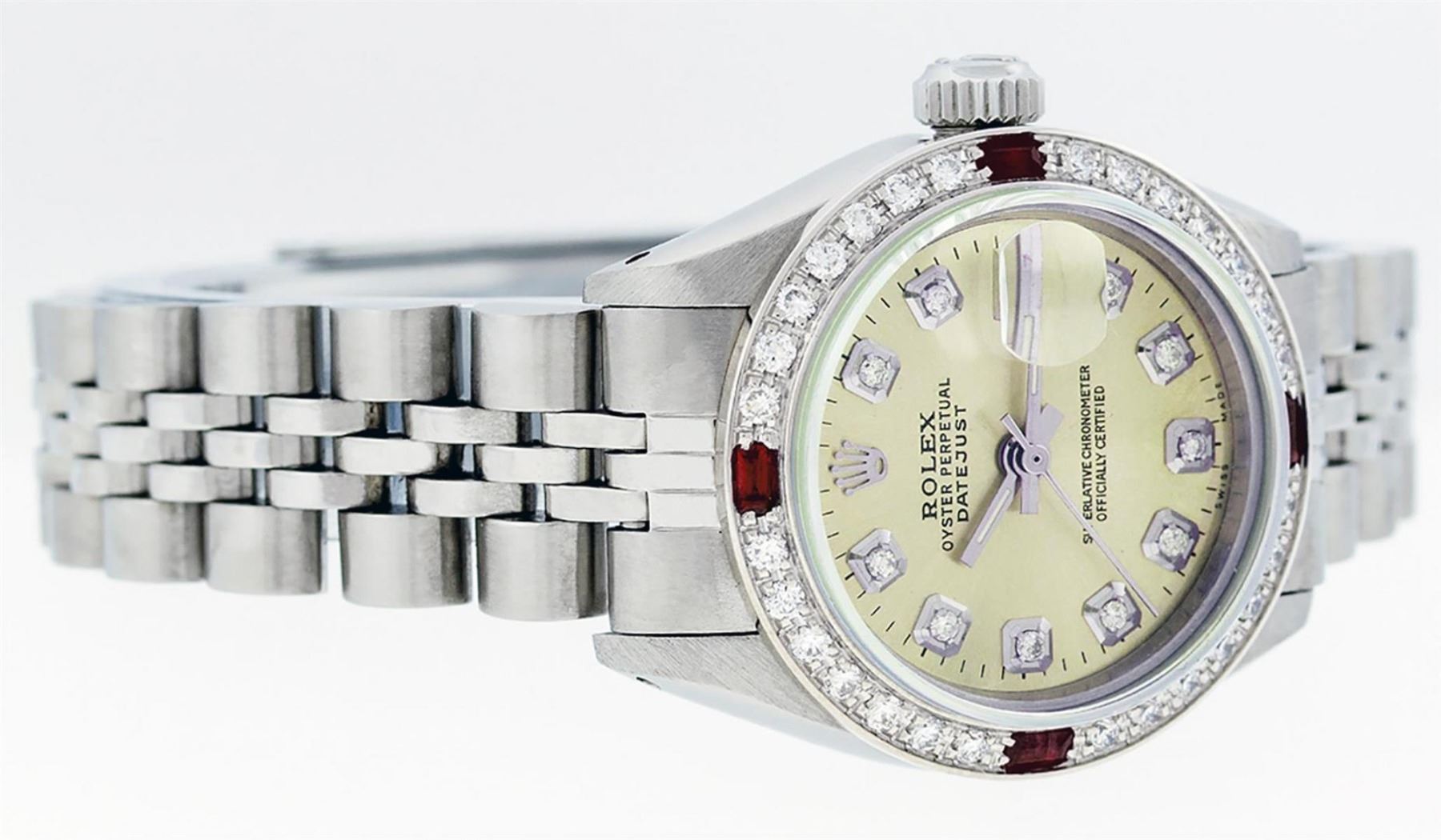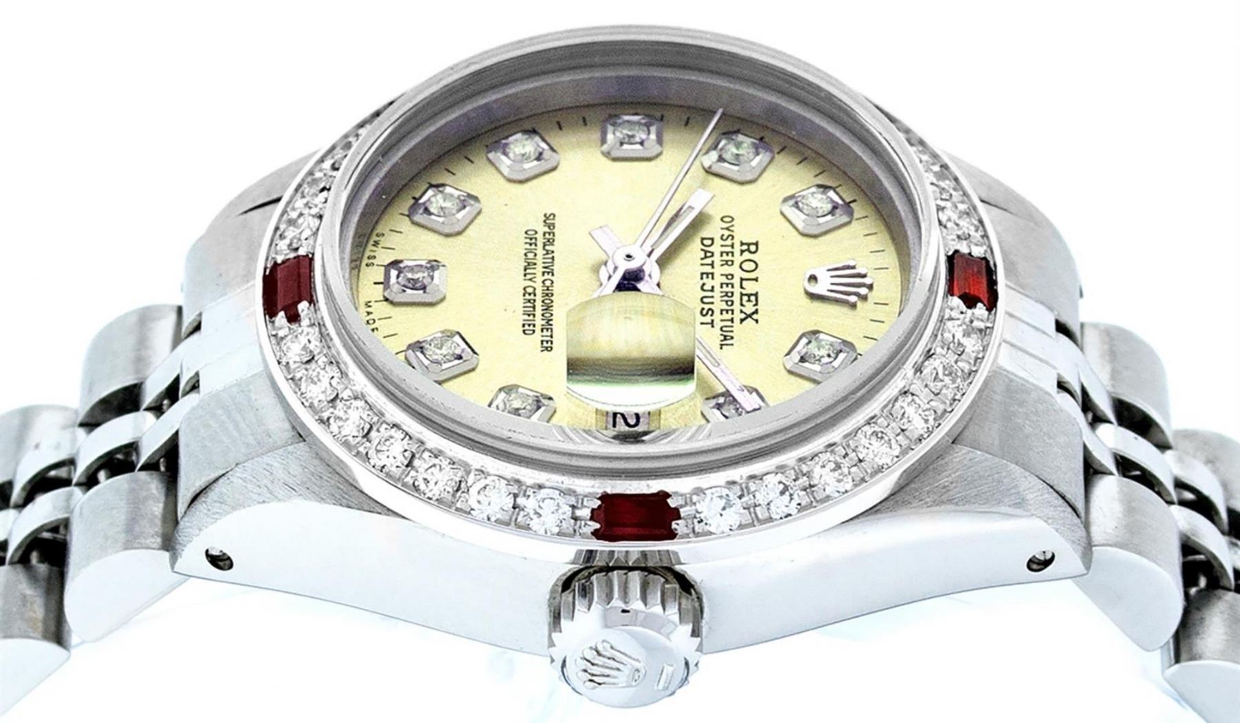 One Ladies Stainless Steel Rolex Datejust Polished Bright with Satin Finish, Serviced & Electronically Tested, Stainless Steel Case: 26mm, Stainless Steel Crown, Custom Bezel: New 18K White Gold Ruby Beadset Diamond Bezel, Diamond + Gem Count:  28 Diamonds + 4 Rubies. Total Weight .70 Carat, Clarity: SI-VS, Color: G to H. Custom Crystal: New Scratch Resistant Synthetic Sapphire Cyclops Lens. Custom Hands: New Luminescent Hands. Movement: Automatic Winding Movement Caliber 2030. Custom Dial: Refinished Yellow With Diamond Hour Markers & Dash Tracks, 10 Diamonds in Dial, G To H In Color, Clarity: SI-VS. Date Window: 3 O'Clock Position Date Display, Model: Datejust. Condition: G-6 Extra Fine. Bracelet: Stainless Steel Jubilee Band. Bright Polish & Satin Finish. 6.0 Inch Length, Adjustable. Standard Clasp, With Rolex Logo. This Watch Has Been Serviced Time Tested And Is In Excellent Condition It Is Free Of All Scratches And Dents.