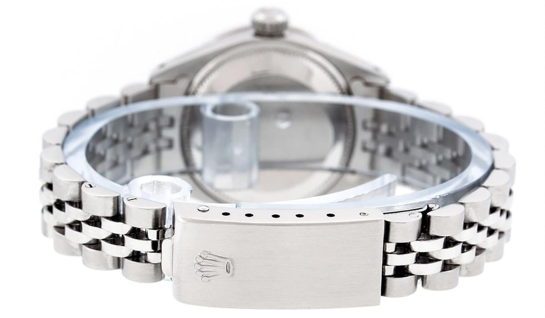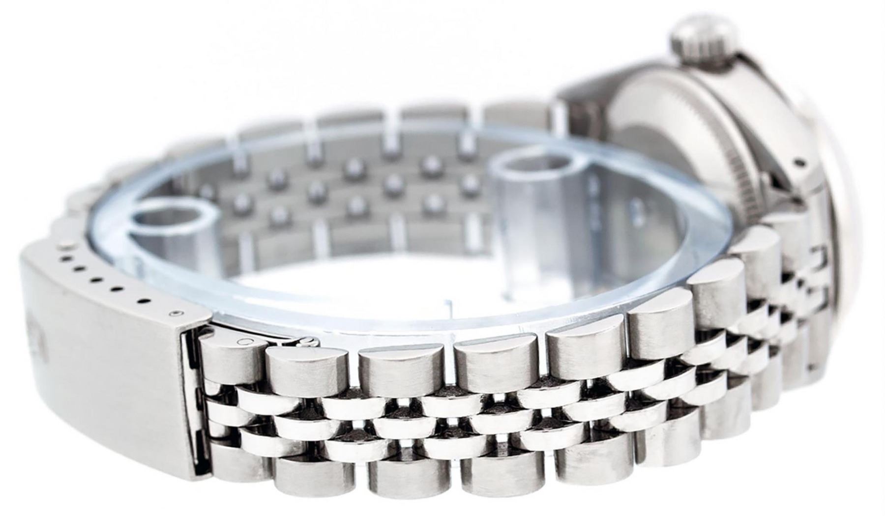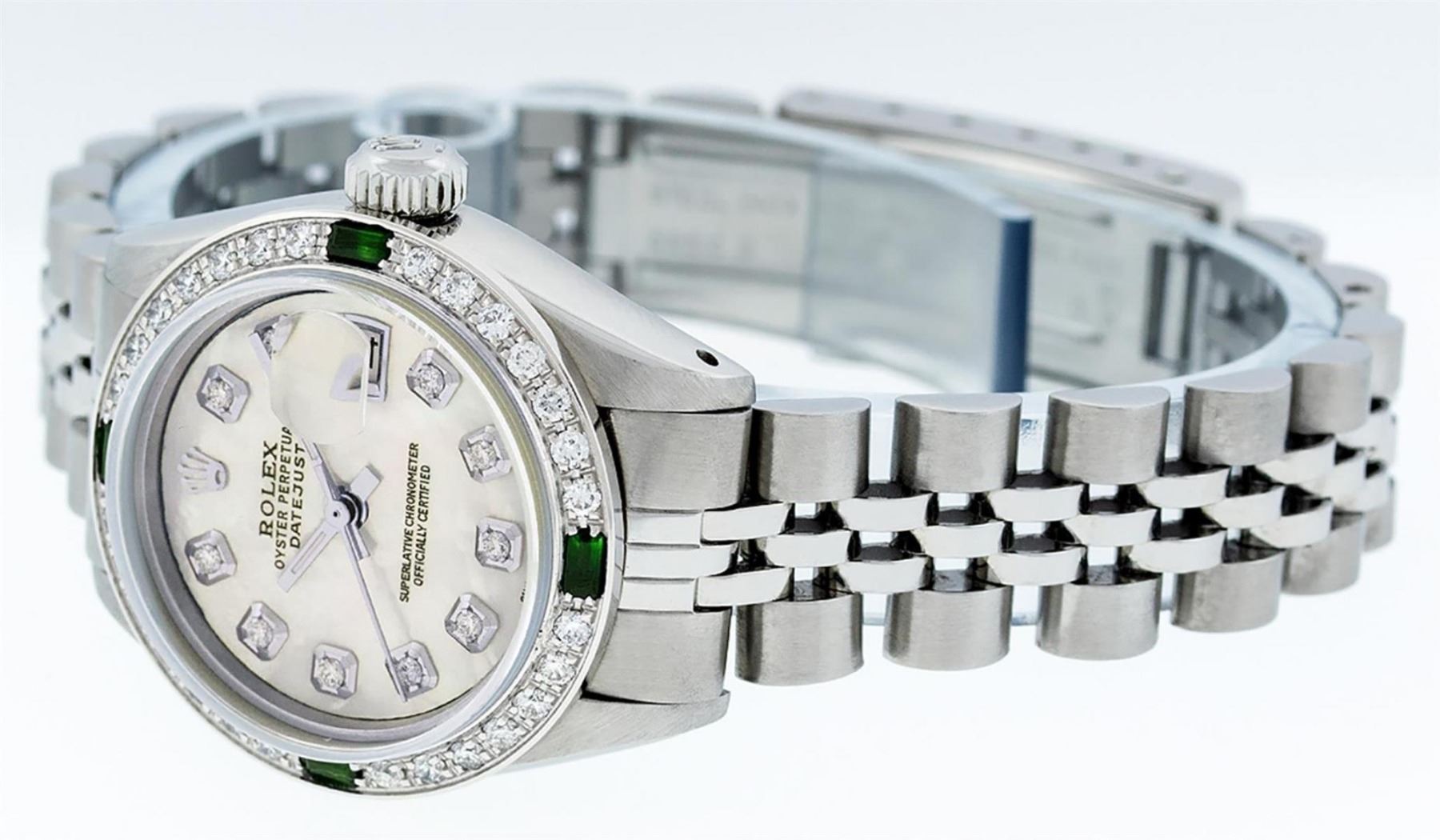 One Ladies Stainless Steel Rolex Datejust Polished Bright with Satin Finish, Serviced & Electronically Tested, Stainless Steel Case: 26mm, Stainless Steel Crown, Custom Bezel: New 18K White Gold Emerald Beadset Diamond Bezel, Diamond + Gem Count: 28 Diamonds + 4 Emeralds. Total Weight .70 Carat, Clarity: SI-VS, Color: G to H. Custom Crystal: New Scratch Resistant Synthetic Sapphire Cyclops Lens. Custom Hands: New Luminescent Hands. Movement: Automatic Winding Movement Caliber 2030. Custom Dial: Refinished Yellow Mother Of Pearl With Diamond Hour Markers, 10 Diamonds in Dial, G To H In Color, Clarity: SI-VS. Date Window: 3 O'Clock Position Date Display, Model: Datejust. Condition: G-6 Extra Fine. Bracelet: Stainless Steel Jubilee Band. Bright Polish & Satin Finish. 6.0 Inch Length, Adjustable. Standard Clasp, With Rolex Logo. This Watch Has Been Serviced Time Tested And Is In Excellent Condition It Is Free Of All Scratches And Dents.