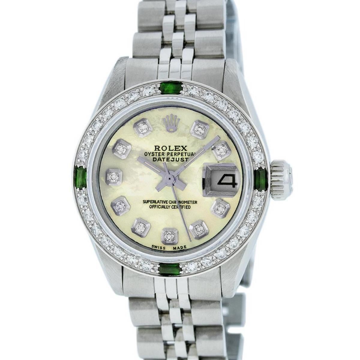 One Ladies Stainless Steel Rolex Datejust Polished Bright with Satin Finish, Serviced & Electronically Tested, Stainless Steel Case: 26mm, Stainless Steel Crown, Custom Bezel: New 18K White Gold Emerald Beadset Diamond Bezel, Diamond + Gem Count: 28 Diamonds + 4 Emeralds. Total Weight .70 Carat, Clarity: SI-VS, Color: G to H. Custom Crystal: New Scratch Resistant Synthetic Sapphire Cyclops Lens. Custom Hands: New Luminescent Hands. Movement: Automatic Winding Movement Caliber 2030. Custom Dial: Refinished Yellow Mother Of Pearl With Diamond Hour Markers, 10 Diamonds in Dial, G To H In Color, Clarity: SI-VS. Date Window: 3 O'Clock Position Date Display, Model: Datejust. Condition: G-6 Extra Fine. Bracelet: Stainless Steel Jubilee Band. Bright Polish & Satin Finish. 6.0 Inch Length, Adjustable. Standard Clasp, With Rolex Logo. This Watch Has Been Serviced Time Tested And Is In Excellent Condition It Is Free Of All Scratches And Dents.