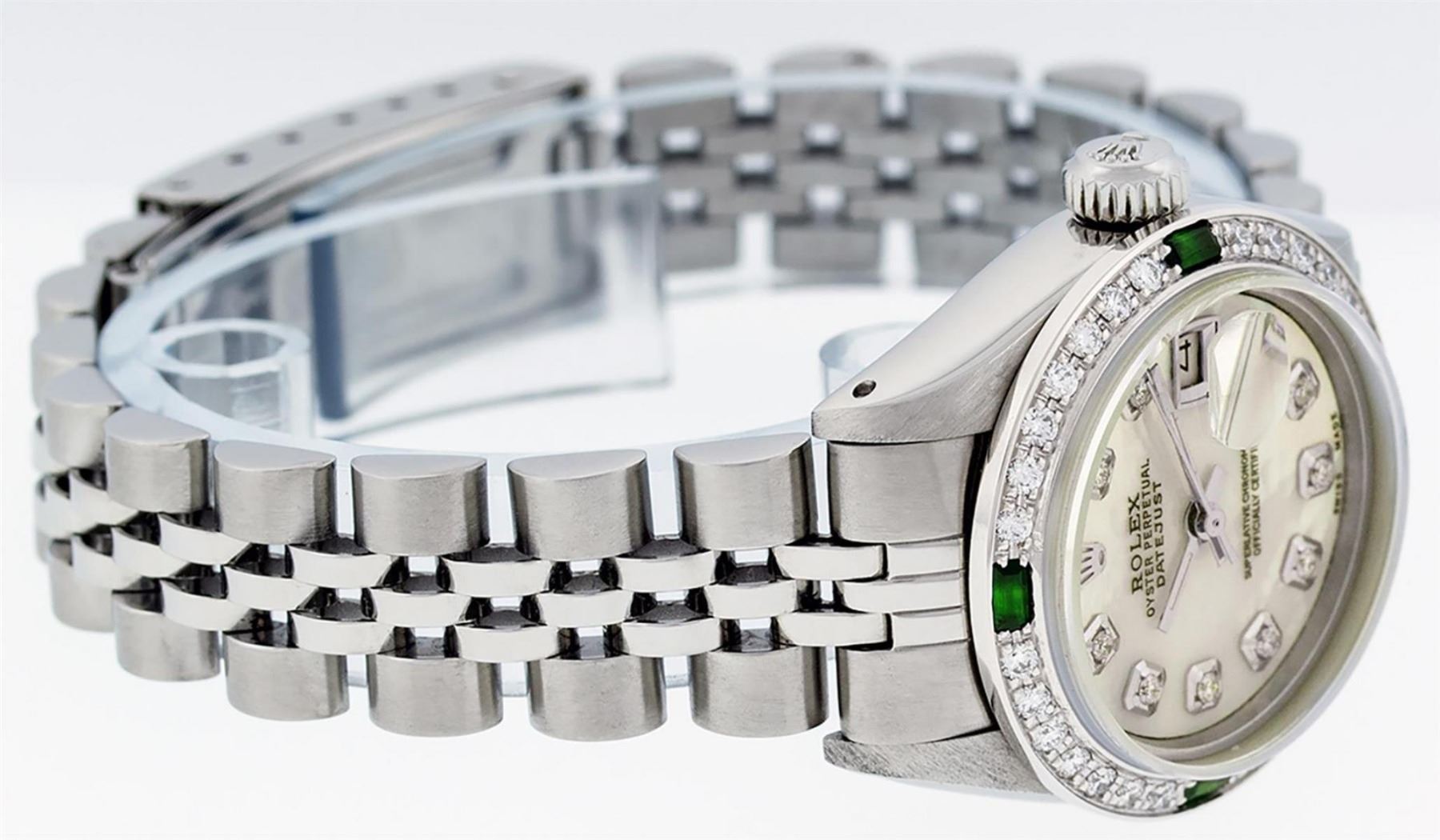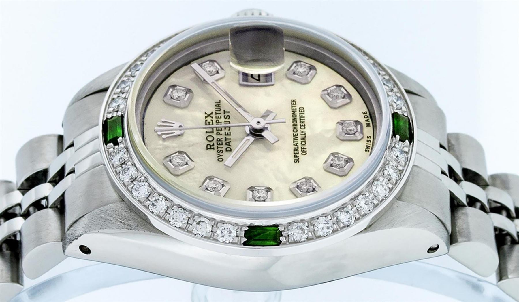 One Ladies Stainless Steel Rolex Datejust Polished Bright with Satin Finish, Serviced & Electronically Tested, Stainless Steel Case: 26mm, Stainless Steel Crown, Custom Bezel: New 18K White Gold Emerald Beadset Diamond Bezel, Diamond + Gem Count: 28 Diamonds + 4 Emeralds. Total Weight .70 Carat, Clarity: SI-VS, Color: G to H. Custom Crystal: New Scratch Resistant Synthetic Sapphire Cyclops Lens. Custom Hands: New Luminescent Hands. Movement: Automatic Winding Movement. Custom Dial: Refinished Yellow Mother Of Pearl With Diamond Hour Markers, 10 Diamonds in Dial, G To H In Color, Clarity: SI-VS. Date Window: 3 O'Clock Position Date Display, Model: Datejust. Condition: G-6 Extra Fine. Bracelet: Stainless Steel Jubilee Band. Bright Polish & Satin Finish. 6.0 Inch Length, Adjustable. Standard Clasp, With Rolex Logo. This Watch Has Been Serviced Time Tested And Is In Excellent Condition It Is Free Of All Scratches And Dents.