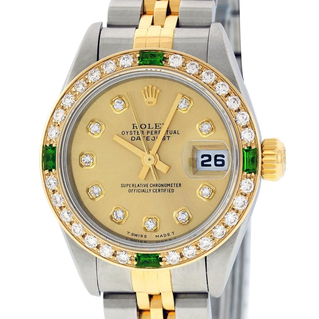 One Ladies Pre Owned 18K Two Tone Yellow Gold And Stainless Steel Rolex Datejust Polished, Serviced And Electronically Tested, 18K Yellow Gold And Stainless Steel Case: 26mm, 18K Yellow Gold Crown, Custom Bezel: New 18K Yellow Gold Emerald Beadset Diamond Bezel, Diamond + Gem Count: 28 Diamonds + 4 Emeralds. Custom Crystal: New Sapphire With Date Window. Custom Hands: New Luminescent Hands. Rolex Movement: Quickset Automatic Winding Movement 2235. Custom Dial: Custom Champagne Dial With Added Diamonds, Diamond Count: 10 On Dial. Date Window: 3 O'Clock Position Date Display, Model: Datejust, Condition: G-6 Extra Fine. Rolex Bracelet: Two Tone 18K Yellow Gold And Stainless Steel Jubilee Band. Bright Polish. 6.0 Inch Length, Adjustable. Standard Clasp, With Rolex Logo. This Watch Has Been Serviced Time Tested And Is In Excellent Condition It Is Free Of All Scratches And Dents.