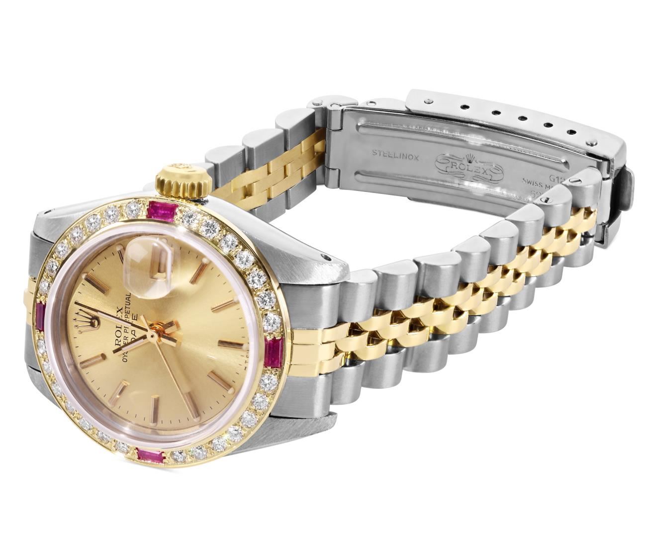 One Rolex Ladies Pre Owned Two Tone 14K Yellow Gold And Stainless Steel Rolex Date Polished, Serviced & Electronically Tested, Rolex Yellow Gold And Stainless Steel Case: 26mm, Rolex Yellow Gold Crown, Custom Bezel: New 18K Yellow Gold Ruby Beadset Diamond Bezel, Diamond + Gem Count: 36 Diamonds + 4 Rubies. Custom Crystal: New Acrylic With Magnifying Date Window. Custom Hands: New Luminescent Hands. Rolex Movement: Automatic Winding Movement 2035. Rolex Factory Dial: Champagne With Index Hour Markers And Dash Track. Date Window: 3 O'Clock Position Date Display, Condition: G-6 Extra Fine. Rolex Bracelet: Two Tone 14K Yellow Gold And Stainless Steel Jubilee Band. Bright Polish And Satin Finish. 6.0 Inch Length, Adjustable. Standard Clasp, With Rolex Logo. This Watch Has Been Serviced Time Tested And Is In Excellent Condition It Is Free Of All Scratches And Dents.