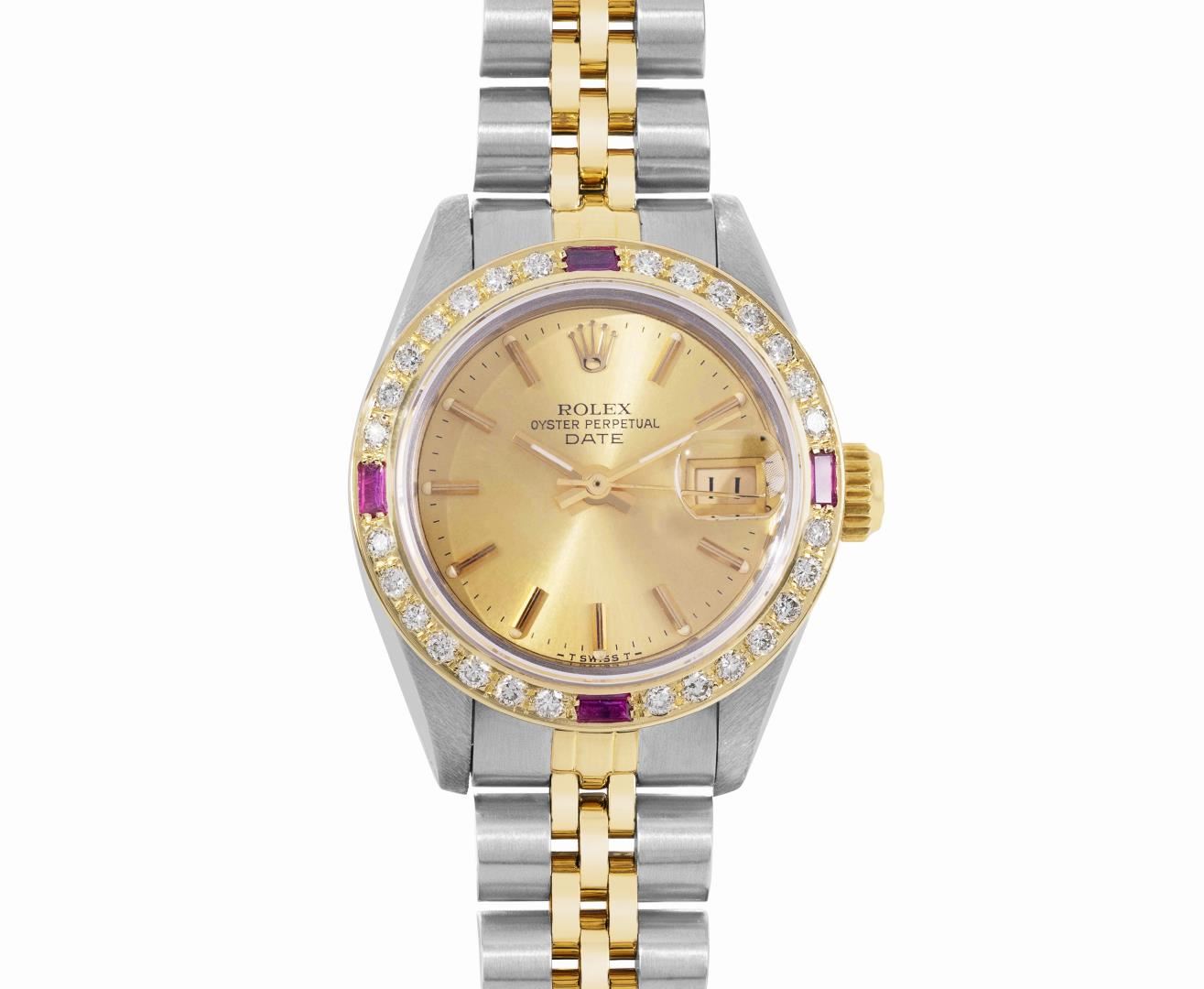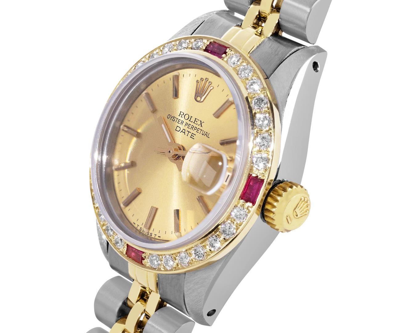 One Rolex Ladies Pre Owned Two Tone 14K Yellow Gold And Stainless Steel Rolex Date Polished, Serviced & Electronically Tested, Rolex Yellow Gold And Stainless Steel Case: 26mm, Rolex Yellow Gold Crown, Custom Bezel: New 18K Yellow Gold Ruby Beadset Diamond Bezel, Diamond + Gem Count: 36 Diamonds + 4 Rubies. Custom Crystal: New Acrylic With Magnifying Date Window. Custom Hands: New Luminescent Hands. Rolex Movement: Automatic Winding Movement 2035. Rolex Factory Dial: Champagne With Index Hour Markers And Dash Track. Date Window: 3 O'Clock Position Date Display, Condition: G-6 Extra Fine. Rolex Bracelet: Two Tone 14K Yellow Gold And Stainless Steel Jubilee Band. Bright Polish And Satin Finish. 6.0 Inch Length, Adjustable. Standard Clasp, With Rolex Logo. This Watch Has Been Serviced Time Tested And Is In Excellent Condition It Is Free Of All Scratches And Dents.