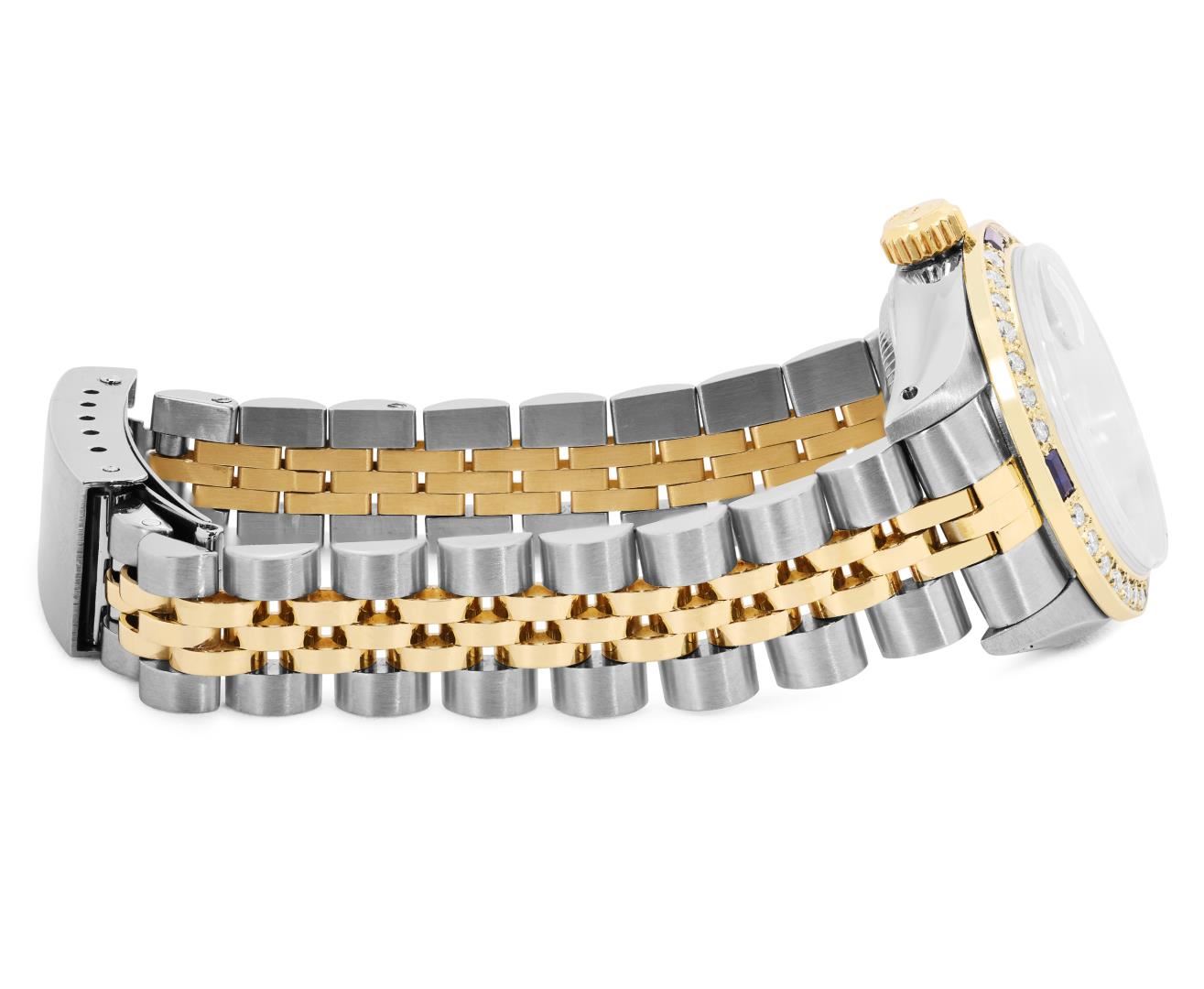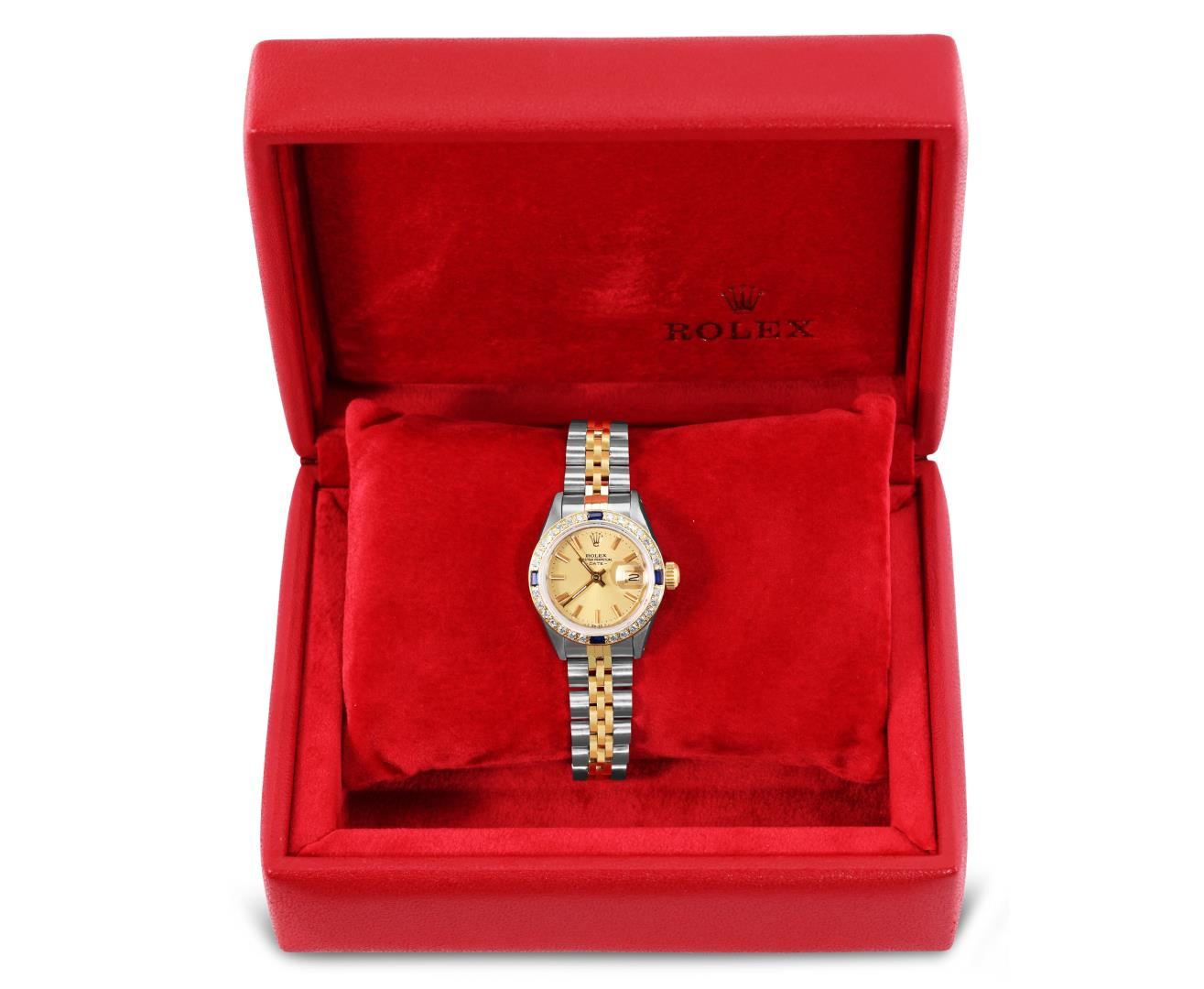 One Rolex Ladies Pre Owned Two Tone Yellow Gold And Stainless Steel Rolex Date Polished, Serviced And Electronically Tested, Rolex Yellow Gold And Stainless Steel Case: 26mm, Rolex Yellow Gold Crown. Custom Bezel: New 18K Yellow Gold Sapphire Diamond Bezel, Diamond Count: 28 Diamonds + 4 Sapphire. Crystal: Custom Sapphire Crystal With Date Window. Hands: Custom Luminescent Hands. Rolex Movement: 2035 Automatic Winding Movement. Rolex Factory Dial: Champagne Dial With Dash Track And Lumi Dots, Date Window: 3 O'Clock Position Date Display, Condition: G-6 Extra Fine. Rolex Bracelet: Two Tone 14K Yellow Gold And Stainless Steel Jubilee Band. Bright Polish. 6.0 Inch Length, Adjustable. Standard Clasp, With Rolex Logo. This Watch Has Been Serviced Time Tested And Is In Excellent Condition It Is Free Of All Scratches And Dents. This Watch Comes With A Rolex Box.