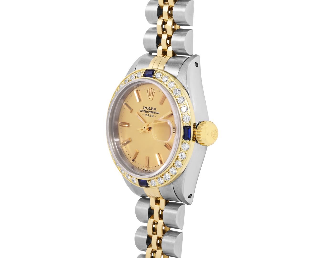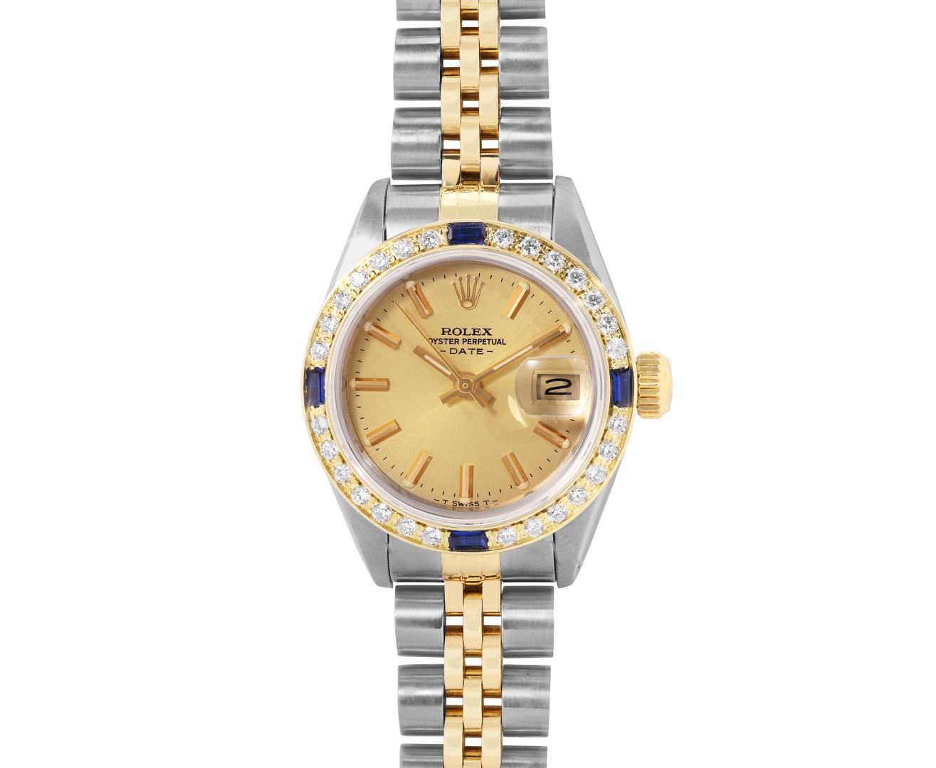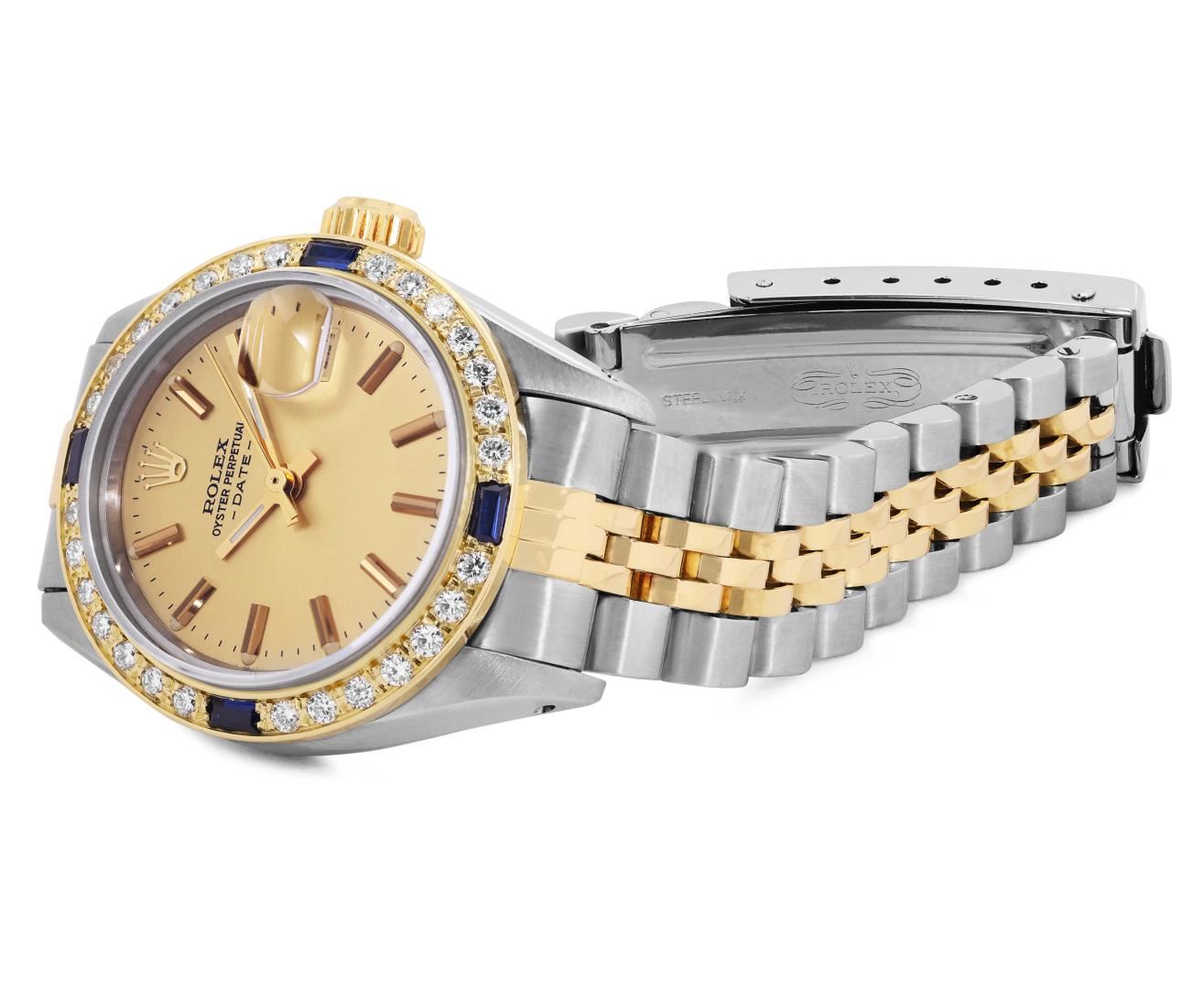 One Rolex Ladies Pre Owned Two Tone Yellow Gold And Stainless Steel Rolex Date Polished, Serviced And Electronically Tested, Rolex Yellow Gold And Stainless Steel Case: 26mm, Rolex Yellow Gold Crown. Custom Bezel: New 18K Yellow Gold Sapphire Diamond Bezel, Diamond Count: 28 Diamonds + 4 Sapphire. Crystal: Custom Sapphire Crystal With Date Window. Hands: Custom Luminescent Hands. Rolex Movement: 2035 Automatic Winding Movement. Rolex Factory Dial: Champagne Dial With Dash Track And Lumi Dots, Date Window: 3 O'Clock Position Date Display, Condition: G-6 Extra Fine. Rolex Bracelet: Two Tone 14K Yellow Gold And Stainless Steel Jubilee Band. Bright Polish. 6.0 Inch Length, Adjustable. Standard Clasp, With Rolex Logo. This Watch Has Been Serviced Time Tested And Is In Excellent Condition It Is Free Of All Scratches And Dents. This Watch Comes With A Rolex Box.