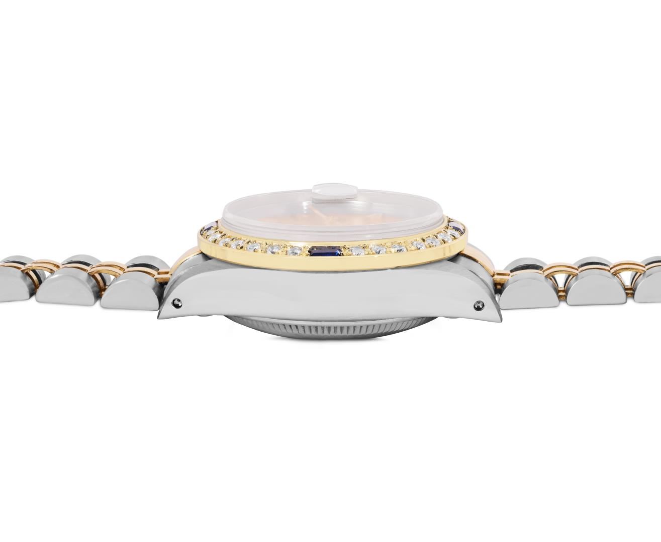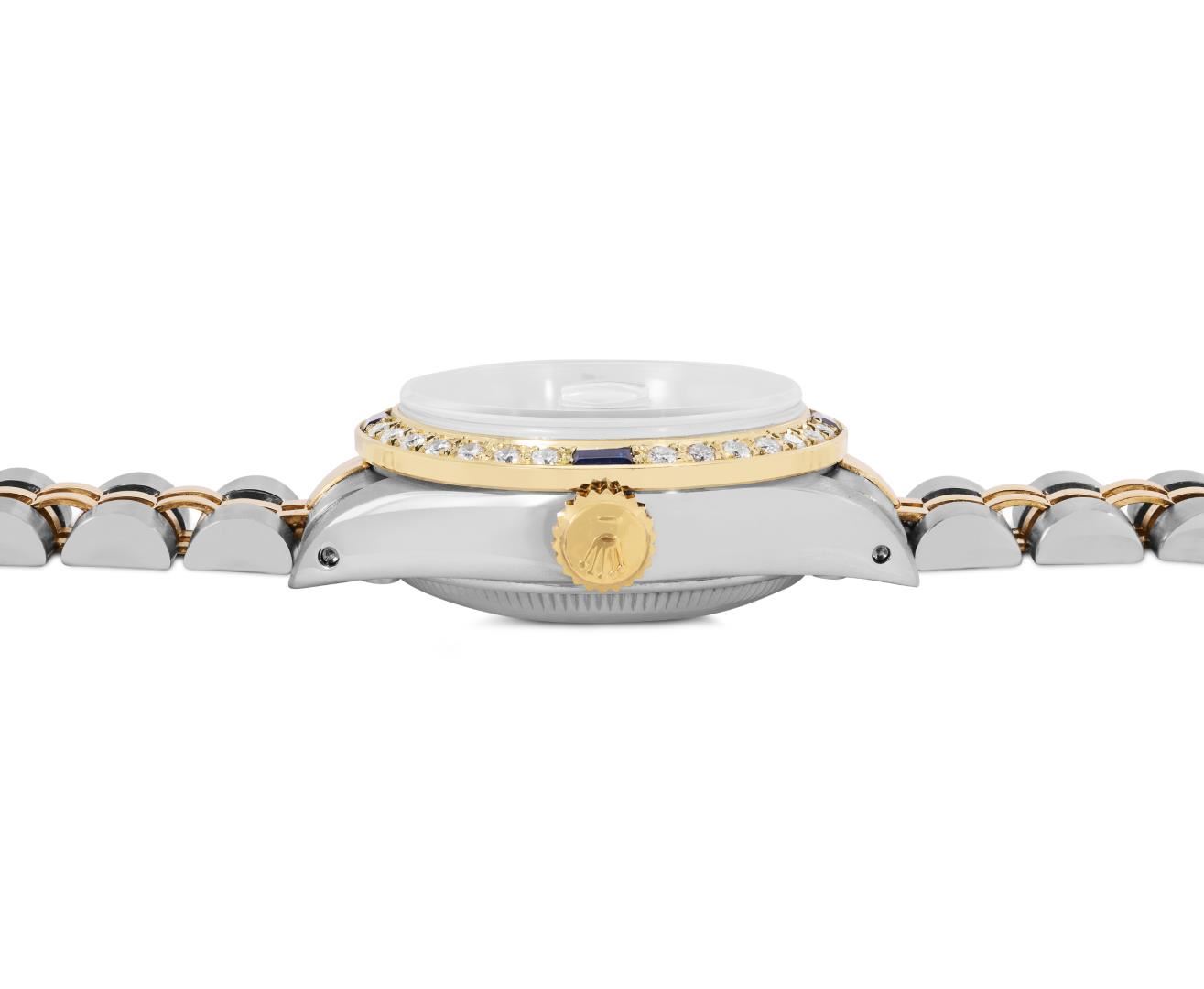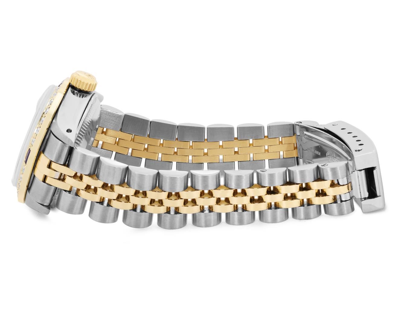 One Rolex Ladies Pre Owned Two Tone Yellow Gold And Stainless Steel Rolex Date Polished, Serviced And Electronically Tested, Rolex Yellow Gold And Stainless Steel Case: 26mm, Rolex Yellow Gold Crown. Custom Bezel: New 18K Yellow Gold Sapphire Diamond Bezel, Diamond Count: 28 Diamonds + 4 Sapphire. Crystal: Custom Sapphire Crystal With Date Window. Hands: Custom Luminescent Hands. Rolex Movement: 2035 Automatic Winding Movement. Rolex Factory Dial: Champagne Dial With Dash Track And Lumi Dots, Date Window: 3 O'Clock Position Date Display, Condition: G-6 Extra Fine. Rolex Bracelet: Two Tone 14K Yellow Gold And Stainless Steel Jubilee Band. Bright Polish. 6.0 Inch Length, Adjustable. Standard Clasp, With Rolex Logo. This Watch Has Been Serviced Time Tested And Is In Excellent Condition It Is Free Of All Scratches And Dents. This Watch Comes With A Rolex Box.