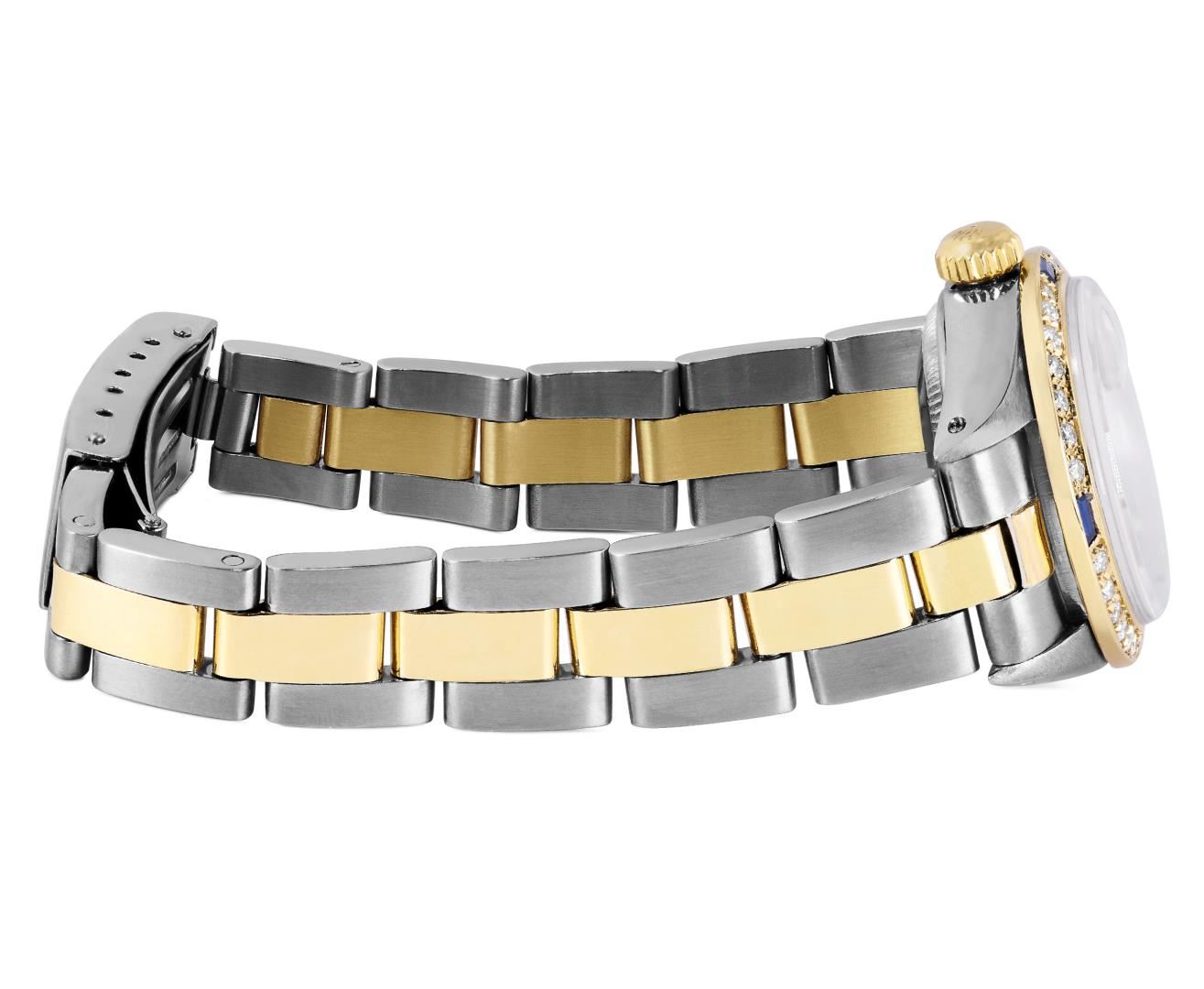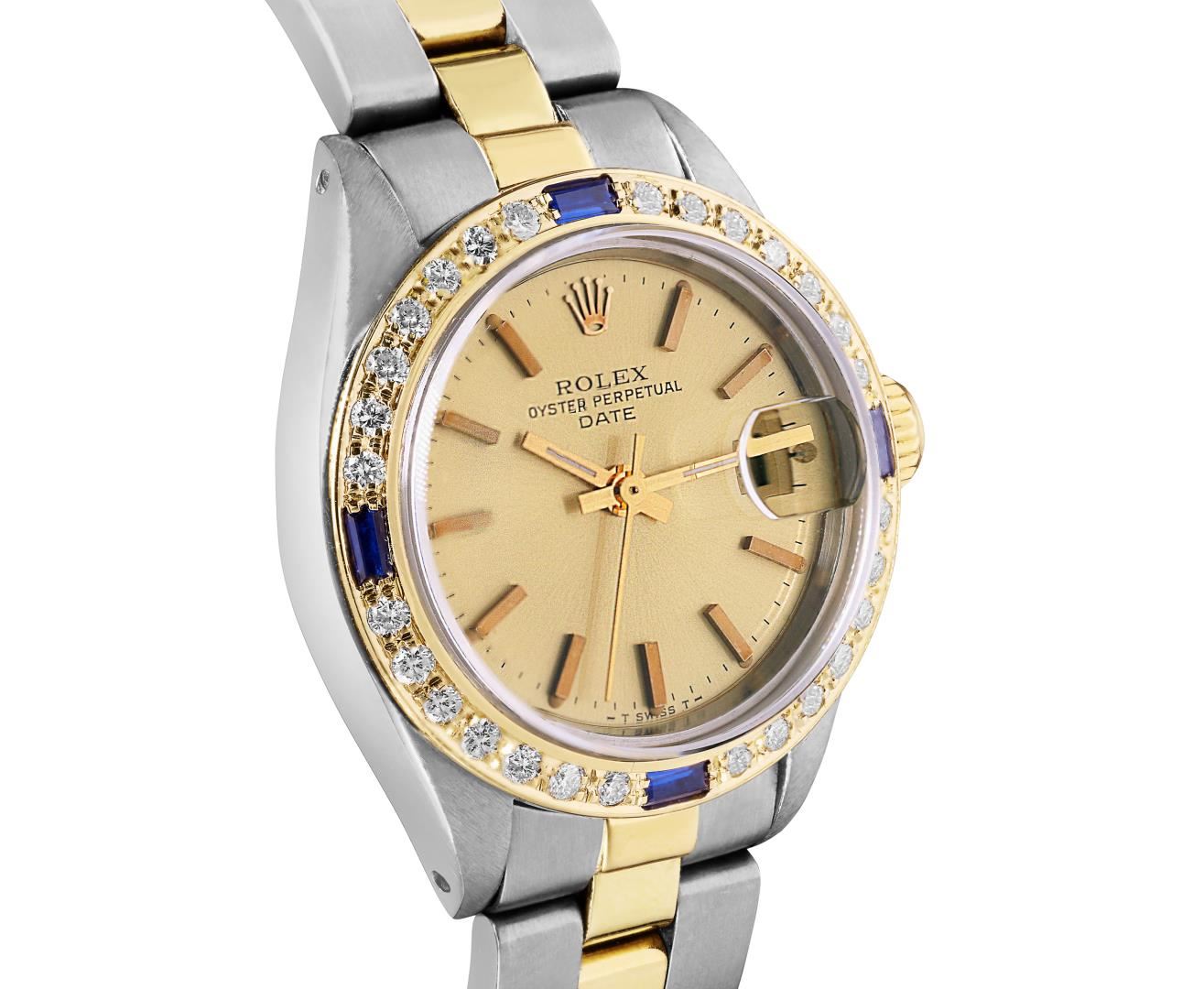 One Rolex Ladies Pre Owned Two Tone Yellow Gold And Stainless Steel Rolex Date Polished, Serviced & Electronically Tested, Rolex Yellow Gold And Stainless Steel Case: 26mm, Rolex Yellow Gold Crown. Custom Bezel: New 18K Yellow Gold Sapphire Diamond Bezel, Diamond Count: 28 Diamonds + 4 Sapphire. Crystal: Custom Sapphire Crystal With Date Window. Hands: Custom Luminescent Hands. Rolex Movement: 2035 Automatic Winding Movement. Rolex Factory Dial: Champagne Dial With Dash Track & Lumi Dots, Date Window: 3 O'Clock Position Date Display, Condition: G-6 Extra Fine. Rolex Bracelet: Two Tone 14K Yellow Gold And Stainless Steel Oyster Band. Bright Polish. 6.0 Inch Length, Adjustable. Standard Clasp, With Rolex Logo. This Watch Has Been Serviced Time Tested And Is In Excellent Condition It Is Free Of All Scratches And Dents. This Watch Comes With A Rolex Box.