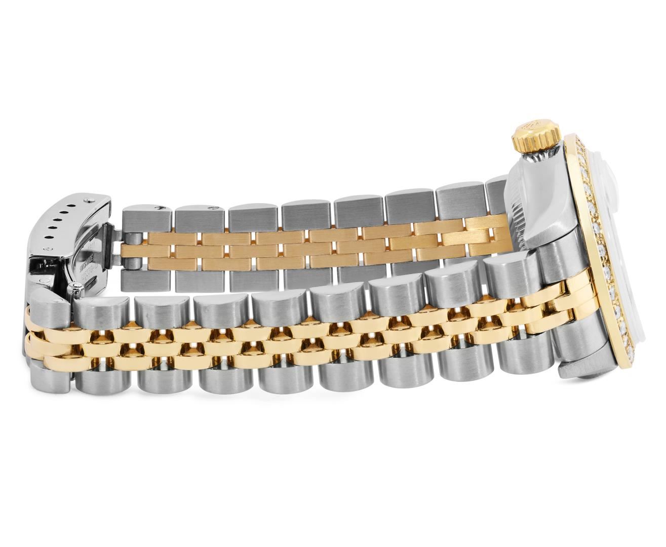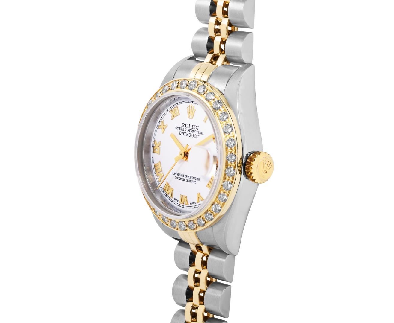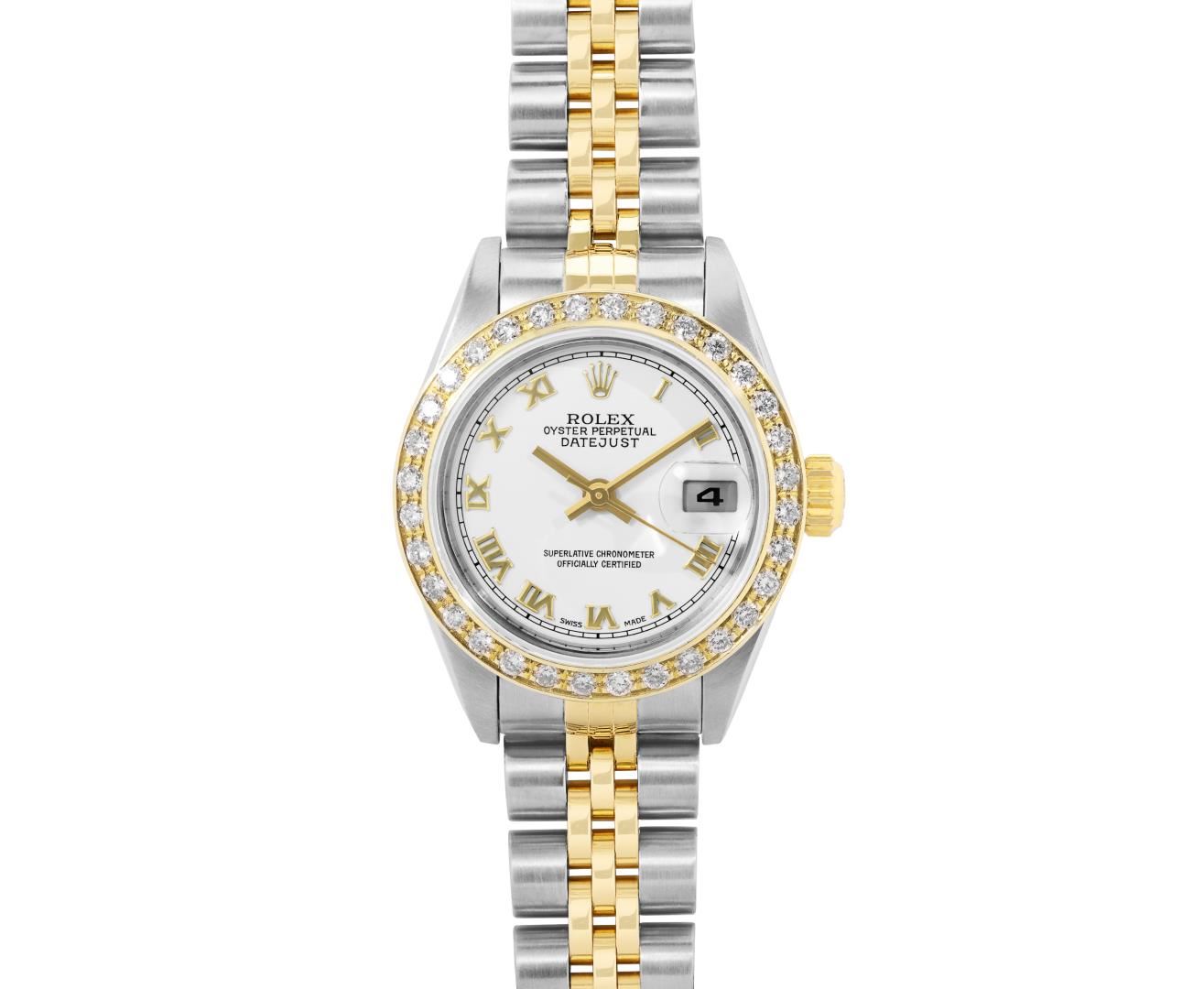 Rolex Ladies Pre Owned Sapphire Quickset 18K Yellow Gold and Stainless Steel Two Tone Datejust Polished Bright with Satin Finish, Serviced And Electronically Tested, Rolex Stainless Steel Case: 26mm, Rolex 18K Yellow Gold Crown, Custom Bezel: New 18K Yellow Gold Beadset Diamond Bezel, Diamond Count: 32 Diamonds On Bezel. Custom Crystal: New Sapphire With Magnified Date Window. Custom Hands: New Hands. Rolex Movement: Automatic Winding Movement 2235. Rolex Dial: Factory White With Roman Hour Markers And Square Track. Date Window: 3 O'Clock Position Date Display, Model: Quickset Datejust, Condition: G-6 Extra Fine. Rolex Bracelet: 18K Yellow Gold And Stainless Steel Jubilee Band. Bright Polish And Satin Finish. 6.0 Inch Length, Adjustable. Standard Clasp, With Rolex Logo. This Watch Has Been Serviced Time Tested And Is In Excellent Condition It Is Free Of All Scratches And Dents. This Watch Comes With A Rolex Box.