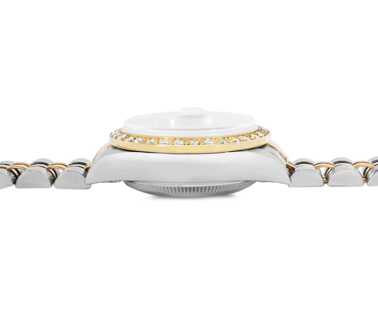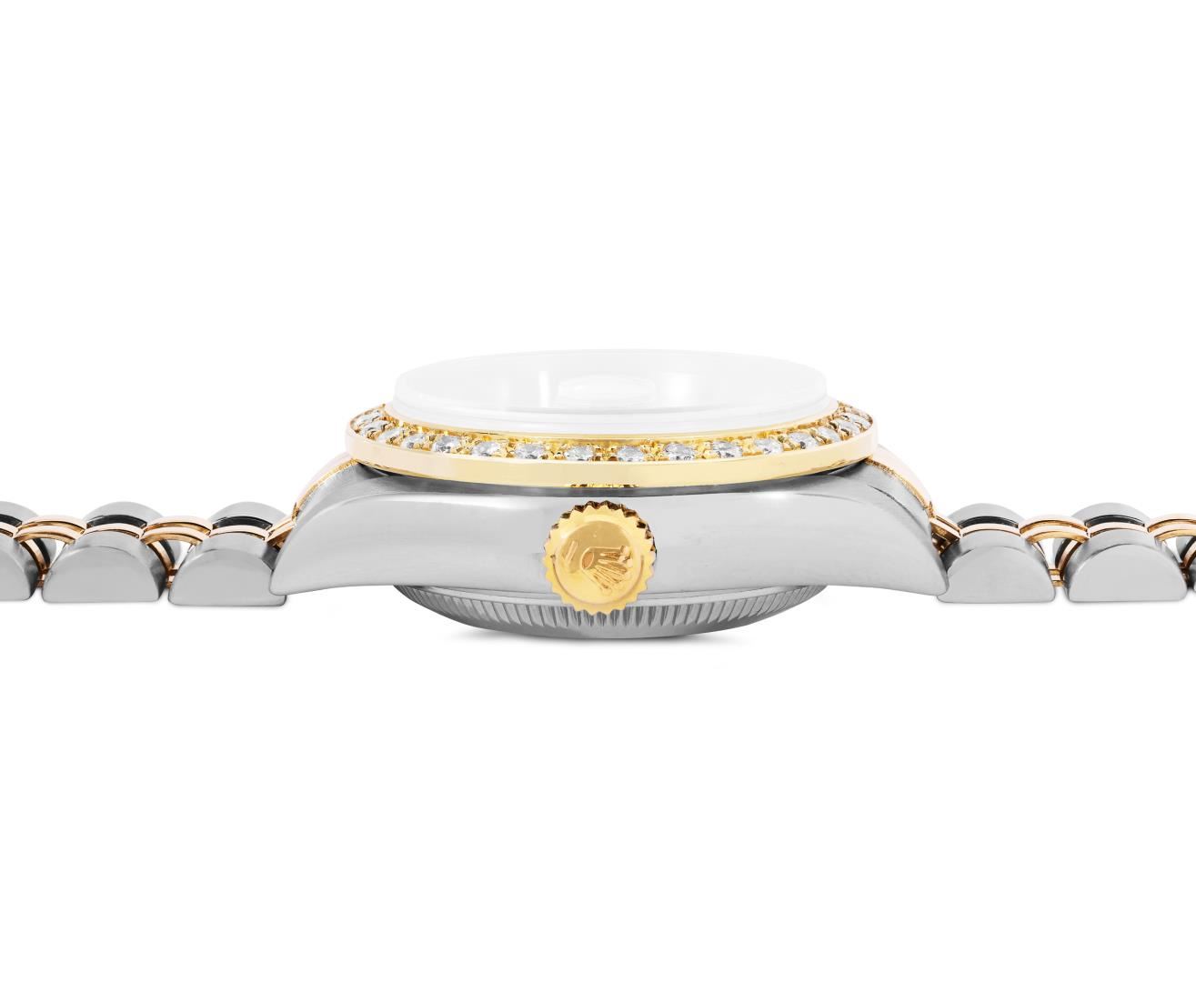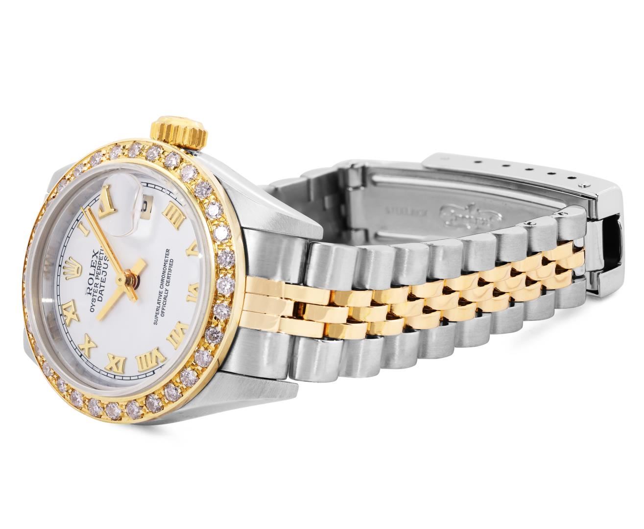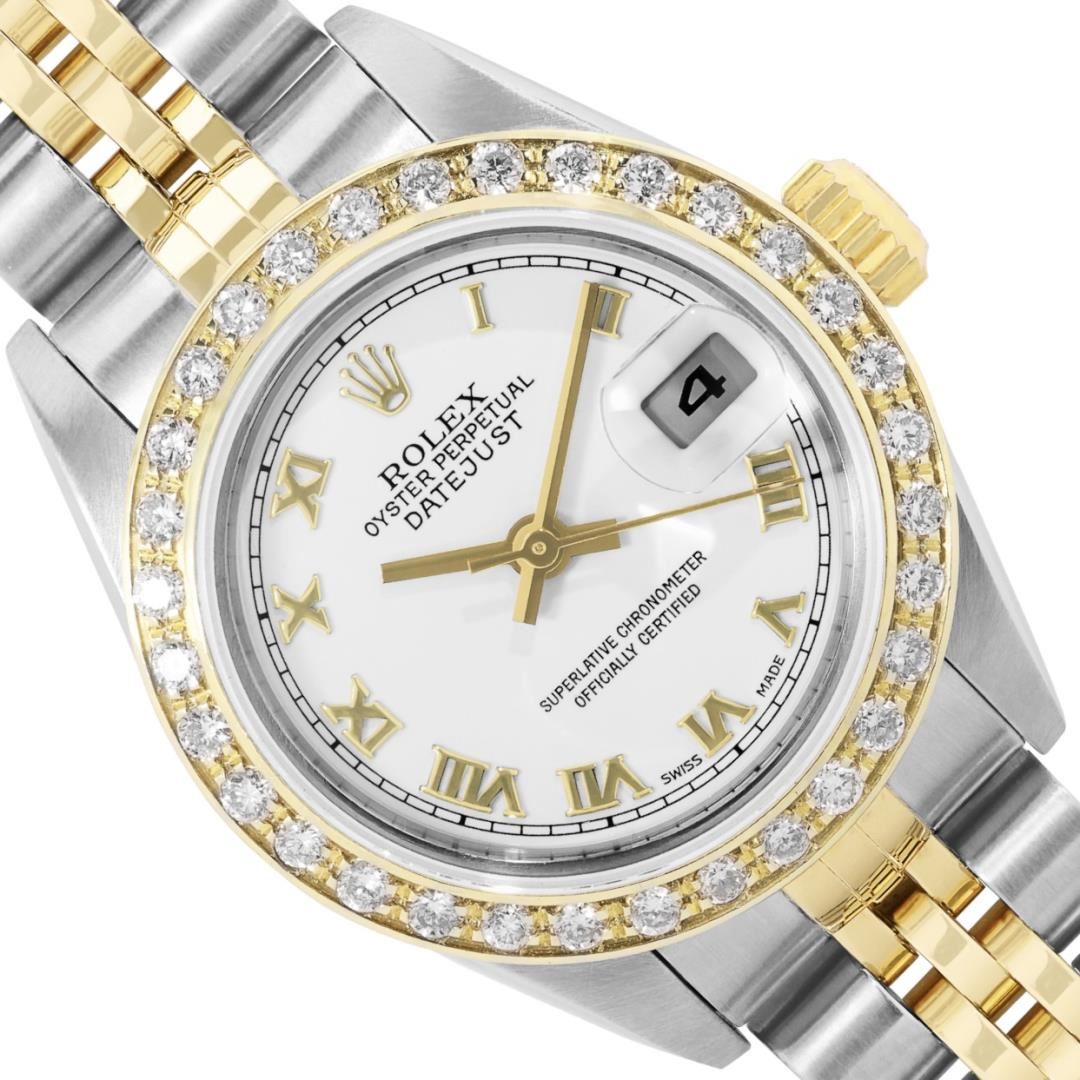 Rolex Ladies Pre Owned Sapphire Quickset 18K Yellow Gold and Stainless Steel Two Tone Datejust Polished Bright with Satin Finish, Serviced And Electronically Tested, Rolex Stainless Steel Case: 26mm, Rolex 18K Yellow Gold Crown, Custom Bezel: New 18K Yellow Gold Beadset Diamond Bezel, Diamond Count: 32 Diamonds On Bezel. Custom Crystal: New Sapphire With Magnified Date Window. Custom Hands: New Hands. Rolex Movement: Automatic Winding Movement 2235. Rolex Dial: Factory White With Roman Hour Markers And Square Track. Date Window: 3 O'Clock Position Date Display, Model: Quickset Datejust, Condition: G-6 Extra Fine. Rolex Bracelet: 18K Yellow Gold And Stainless Steel Jubilee Band. Bright Polish And Satin Finish. 6.0 Inch Length, Adjustable. Standard Clasp, With Rolex Logo. This Watch Has Been Serviced Time Tested And Is In Excellent Condition It Is Free Of All Scratches And Dents. This Watch Comes With A Rolex Box.