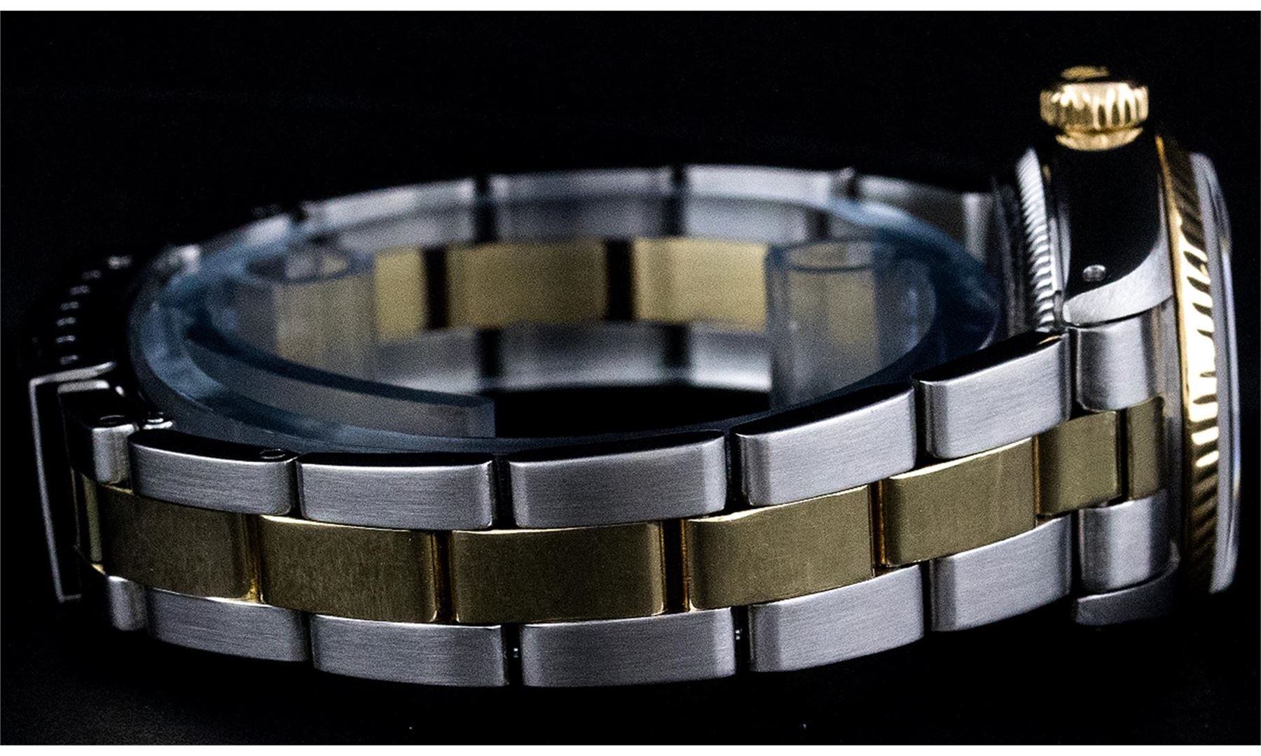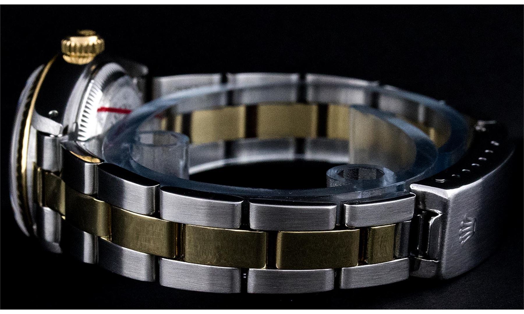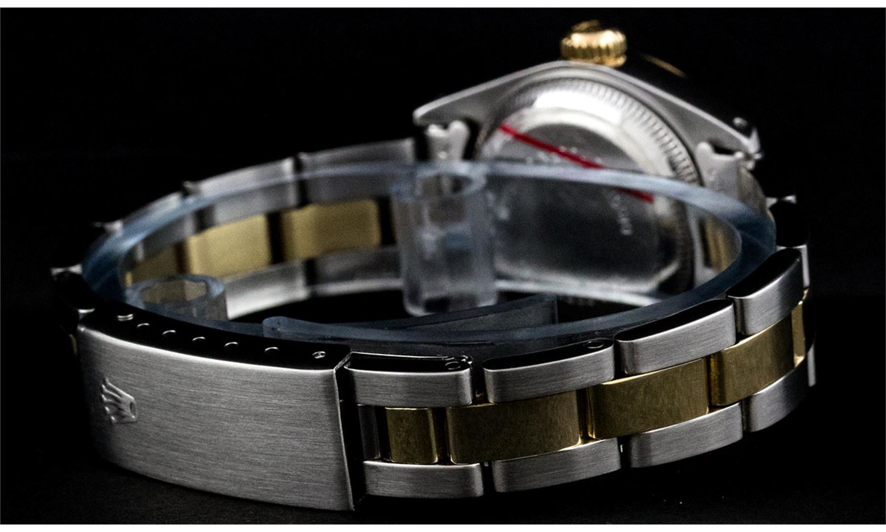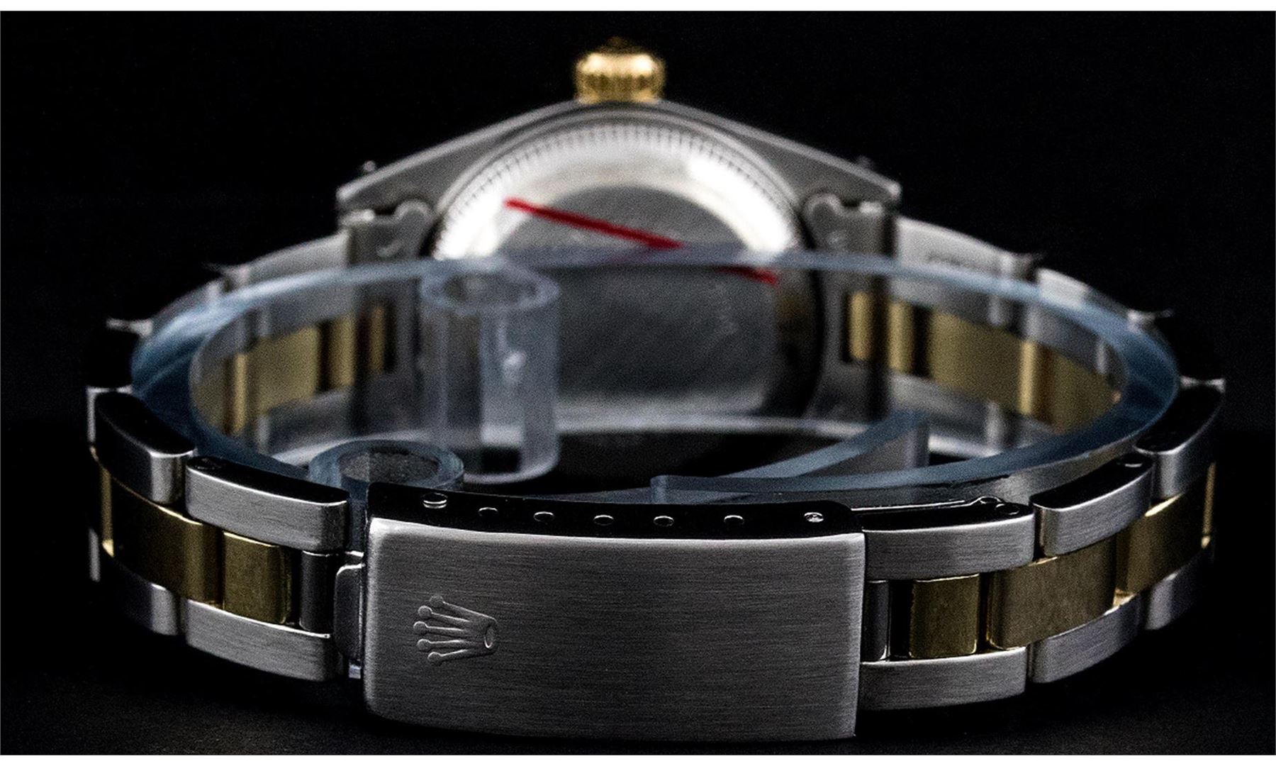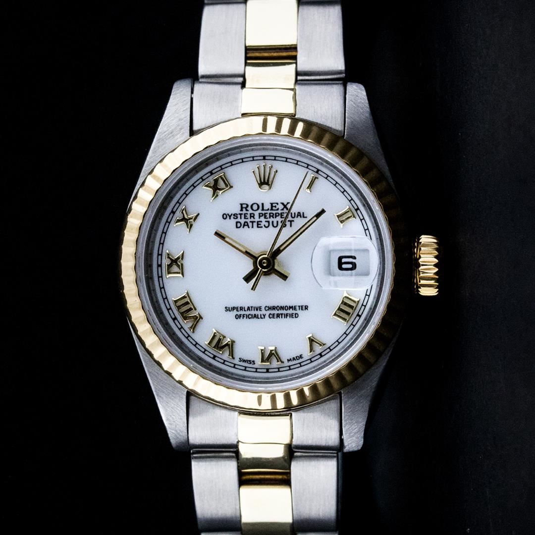 One Ladies Pre Owned 14K Yellow Gold & Stainless Steel Two Tone Rolex Polished, Serviced & Electronically Tested, Rolex Yellow Gold & Stainless Steel Case: 26mm, Rolex Yellow Gold Crown, Rolex Bezel: 14K Yellow Gold Fluted Bezel. Custom Crystal: New Plexiglass With Magnified Date Window. Custom Hands: New Luminescent Hands. Rolex Movement: Automatic Winding Movement 2030. Rolex Dial: White Roman With Square Track. Date Window: 3 O'Clock Position Date Display, Model: Datejust. Condition: G-6 Extra Fine. Rolex Bracelet: Two Tone 14K Yellow Gold & Stainless Steel Oyster Band. Bright Polish. 6.0 Inch Length, Adjustable. Standard Clasp, With Rolex Logo. This Watch Has Been Serviced Time Tested And Is In Excellent Condition It Is Free Of All Scratches And Dents.