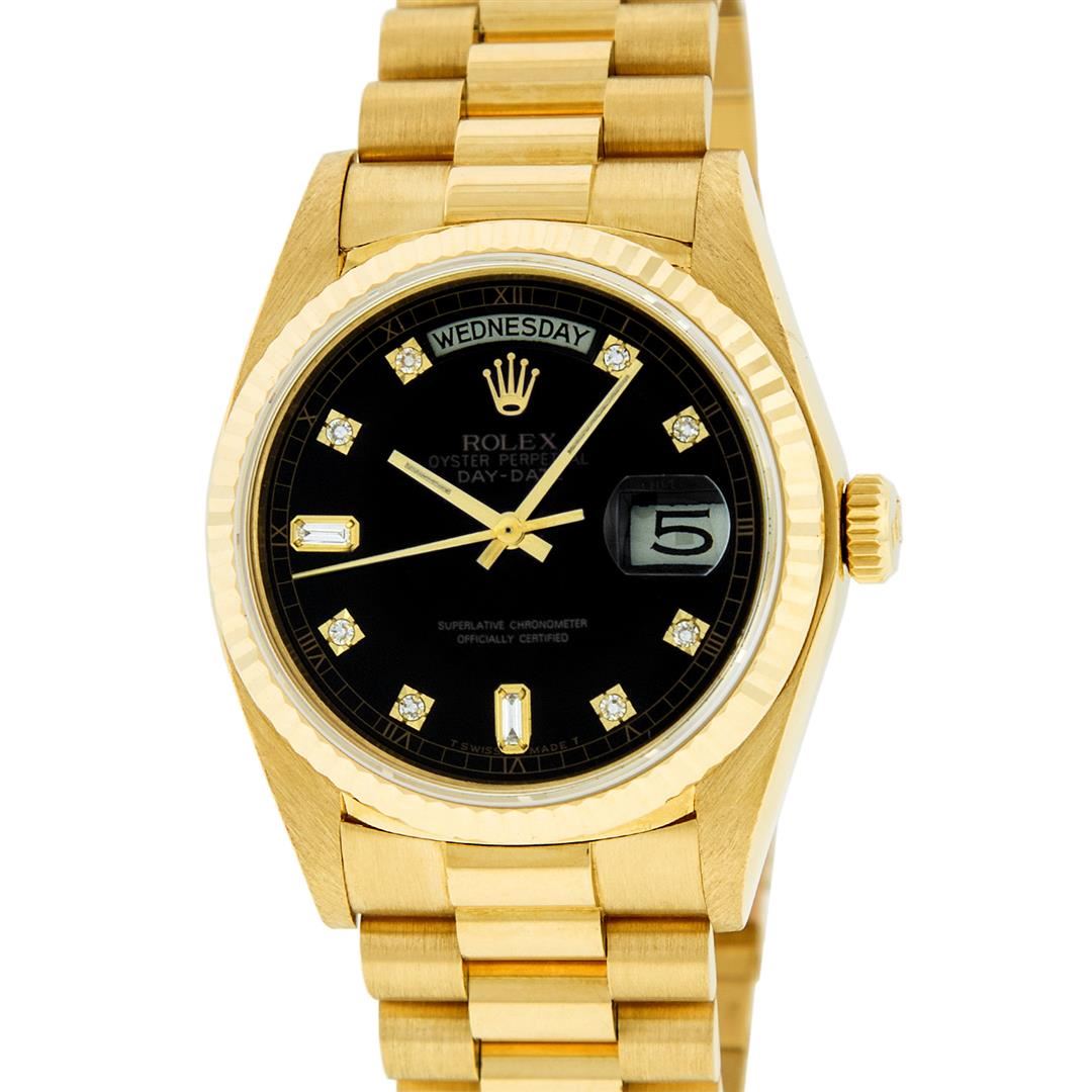 One Mens Quickset Rolex Day Date 18K Yellow Gold President Polished, Serviced & Electronically Tested, 18K Yellow Gold Case: 36mm, 18K Yellow Gold Crown, Bezel: 18K Yellow Gold Fluted Bezel. Custom Crystal: New Scratch Resistant Synthetic Sapphire Cyclops Lens. Custom Hands: New Luminescent Hands. Movement: Automatic Quickset Winding Movement Caliber 3055. Custom Dial: Refinished Black Single Cut Diamond Dial With Roman Track. Date Window: 3 O'Clock Position, Day Display: 12 O'Clock Position, Single Quickset, Model: Day Date President. Condition: G-6 Extra Fine. Bracelet: 18K Yellow Gold President Band With Hidden Clasp, Bright & Satin Polish. 6.75 Inch Length, Standard President Clasp, With Rolex Logo. This Watch Comes With A Watch Winder.
