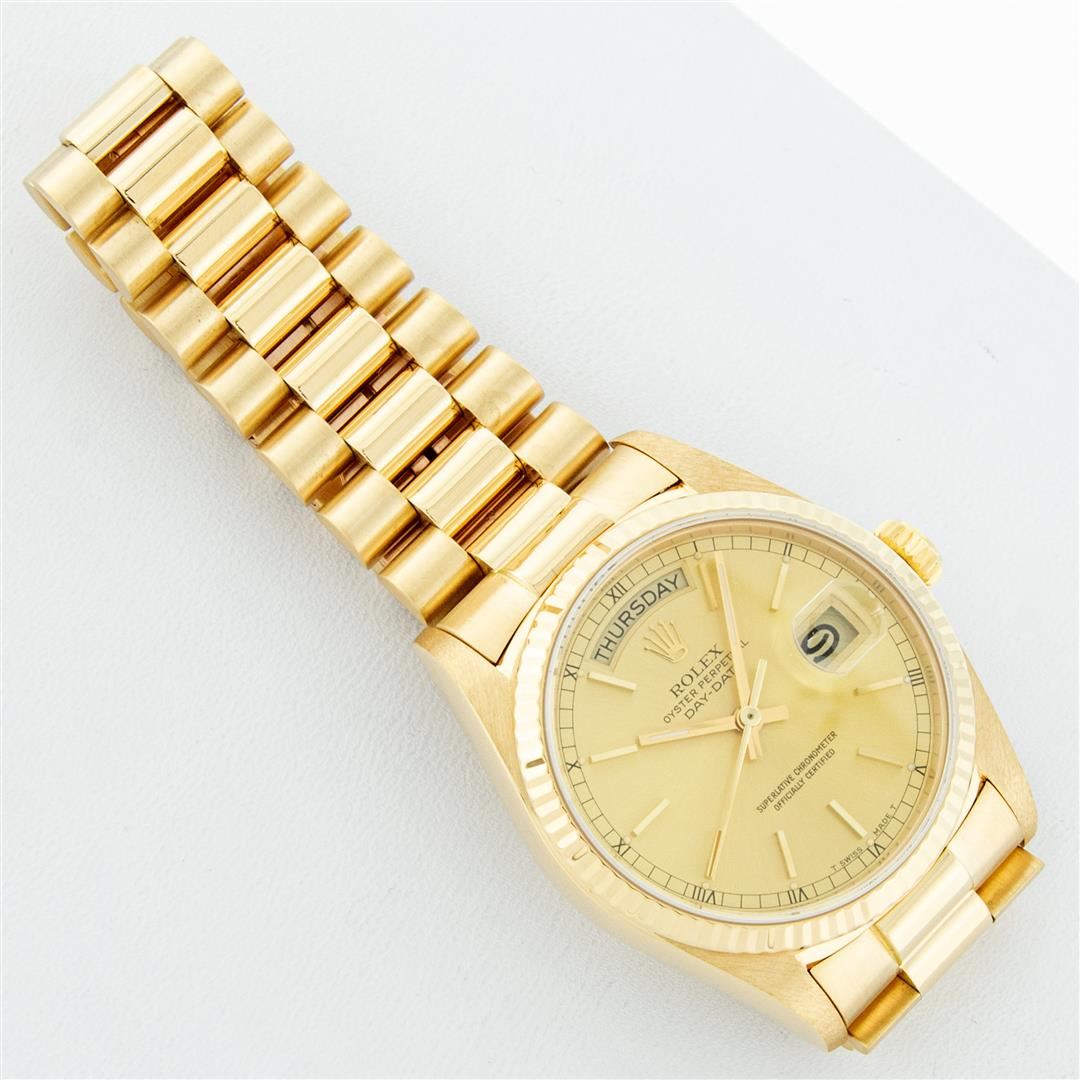 One Mens Quickset Rolex Day Date 18K Yellow Gold President Polished, Serviced & Electronically Tested, Rolex 18K Yellow Gold Case: 36mm, Rolex 18K Yellow Gold Crown, Rolex Bezel: 18K Yellow Gold Fluted Bezel. Crystal: Sapphire With Magnified Date Window. Hands: Luminescent Hands. Rolex Movement: Automatic Quickset Winding Movement Caliber 3055. Rolex Dial: Champagne Index With Roman Track & Lumi Dots. Date Window: 3 O'Clock Position, Day Display: 12 O'Clock Position, Single Quickset, Model: Day Date Quickset President. Condition: G-6 Extra Fine. Rolex Bracelet: 18K Yellow Gold President Band With Hidden Clasp, Bright & Satin Polish. 7.0 Inch Length, Standard Hidden President Clasp, With Rolex Logo. This Pre Owned Watch Has Been Serviced Time Tested And Is In Excellent Condition It Is Free Of All Scratches And Dents.