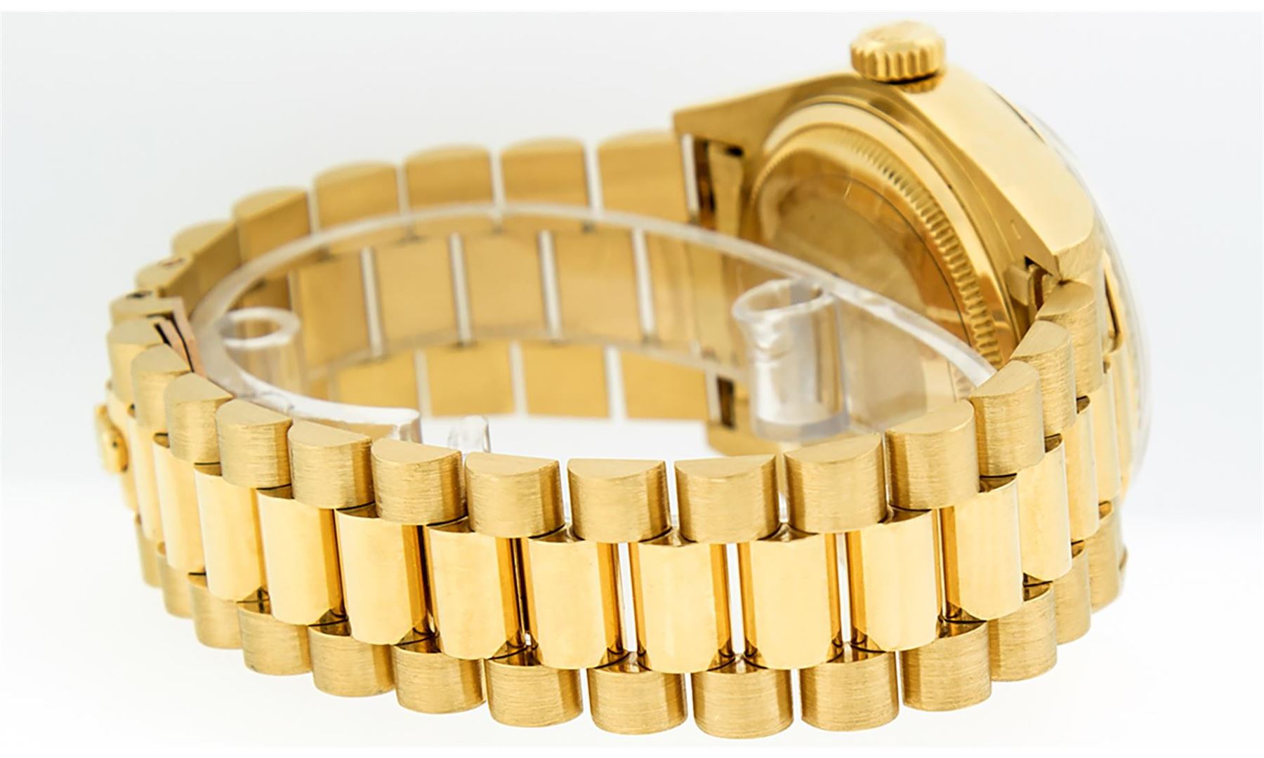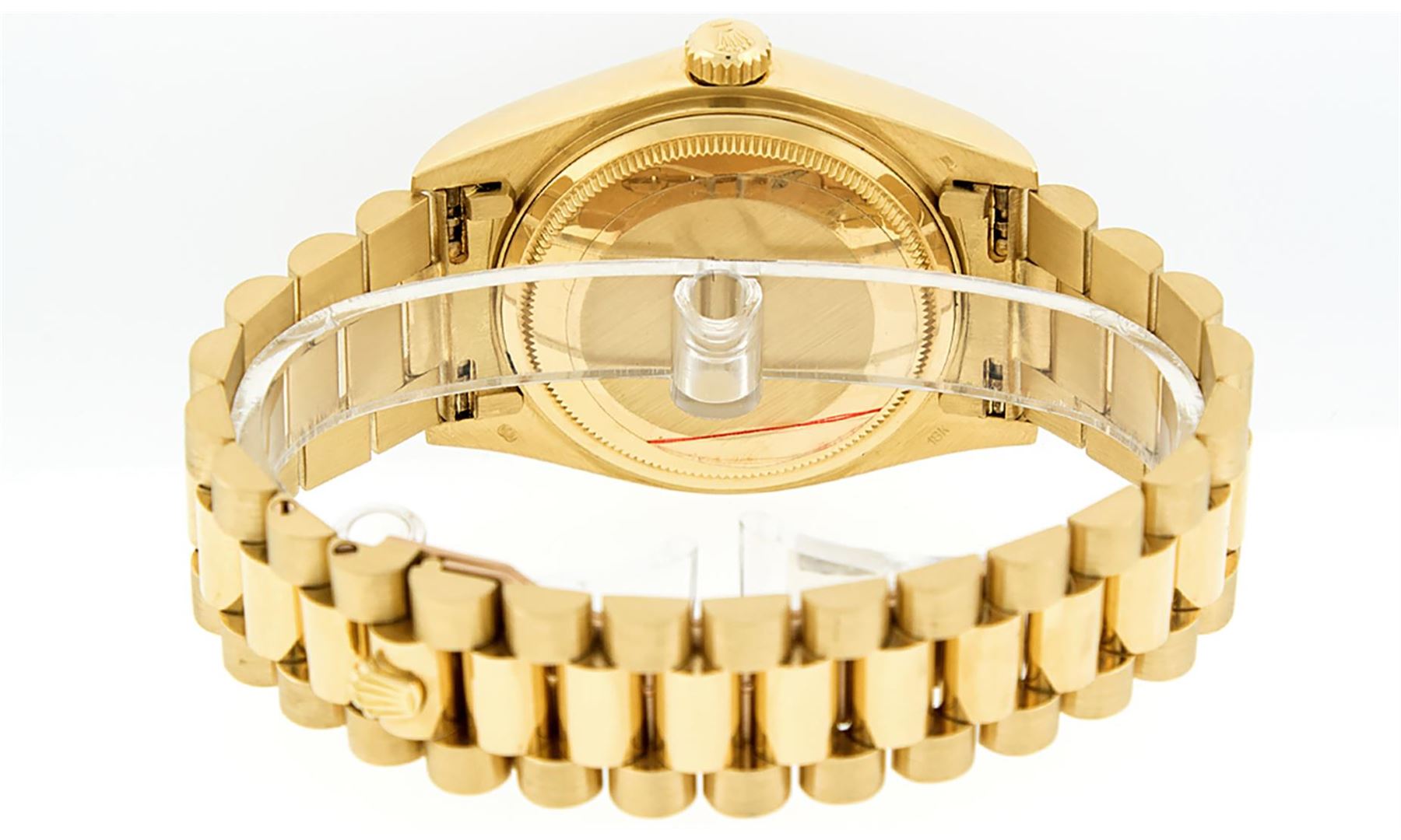 One Mens Quickset Rolex Day Date 18K Yellow Gold President Polished, Serviced & Electronically Tested, 18K Yellow Gold Case: 36mm, 18K Yellow Gold Crown, Bezel: 18K Yellow Gold Fluted Bezel. Custom Crystal: New Scratch Resistant Synthetic Sapphire Cyclops Lens. Movement: Automatic Quickset Winding Movement Caliber 3055. Dial: Champagne Index With Roman Track & Lumi Dots. Date Window: 3 O'Clock Position, Day Display: 12 O'Clock Position, Single Quickset, Model: Day Date President. Condition: G-6 Extra Fine. Bracelet: 18K Yellow Gold President Band With Hidden Clasp, Bright & Satin Polish. 7.0 Inch Length, Standard President Clasp, With Rolex Logo. This Watch Comes With A Rolex Box.