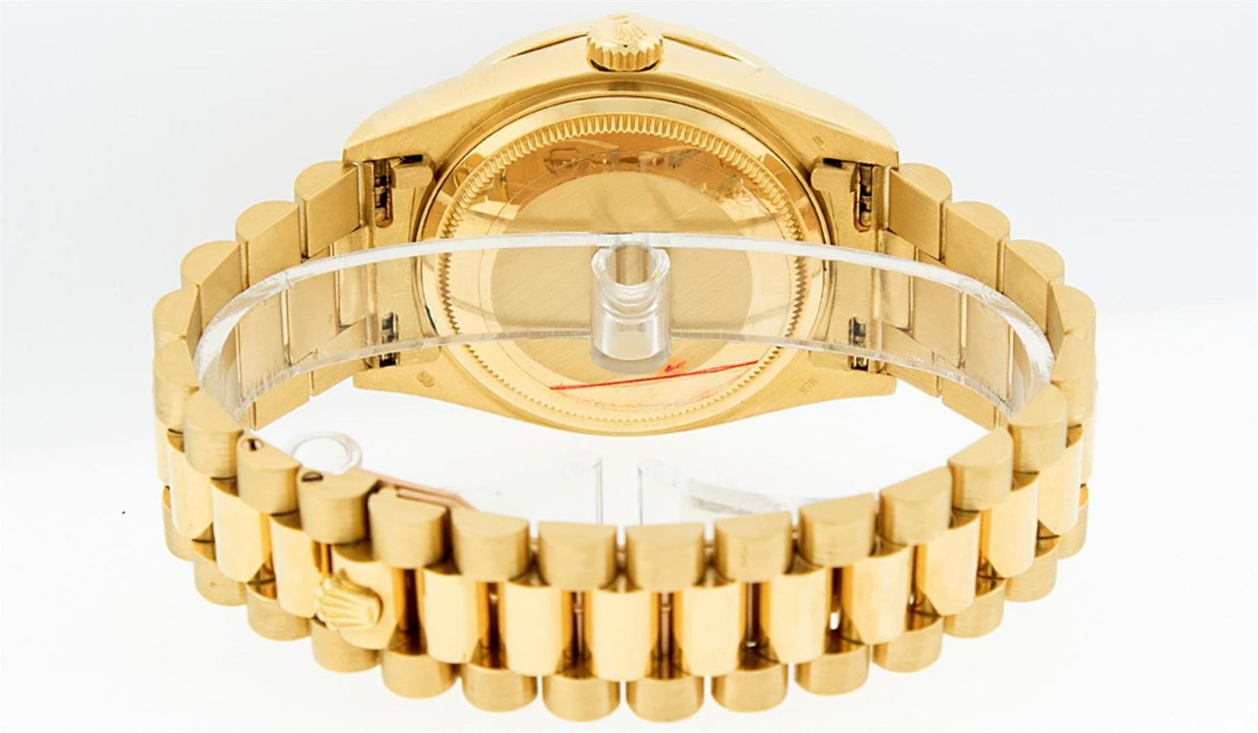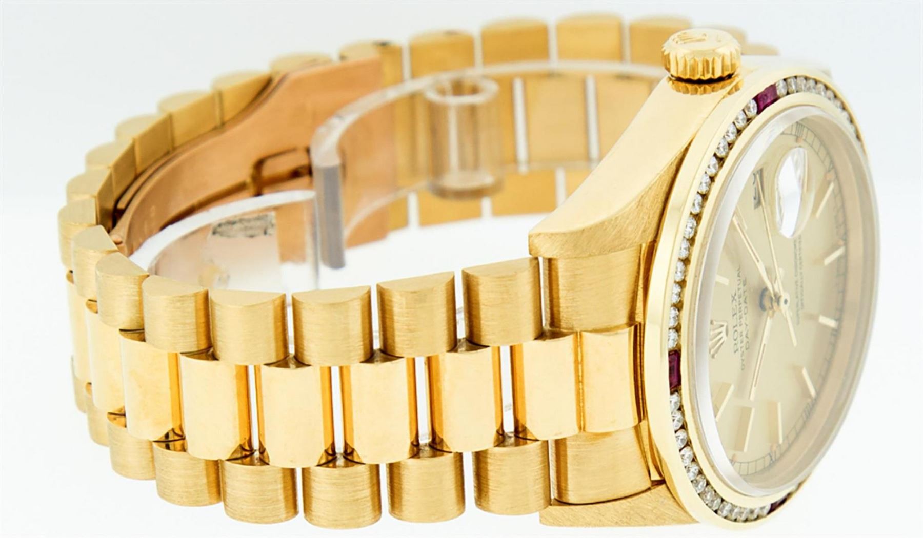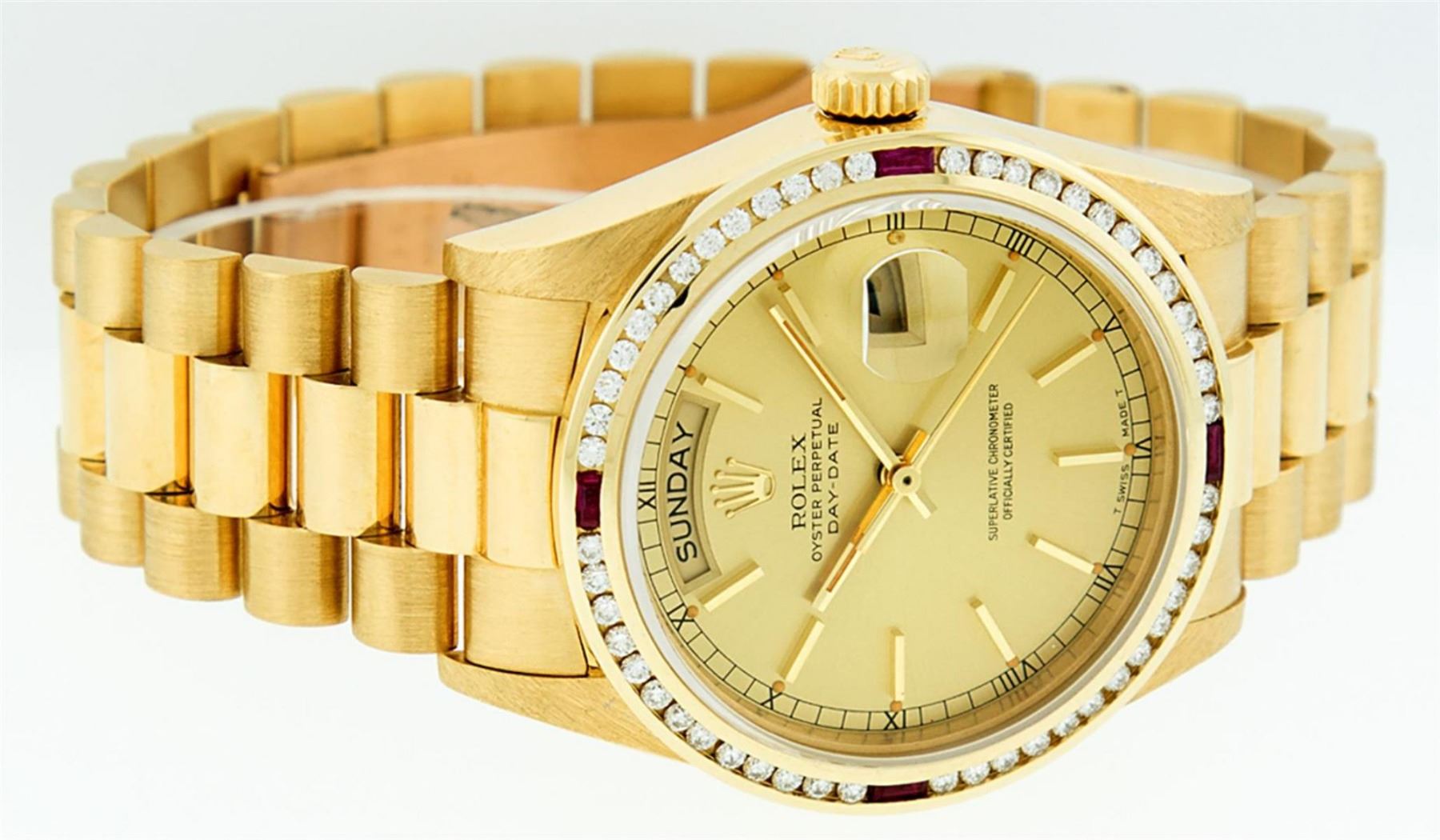 One Mens Rolex Day Date 18K Yellow Gold President Polished, Serviced & Electronically Tested, 18K Yellow Gold Case: 36mm, 18K Yellow Gold Crown, Custom Bezel: New 18K Yellow Gold Channel Set + Ruby Diamond Bezel, Diamond + Stone Count: 52 Diamonds + 4 Rubies On Bezel. Total Weight 1.30 Carat, Clarity: SI-VS, Color: G to H. Custom Crystal: New Scratch Resistant Synthetic Sapphire Cyclops Lens. Custom Hands: New Luminescent Hands. This Watch Has Been Serviced Time Tested And Is In Excellent Condition It Is Free Of All Scratches And Dents. Movement: Automatic Winding Movement Caliber 3055. Dial: Champagne Index With Roman Track & Lumi Dots. Date Window: 3 O'Clock Position Date Display, Day Window: 12 O'Clock Position Date Display. Quickset, Model: Day Date President. Condition: G-6 Extra Fine The Watch Is In Very Good Condition Free Of All Scratches And Dents. Bracelet: 18K Yellow Gold President Band. Bright Polish. 7.0 Inch Length, Standard Hidden President Clasp President Band, With Rolex Logo. This Watch Comes With A Rolex Box & Appraisal.
