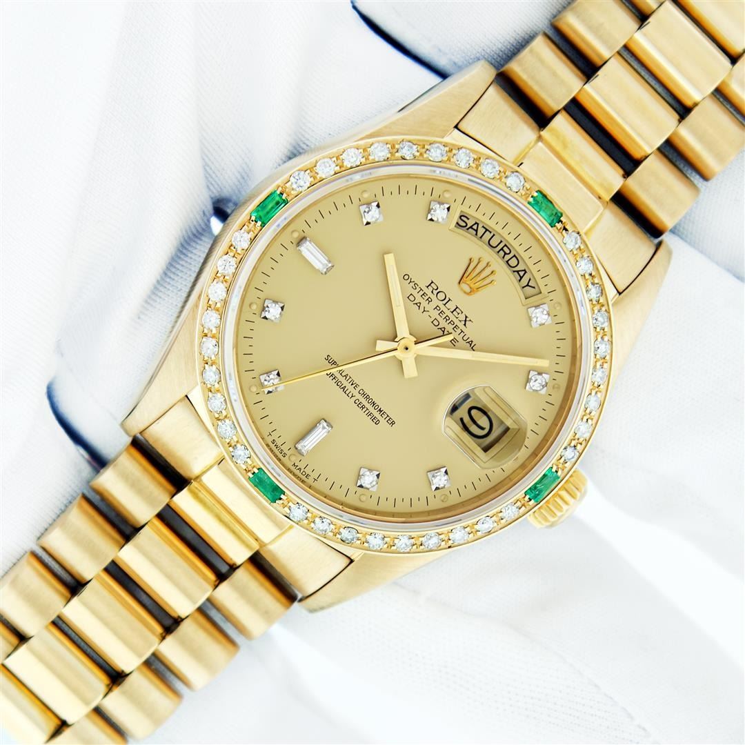 One Mens Pre Owned Rolex Day Date 18K Yellow Gold President Polished, Serviced & Electronically Tested, Rolex 18K Yellow Gold Case: 36mm, Rolex 18K Yellow Gold Crown, Custom Bezel: Custom Bezel: New 18K Yellow Gold Diamond Bezel, Diamond Count 36 Diamonds + 4 Emeralds On Bezel, Clarity: SI-VS, Color: G to H.. Custom Crystal: New Sapphire With Magnified Date Window. Custom Hands: New Luminescent Hands. Rolex Movement: Automatic Winding Movement Caliber 3055. Rolex Dial: Factory Champagne Diamond Dial, Diamond Count: 8 Diamonds + 2 Baguettes, Clarity: VS. Date Window: 3 O'Clock Position Date Display, Day Window: 12 O'Clock Position Date Display. Quickset, Model: Day Date President. Condition: G-6 Extra Fine. Rolex Bracelet: New 18K Yellow Gold President Band. Bright Polish. 7.0 Inch Length, Standard Hidden President Clasp President Band, With Rolex Logo. This Watch Has Been Serviced And Polished It Is Free Of All Scratches And Dents.