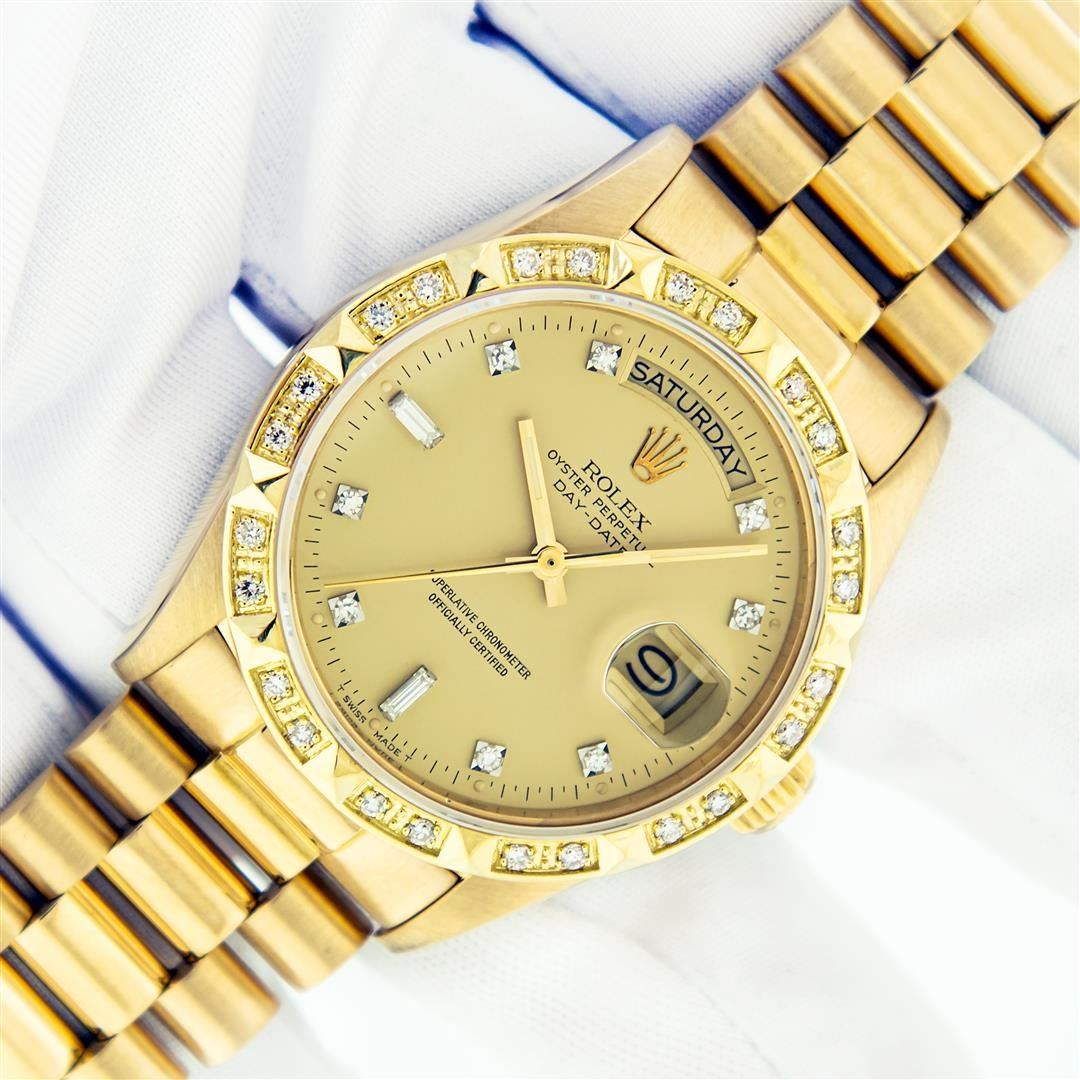 One Mens Pre Owned Rolex Day Date 18K Yellow Gold President Polished, Serviced & Electronically Tested, Rolex 18K Yellow Gold Case: 36mm, Rolex 18K Yellow Gold Crown, Custom Bezel: New 18K Yellow Gold Pyramid Beadset Diamond Bezel, Diamond Count: 24 Diamonds On Bezel. Clarity: SI-VS, Color: G to H. Custom Crystal: New Sapphire With Magnified Date Window. Custom Hands: New Luminescent Hands. Rolex Movement: Automatic Winding Movement Caliber 3055. Rolex Dial: Factory Champagne Diamond Dial, Diamond Count: 8 Diamonds + 2 Baguettes, Clarity: VS. Date Window: 3 O'Clock Position Date Display, Day Window: 12 O'Clock Position Date Display. Quickset, Model: Day Date President. Condition: G-6 Extra Fine. Rolex Bracelet: New 18K Yellow Gold President Band. Bright Polish. 7.0 Inch Length, Standard Hidden President Clasp President Band, With Rolex Logo. This Watch Has Been Serviced And Polished It Is Free Of All Scratches And Dents.
