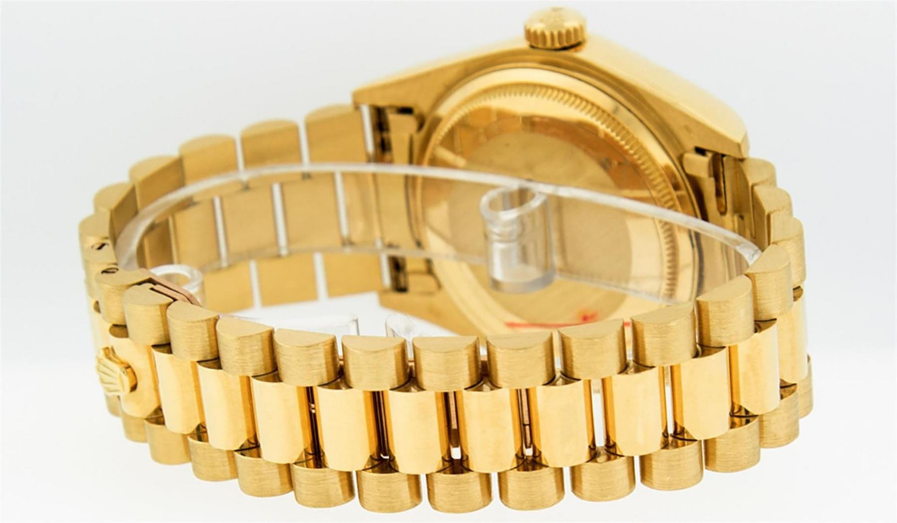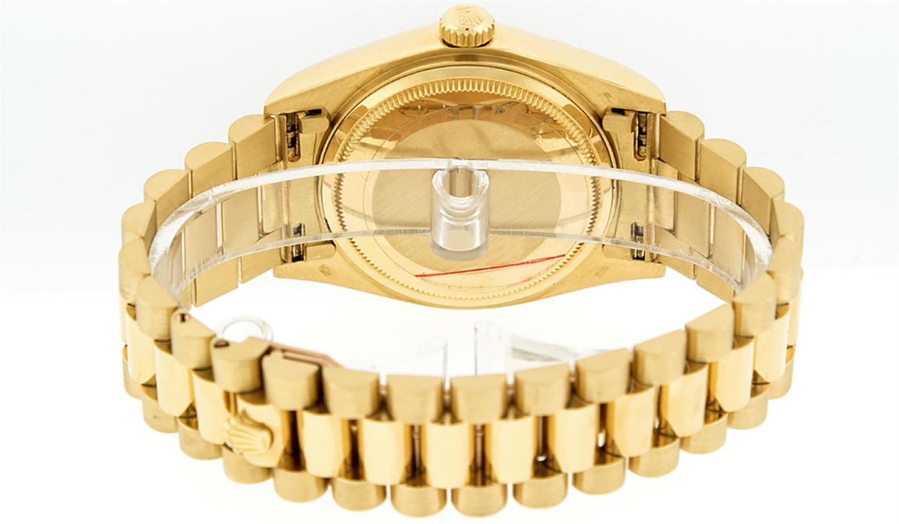 One Mens Quickset Rolex Day Date 18K Yellow Gold President Polished, Serviced & Electronically Tested, 18K Yellow Gold Case: 36mm, 18K Yellow Gold Crown, Bezel: 18K Yellow Gold Fluted Bezel. Custom Crystal: New Scratch Resistant Synthetic Sapphire Cyclops Lens. Custom Hands: New Luminescent Hands. Movement: Automatic Quickset Winding Movement Caliber 3055. Custom Dial: Refinished Mother Of Pearl String Single Cut Diamond Dial, Diamond Count: 49 Diamonds + 2 Diamond Baguettes, Color: G To H, Clarity: SI - VS, Date Window: 3 O'Clock Position, Day Display: 12 O'Clock Position, Single Quickset, Model: Day Date President. Condition: G-6 Extra Fine. Bracelet: 18K Yellow Gold President Band With Hidden Clasp, Bright & Satin Polish. 7.0 Inch Length, Standard President Clasp, With Rolex Logo. This Watch Comes With A Rolex Box And Appraisal.