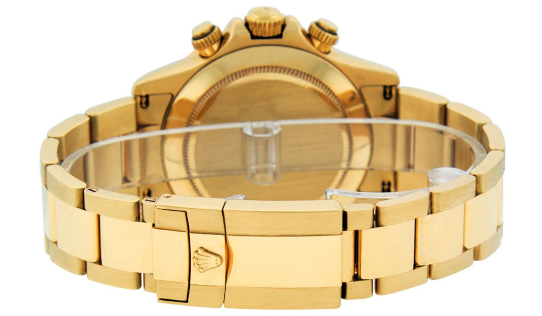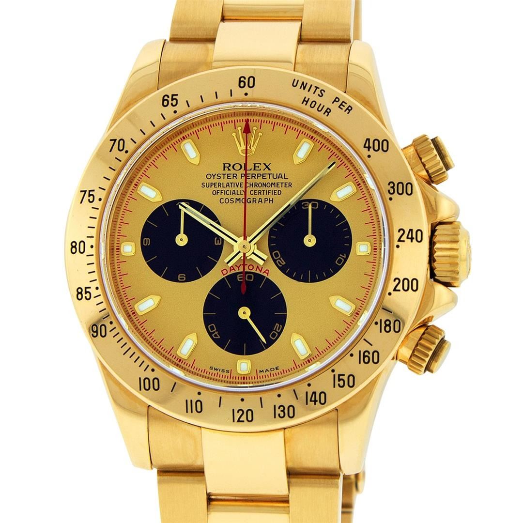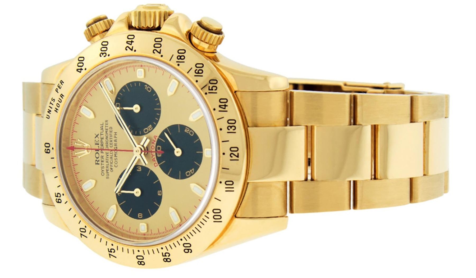 One Mens Pre Owned Rolex 18K Yellow Gold Daytona "Paul Newman" Champagne Dial, Polished, Serviced & Electronically Tested, Yellow Gold Case: 40mm, 18K Yellow Gold Crown, Bezel: 18K Yellow Gold Tachymeter Bezel. Crystal: Sapphire. Rolex Movement: Automatic