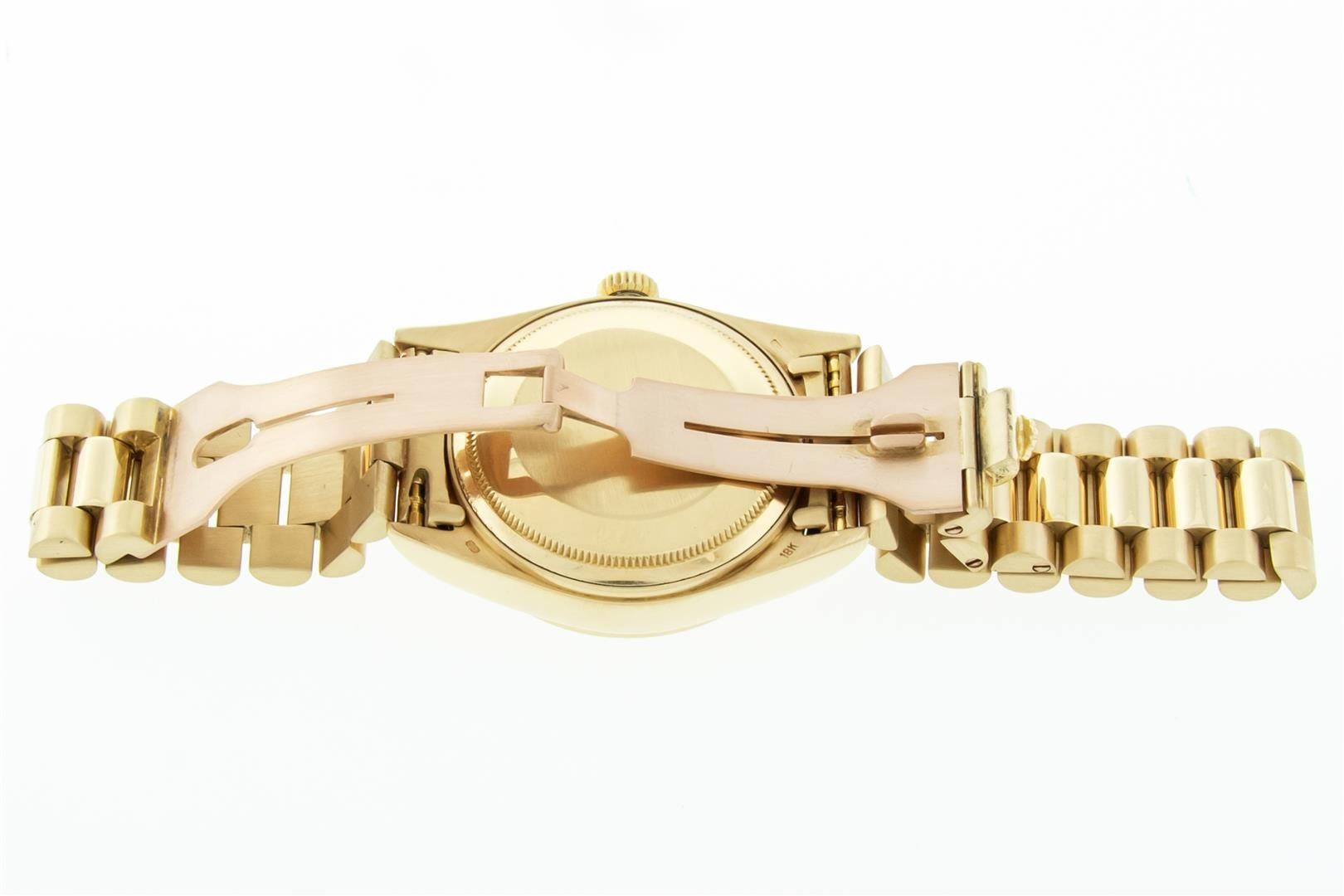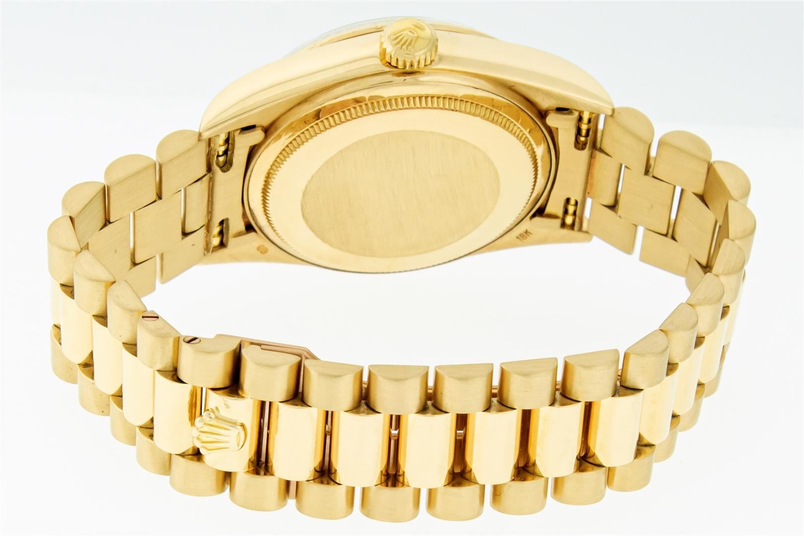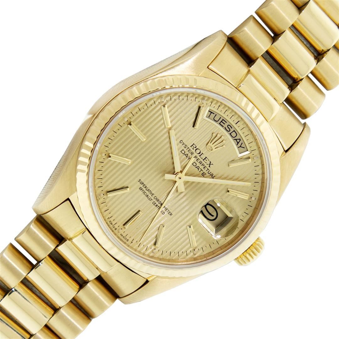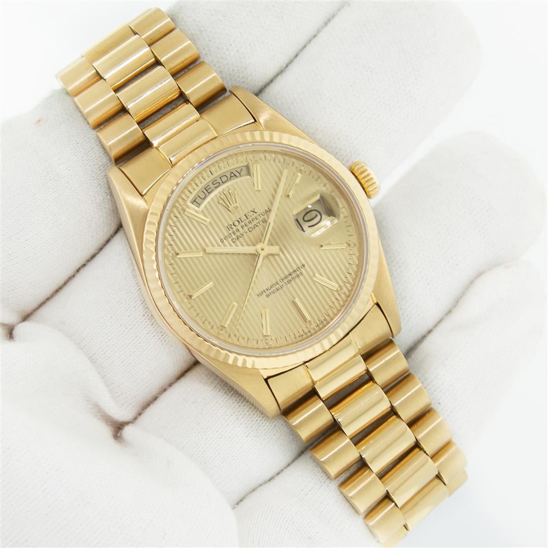 One Mens Pre Owned Quickset Rolex Day Date 18K Yellow Gold President Polished, Serviced & Electronically Tested, Rolex 18K Yellow Gold Case: 36mm, Rolex 18K Yellow Gold Crown, Rolex Bezel: 18K Yellow Gold Fluted Bezel. Crystal: Sapphire With Cyclops Lens. Rolex Movement: Automatic Quickset Winding Movement Caliber 3055. Rolex Dial: Factory Champagne Tapestry Index Dial With Dash Track. Date Window: 3 O'Clock Position, Day Display: 12 O'Clock Position, Single Quickset, Model: Day Date President. Condition: G-6 Extra Fine. Rolex Bracelet: 18K Yellow Gold President Band With Hidden Clasp, Bright & Satin Polish. 7.0 Inch Length, Standard President Clasp, With Rolex Logo. This Watch Comes With A Rolex Box.