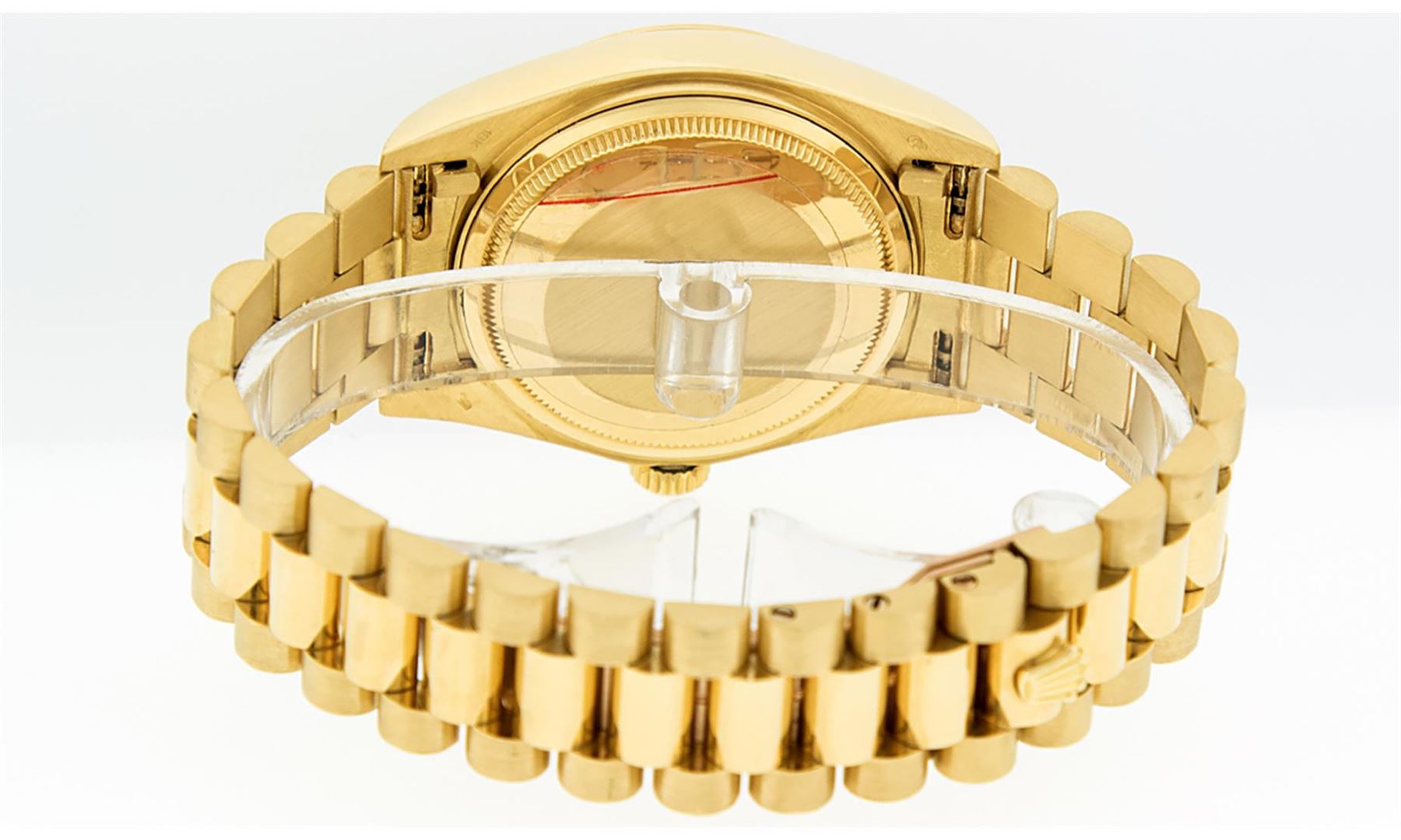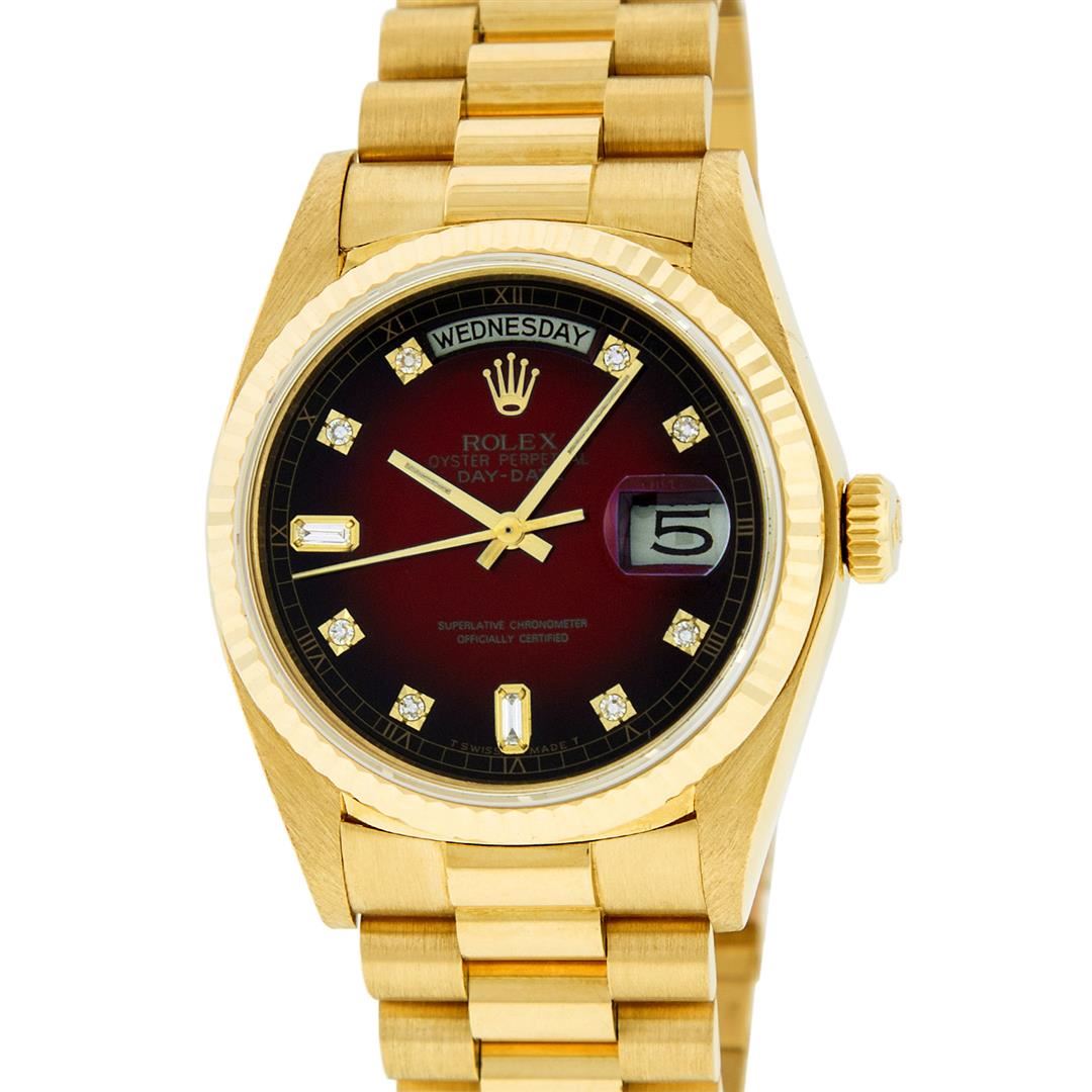 One Mens Quickset Rolex Day Date 18K Yellow Gold President Polished, Serviced & Electronically Tested, 18K Yellow Gold Case: 36mm, 18K Yellow Gold Crown, Bezel: 18K Yellow Gold Fluted Bezel. Custom Crystal: New Scratch Resistant Synthetic Sapphire Cyclops Lens. This Watch Has Been Serviced Time Tested And Is In Excellent Condition It Is Free Of All Scratches And Dents. Movement: Automatic Quickset Winding Movement Caliber 3055. Custom Dial: Refinished Red Vignette Single Cut Diamond Dial With Roman Track, Diamond Count: 8 Diamonds + 2 Diamond Baguettes, Color: G to H, Clarity: SI-VS, Date Window: 3 O'Clock Position, Day Display: 12 O'Clock Position, Single Quickset, Model: Day Date President. Condition: G-6 Extra Fine. Bracelet: 18K Yellow Gold President Band With Hidden Clasp, Bright & Satin Polish. 7.0 Inch Length, Standard President Clasp, With Rolex Logo. This Watch Comes With A Rolex Box.