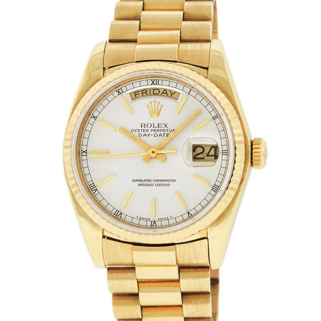 One Mens Quickset Rolex Day Date 18K Yellow Gold President Polished, Serviced & Electronically Tested, 18K Yellow Gold Case: 36mm, 18K Yellow Gold Crown, Bezel: 18K Yellow Gold Fluted Bezel. Custom Crystal: New Scratch Resistant Synthetic Sapphire Cyclops Lens. Custom Hands: New Luminescent Hands. This Watch Has Been Serviced Time Tested And Is In Excellent Condition It Is Free Of All Scratches And Dents. Movement: Automatic Quickset Winding Movement Caliber 3055. Custom Dial: Silver Index With Roman Track & Lumi Dots. Date Window: 3 O'Clock Position, Day Display: 12 O'Clock Position, Single Quickset, Model: Day Date President. Condition: G-6 Extra Fine. Bracelet: 18K Yellow Gold President Band With Hidden Clasp, Bright & Satin Polish. 7.0 Inch Length, Standard President Clasp, With Rolex Logo. This Watch Comes With A Rolex Box.