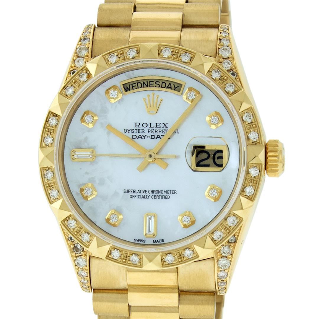 One Mens Rolex Day Date 18K Yellow Gold President Polished, Serviced & Electronically Tested, 18K Yellow Gold Case: 36mm, Custom Diamond Lugs: 28 Diamonds On Lugs, Color: G to H, Clarity: SI-VS. 18K Yellow Gold Crown, Custom Bezel: 18K Yellow Gold Pyramid Diamond Bezel, Diamond Count: 24 Diamonds On Bezel. Total Bezel Weight .75 Carat, Clarity: SI-VS, Color: G to H. Custom Crystal: New Synthetic Sapphire Cyclops Lens. Custom Hands: New Luminescent Hands. Movement: Automatic Winding Movement Caliber 3055. Custom Dial: Refinished Single Cut Mother Of Pearl 8 + 2 Baguette Diamond Dial, Diamond Count: 8 Diamonds + 2 Diamond Baguettes, Color: G to H, Clarity: SI-VS. Date Window: 3 O'Clock Position Date Display, Day Window: 12 O'Clock Position Date Display. Quickset, Model: Day Date President. Condition: G-6 Extra Fine The Watch Is In Very Good Condition Free Of All Scratches And Dents. Bracelet: 18K Yellow Gold President Band. Bright Polish. 6.75 Inch Length, Standard Hidden President Clasp President Band, With Rolex Logo. This Watch Comes With A Rolex Box, Appraisal.
