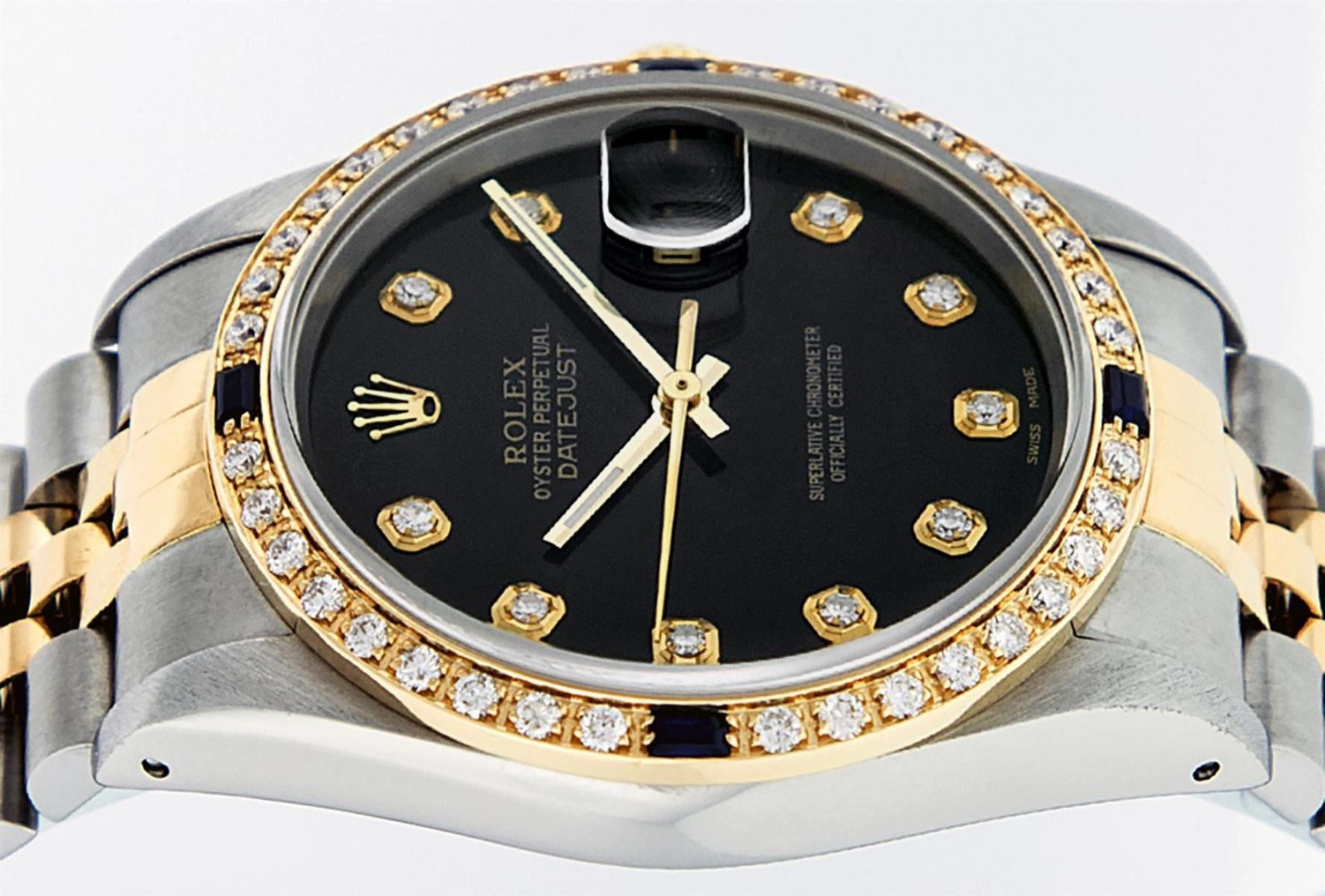 One Mens 14K Yellow Gold Two Tone Rolex Datejust Polished, Serviced & Electronically Tested, 14K Yellow Gold & Stainless Steel Case: 36mm, 14K Yellow Gold Crown, Custom Bezel: New 18K Yellow Gold Beadset + Sapphire Diamond Bezel, Stone Count: 36 Diamonds + 4 Sapphires On The Bezel, Total Weight 1.00 Carat, Clarity: SI-VS, Color: G to H. Custom Crystal: New Scratch Resistant Synthetic Sapphire Cyclops Lens. Custom Hands: New Luminecent Hands. Movement: Automatic Winding Movement Caliber 3035. Custom Dial: Black With Single Cut Diamond Hour Markers. Diamond Count: 10 Diamonds In Dial, Clarity: VS, Color: Color G to H Date Window: 3 O'Clock Position Date Display, Quickset, Model: Datejust. Condition: G-6 Extra Fine. Bracelet: Two Tone 14K Yellow Gold & Stainless Steel Jubilee Band. Bright Polish. 7.0 Inch Length, Adjustable. Standard Clasp, With Rolex Logo. This Watch Has Been Serviced Time Tested And Is In Excellent Condition It Is Free Of All Scratches And Dents.