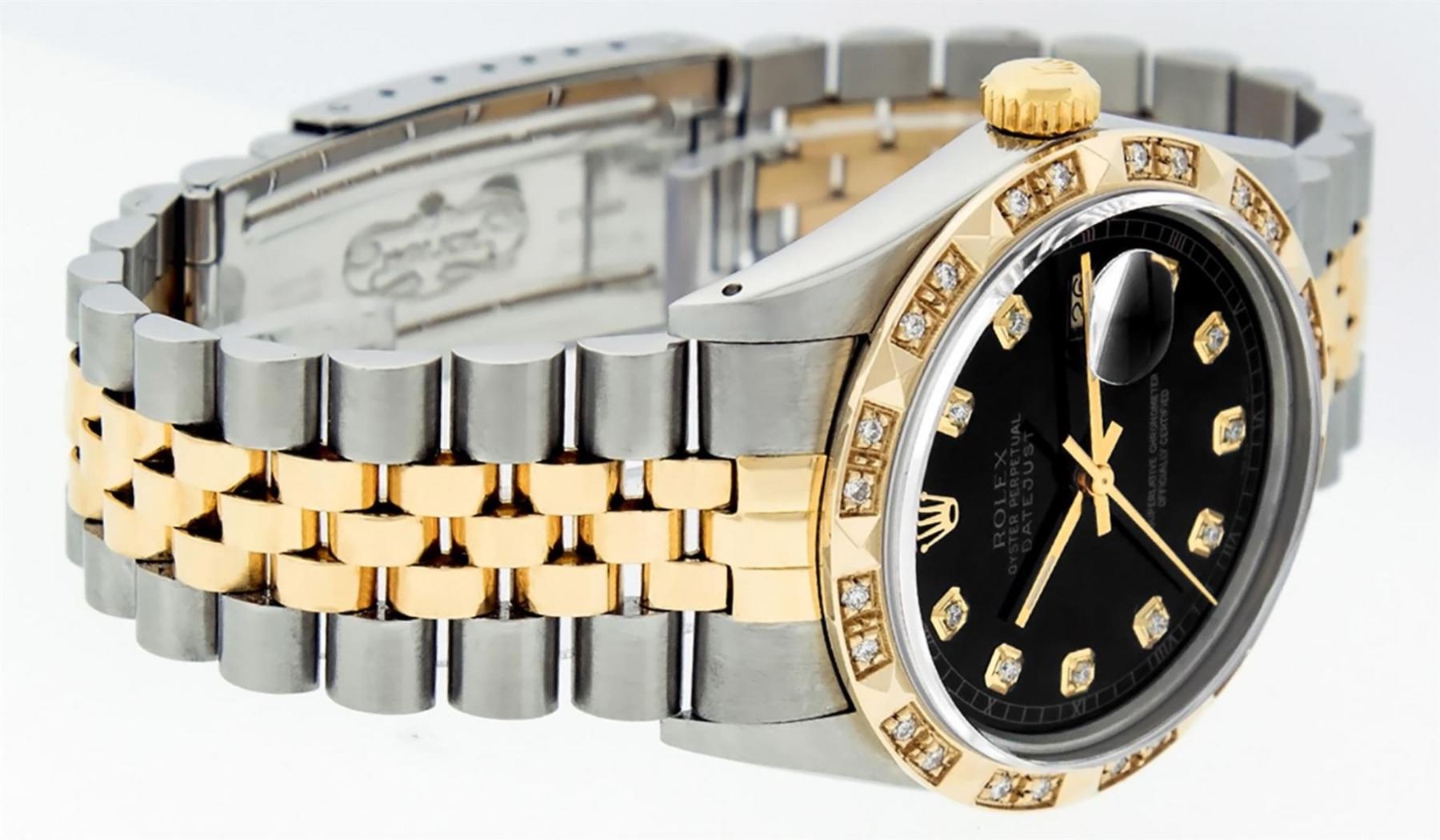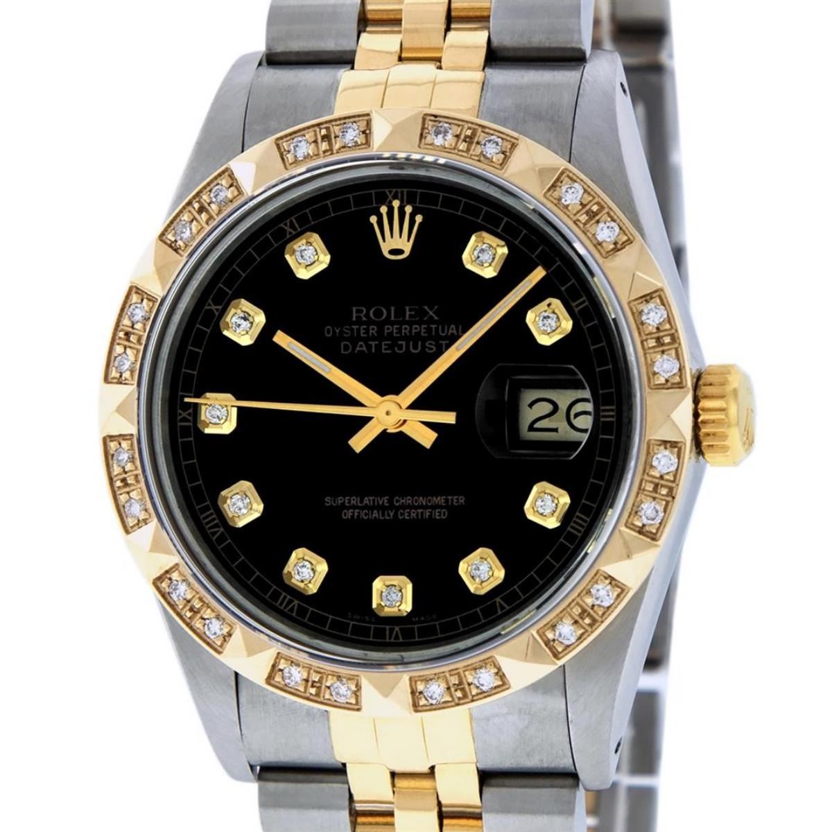 One Mens 14K Yellow Gold Rolex Datejust Polished Bright with Satin Finish, Serviced & Electronically Tested, Stainless Steel Case: 36mm, Yellow Gold Crown, Custom Bezel: New 18K Yellow Gold Pyramid Diamond Bezel, Diamond Count: 24 Diamonds, Total Weight .75 Carat, Clarity: SI-VS, Color: G to H. Custom Crystal: New Scratch Resistant Synthetic Sapphire Cyclops Lens. Custom Hands: New Luminecent Hands. Movement: Automatic Winding Movement Caliber 3035. Custom Dial: Black Diamond Dial With Roman Track, Diamond Count: 10 Diamonds In Dial, Color: G to H, Clarity: VS. Date Window: 3 O'Clock Position Date Display, Quickset, Model: Datejust. Condition: G-6 Extra Fine. Bracelet: 14K Yellow Gold And Stainless Steel Jubilee Band. Bright Polish & Satin Finish. 7.0 Inch Length, Adjustable. Standard Clasp, With Rolex Logo. This Watch Has Been Serviced And Polished It Is Free Of All Scratches And Dents.