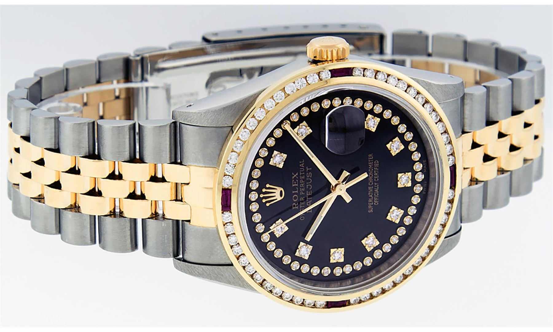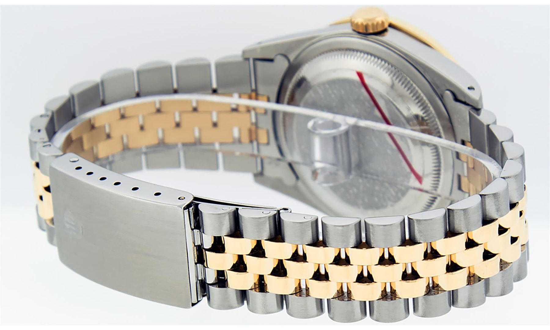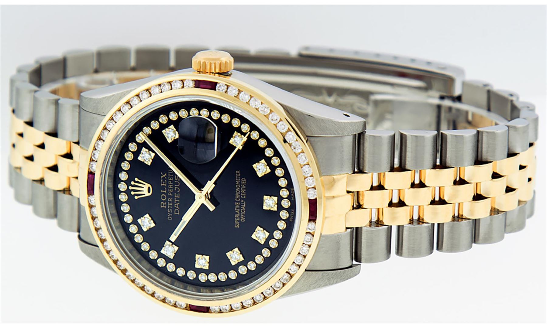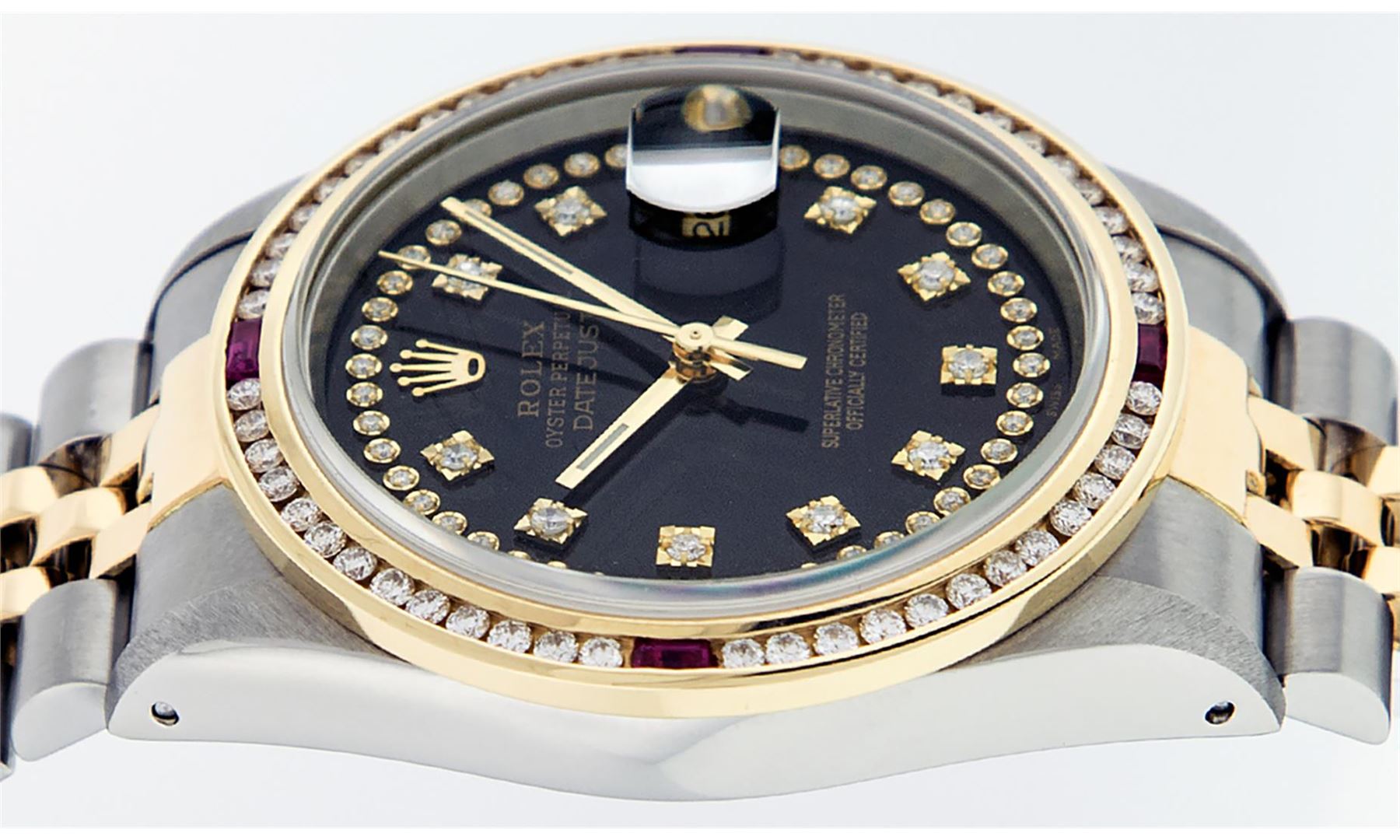 One Mens 14K Yellow Gold Two Tone Rolex Datejust Polished, Serviced & Electronically Tested, 14K Yellow Gold & Stainless Steel Case: 36mm, 14K Yellow Gold Crown, Custom Bezel: 18K Yellow Gold Ruby Channel Set Diamond Bezel, Diamond Count: 52 Diamonds + 4 Rubies, Total Weight 1.30 Carat, Clarity: SI-VS, Color: G to H. Custom Crystal: New Scratch Resistant Synthetic Sapphire Cyclops Lens. Custom Hands: New Luminecent Hands. Movement: Automatic Winding Movement Caliber 3035. Custom Dial: Black String Diamond Dial With Single Cut Diamonds, Diamond Count: 58 Diamonds in Dial. Date Window: 3 O'Clock Position Date Display, Quickset, Model: 16013 Datejust. Condition: G-6 Extra Fine. Bracelet:Two Tone 14K Yellow Gold & Stainless Steel Jubilee Band. Bright Polish. 7.0 Inch Length, Adjustable. Standard Clasp, With Rolex Logo. This Watch Has Been Serviced Time Tested And Is In Excellent Condition It Is Free Of All Scratches And Dents.