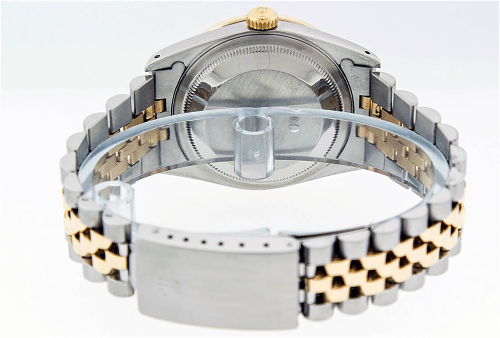 One Mens 14K Yellow Gold Two Tone Rolex Datejust Polished, Serviced & Electronically Tested, 14K Yellow Gold & Stainless Steel Case: 36mm, 14K Yellow Gold Crown, Custom Bezel: 18K Yellow Gold Beadset Diamond Bezel, Diamond Count: 44 Diamonds, Total Weight 1.00 Carat, Clarity: SI-VS, Color: G to H. Custom Crystal: Synthetic Sapphire Cyclops Lens. Custom Hands: New Luminecent Hands. Movement: Automatic Winding Movement Caliber 3035. Custom Dial: Black VS Single Cut String Diamond Dial, Diamond Count: 58 Diamonds in Dial G To H In Color, VS In Clarity. Date Window: 3 O'Clock Position Date Display, Quickset, Model: 16013 Datejust. Condition: G-6 Extra Fine. Bracelet:Two Tone 14K Yellow Gold & Stainless Steel Jubilee. Bright Polish. 7.0 Inch Length, Adjustable. Standard Clasp, With Rolex Logo. This Watch Has Been Serviced Time Tested And Is In Excellent Condition It Is Free Of All Scratches And Dents.