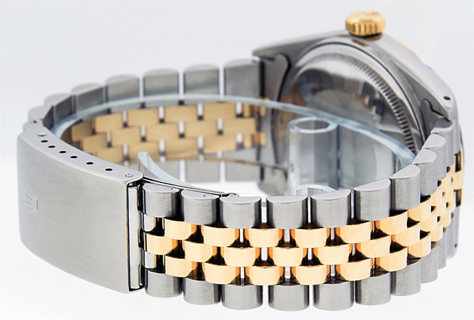 One Mens 14K Yellow Gold Two Tone Rolex Datejust Polished, Serviced & Electronically Tested, 14K Yellow Gold & Stainless Steel Case: 36mm, 14K Yellow Gold Crown, Bezel: 14K Yellow Gold Fluted Bezel. Custom Crystal: New Acrylic Cyclops Lens. Custom Hands: New Luminecent Hands. Movement: Automatic Winding Movement Caliber 3035. Custom Dial: Blue With Diamond Hour Markers And Square Roman Track, Diamond Count: 10 Diamonds in Dial, G To H In Color, SI-VS Clarity. Date Window: 3 O'Clock Position Date Display, Quickset, Model: 16013 Datejust, Condition: G-6 Extra Fine. Bracelet: Two Tone 14K Yellow Gold & Stainless Steel Jubilee. Bright Polish. 7.0 Inch Length, Adjustable. Standard Clasp, With Rolex Logo. This Watch Has Been Serviced And Polished It Is Free Of All Scratches And Dents.