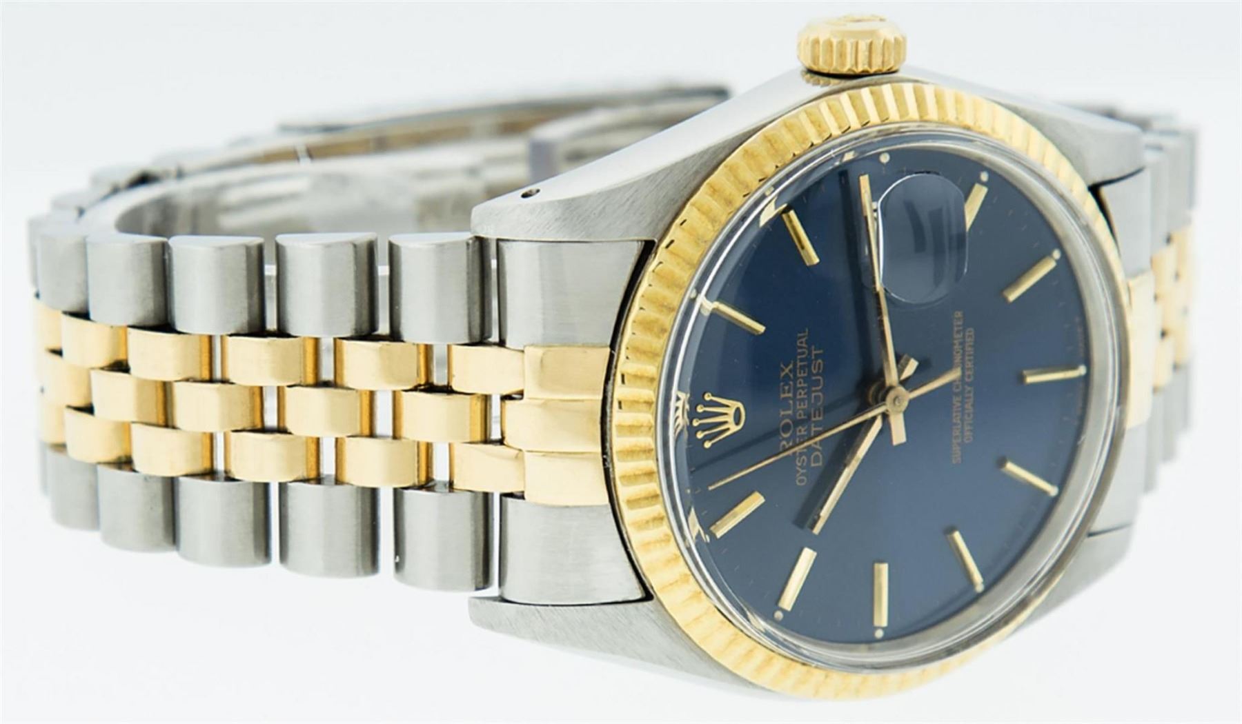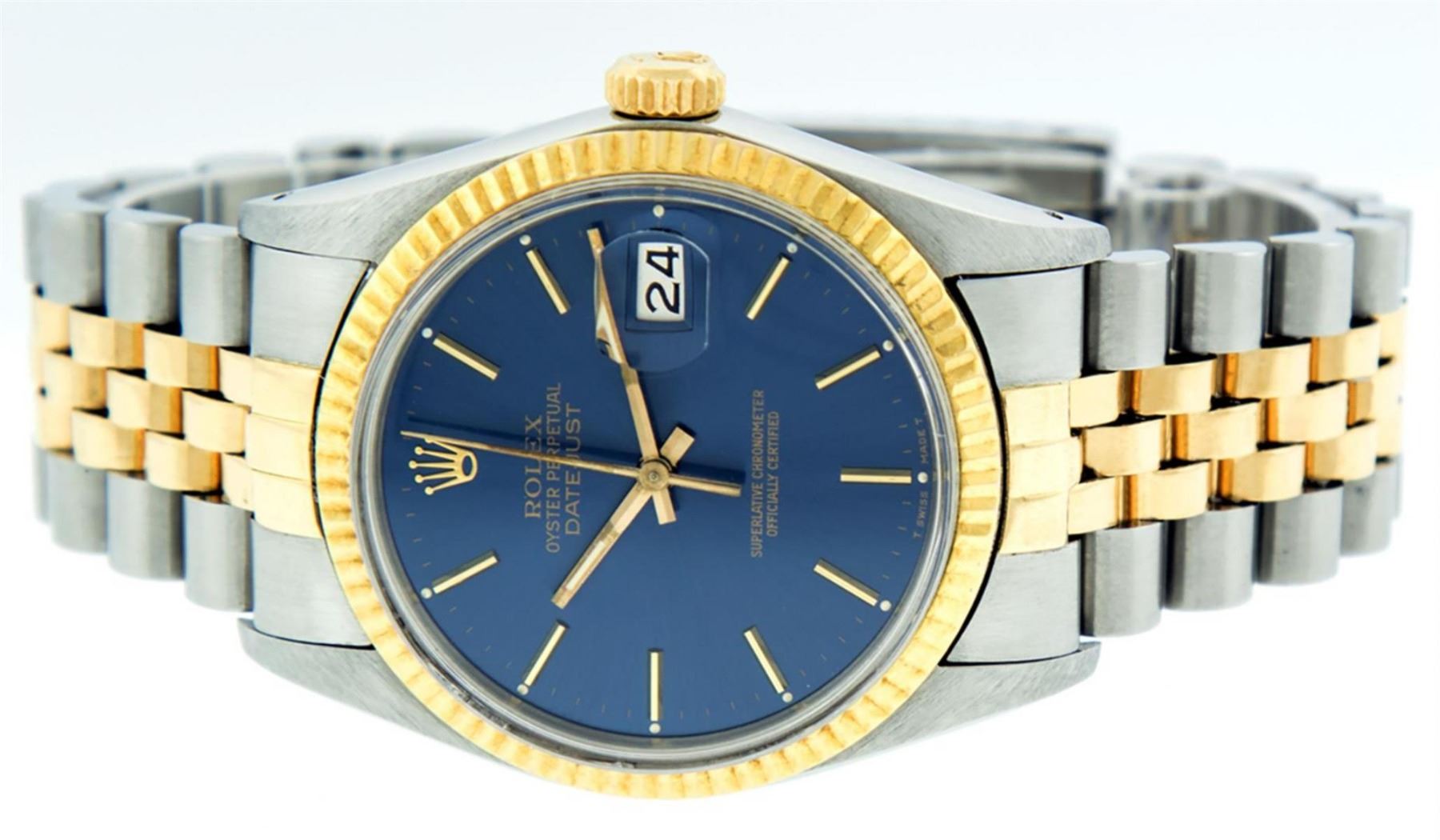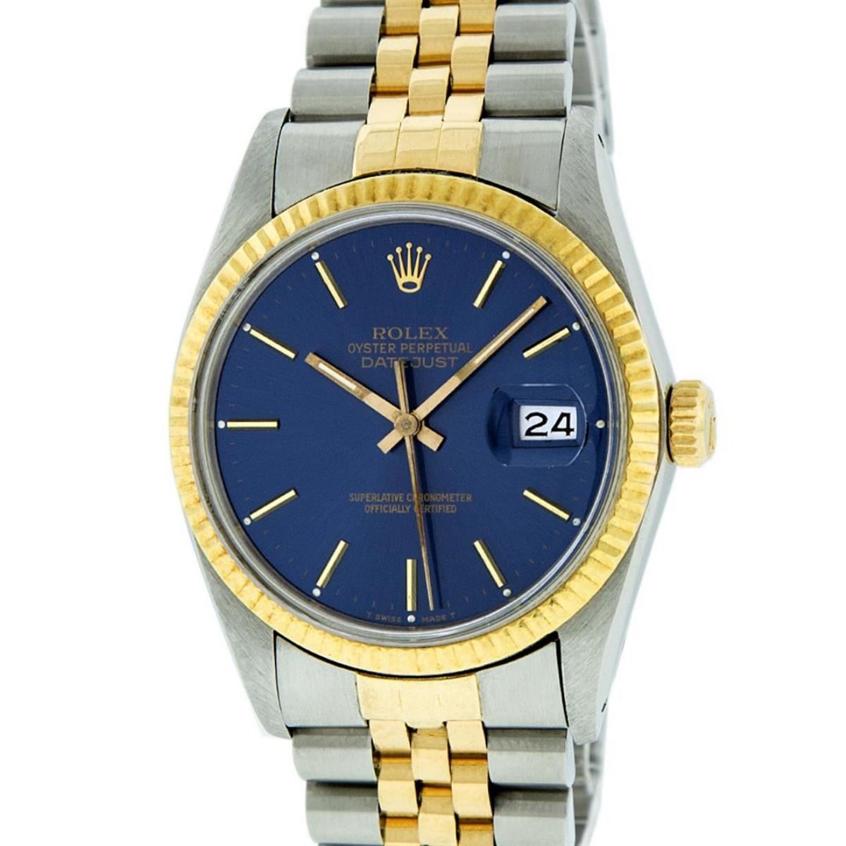 One Mens 14K Yellow Gold Two Tone Rolex Datejust Polished, Serviced & Electronically Tested, 14K Yellow Gold & Stainless Steel Case: 36mm, 14K Yellow Gold Crown, Bezel: 14K Yellow Gold Fluted Bezel. Custom Crystal: New Acrylic Cyclops Lens. Custom Hands: New Luminecent Hands. Movement: Automatic Winding Movement Caliber 3035. Custom Dial: Blue Index Dial With Index Track. Date Window: 3 O'Clock Position Date Display, Quickset, Model: 16013 Datejust. Condition: G-6 Extra Fine. Bracelet: Two Tone 14K Yellow Gold & Stainless Steel Jubilee. Bright Polish. 7.0 Inch Length, Adjustable. Standard Clasp, With Rolex Logo. This Watch Has Been Serviced Time Tested And Is In Excellent Condition It Is Free Of All Scratches And Dents.