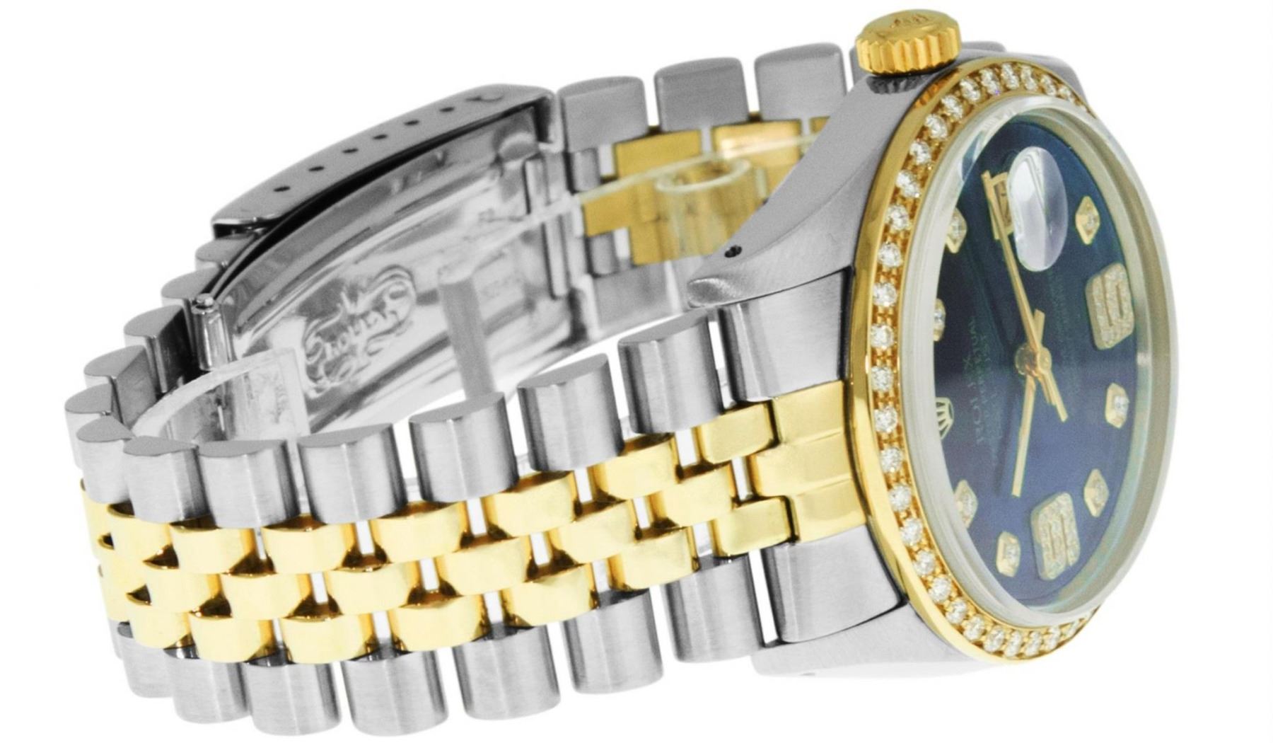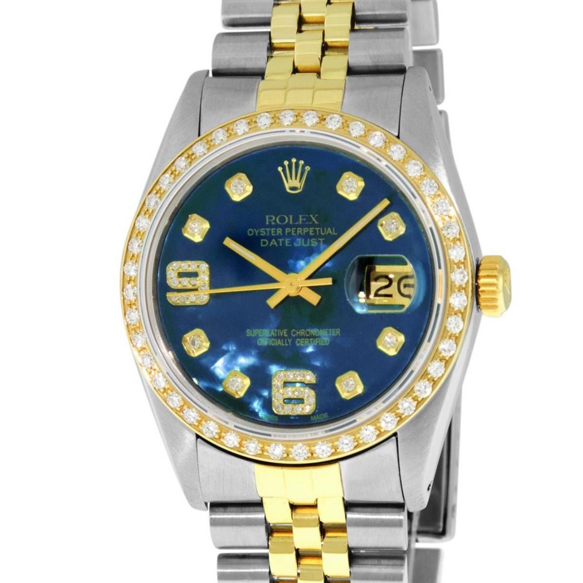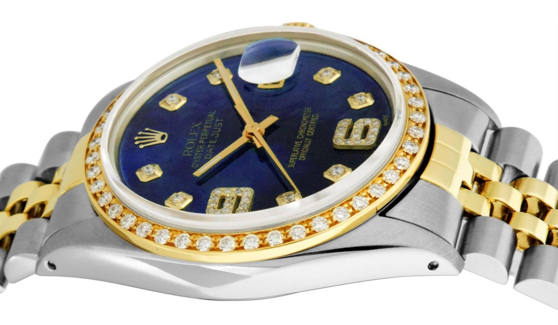 One Mens 14K Yellow Gold Two Tone Rolex Datejust Polished, Serviced & Electronically Tested, 14K Yellow Gold & Stainless Steel Case: 36mm, 14K Yellow Gold Crown, Custom Bezel: New 18K Yellow Gold Beadset Diamond Bezel, Diamond Count: 44 Diamonds On Bezel, Total Weight 1.00 Carat, Clarity: SI-VS, Color: G to H. Custom Crystal: New Scratch Resistant Synthetic Sapphire Cyclops Lens. Movement: Automatic Winding Movement Caliber 3035. Custom Dial: Blue MOP Diamond Dial with 9 & 6 Diamond Hour Markers, Diamond Count: 8 Diamonds + 28 Diamonds On 6 & 9 Hour Markers, Color: G To H In Color, Clarity: SI-VS, Date Window: 3 O'Clock Position Date Display, Quickset, Model: Datejust. Condition: G-6 Extra Fine. Bracelet: Two Tone 14K Yellow Gold & Stainless Steel Jubilee. Bright Polish. 7.0 Inch Length, Adjustable. Standard Clasp, With Rolex Logo. This Watch Has Been Serviced Time Tested And Is In Excellent Condition It Is Free Of All Scratches And Dents.