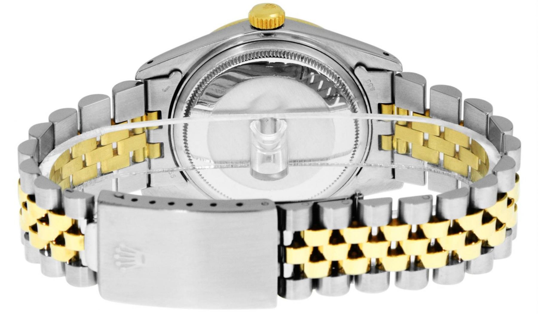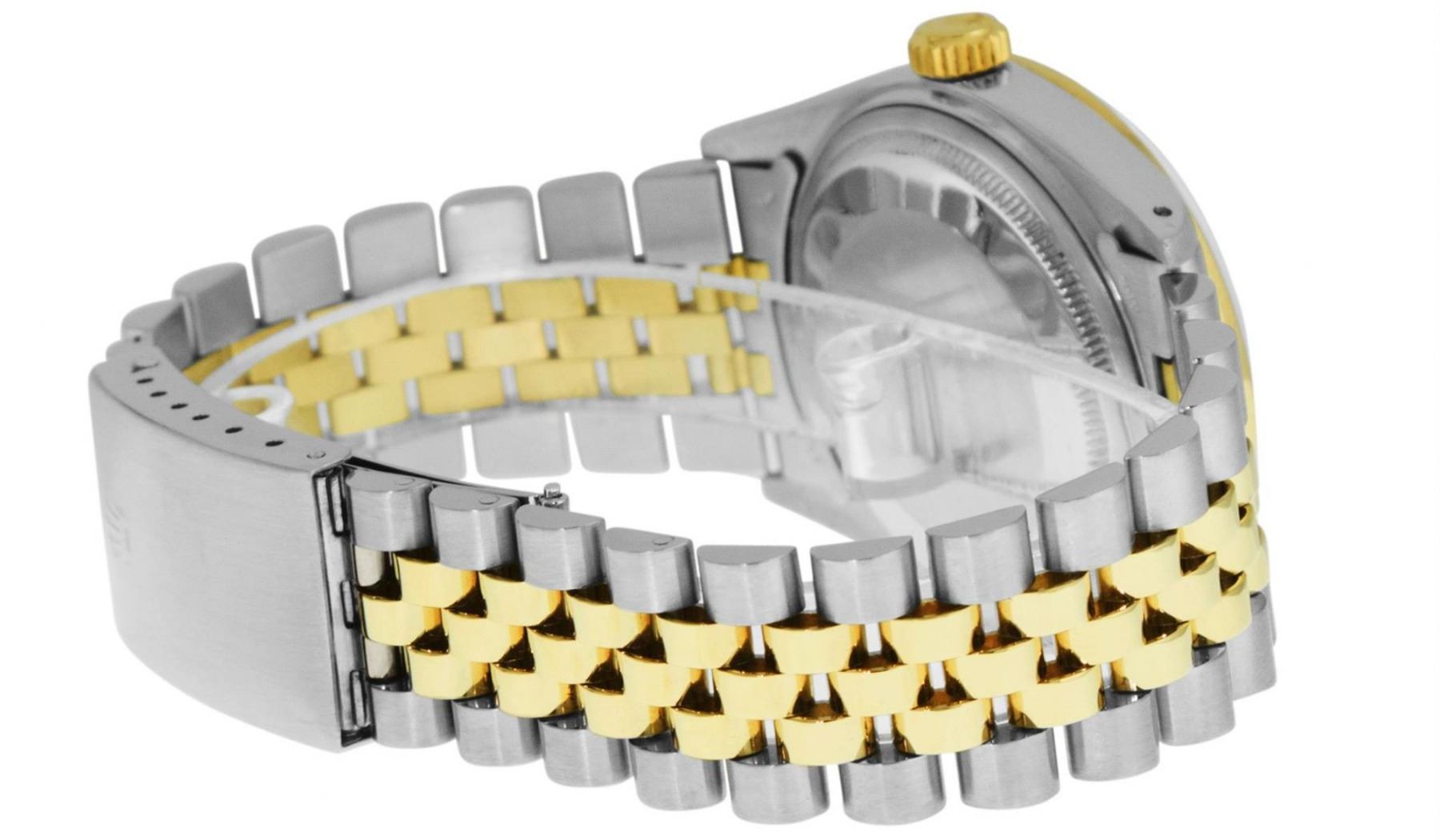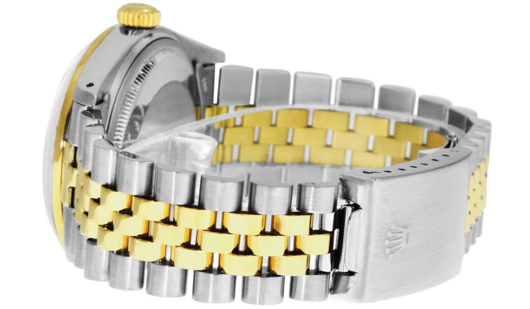 One Mens 14K Yellow Gold Two Tone Rolex Datejust Polished, Serviced & Electronically Tested, 14K Yellow Gold & Stainless Steel Case: 36mm, 14K Yellow Gold Crown, Custom Bezel: New 18K Yellow Gold Beadset Diamond Bezel, Diamond Count: 44 Diamonds On Bezel, Total Weight 1.00 Carat, Clarity: SI-VS, Color: G to H. Custom Crystal: New Scratch Resistant Synthetic Sapphire Cyclops Lens. Movement: Automatic Winding Movement Caliber 3035. Custom Dial: Blue MOP Diamond Dial with 9 & 6 Diamond Hour Markers, Diamond Count: 8 Diamonds + 28 Diamonds On 6 & 9 Hour Markers, Color: G To H In Color, Clarity: SI-VS, Date Window: 3 O'Clock Position Date Display, Quickset, Model: Datejust. Condition: G-6 Extra Fine. Bracelet: Two Tone 14K Yellow Gold & Stainless Steel Jubilee. Bright Polish. 7.0 Inch Length, Adjustable. Standard Clasp, With Rolex Logo. This Watch Has Been Serviced Time Tested And Is In Excellent Condition It Is Free Of All Scratches And Dents.