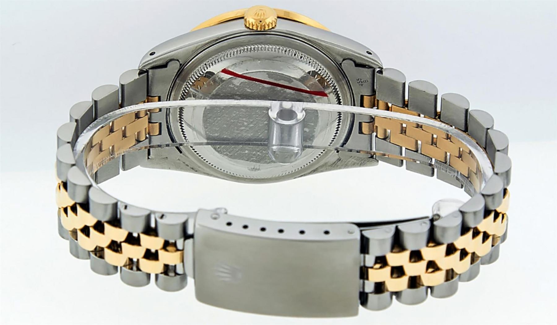 One Mens 14K Yellow Gold Rolex Datejust Polished Bright with Satin Finish, Serviced & Electronically Tested, Stainless Steel Case: 36mm, Custom Diamond Lugs: 28 Diamonds On Lugs, Color: G to H, Clarity: SI-VS. Yellow Gold Crown, Custom Bezel: New 18K Yellow Gold Beadset Diamond Bezel, Diamond Count: 44 Diamonds, Total Weight 1.00 Carat, Clarity: SI-VS, Color: G to H. Custom Crystal: New Scratch Resistant Synthetic Sapphire Cyclops Lens. Custom Hands: New Luminecent Hands. Movement: Automatic Winding Movement Caliber 3035. Custom Dial: Blue Vignette Single Cut Diamond Dial, Stone Count: 10 Diamonds In Dial, Color: G to H, Clarity: VS2. Date Window: 3 O'Clock Position Date Display, Quickset, Model: Datejust. Condition: G-6 Extra Fine. Bracelet: 14K Yellow Gold And Stainless Steel Jubilee Band. Bright Polish & Satin Finish. 7.0 Inch Length, Adjustable. Standard Clasp, With Rolex Logo. This Watch Has Been Serviced And Polished It Is Free Of All Scratches And Dents.
