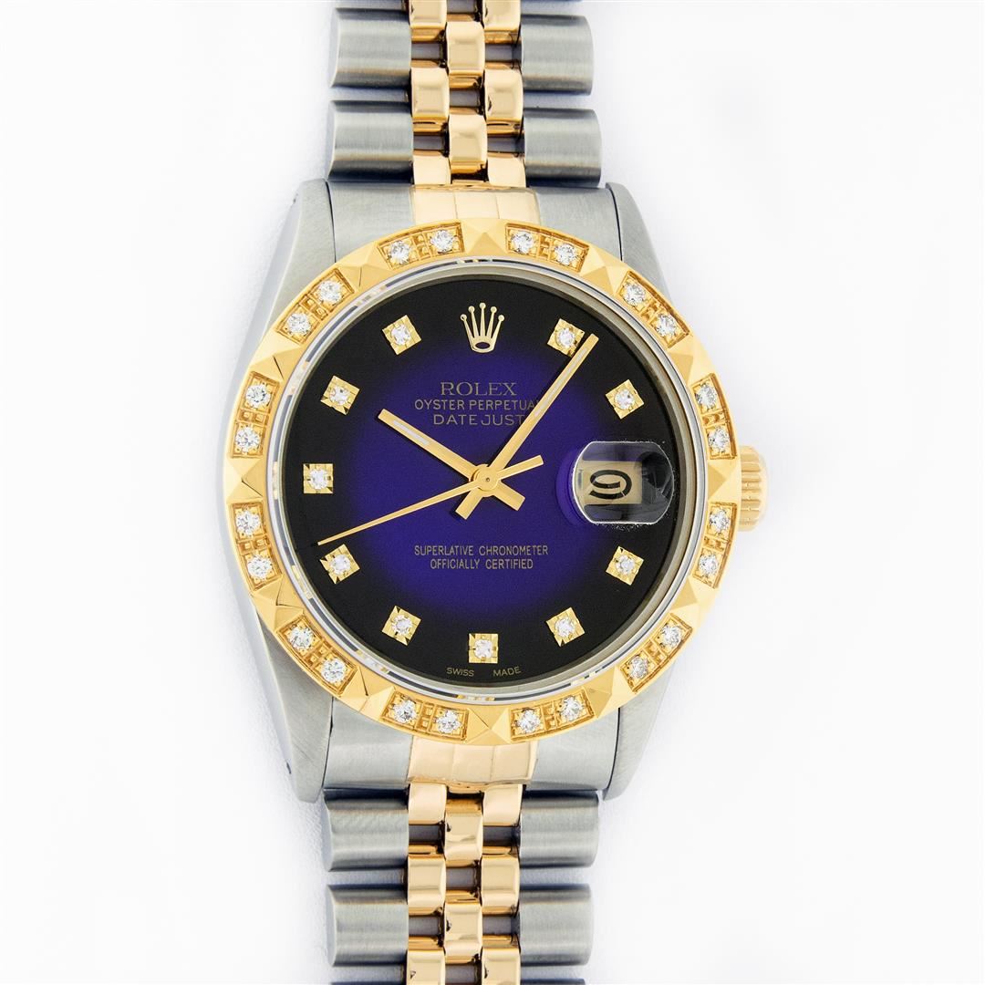 One Mens 14K Yellow Gold Rolex Datejust Polished Bright with Satin Finish, Serviced & Electronically Tested, Stainless Steel Case: 36mm, Yellow Gold Crown, Custom Bezel: New 18K Yellow Gold Pyramid Diamond Bezel, Diamond Count: 24 Diamonds In Bezel, Total Weight .75 Carat, Clarity: SI-VS, Color: G to H. Custom Crystal: New Scratch Resistant Synthetic Sapphire Cyclops Lens. Custom Hands: New Luminecent Hands. Movement: Automatic Winding Movement Caliber 3035. Custom Dial: Blue Vignette Single Cut Diamond Dial, Diamond Count: 10 Diamonds In Dial, Color: G to H, Clarity: VS. Date Window: 3 O'Clock Position Date Display, Quickset, Model: Datejust. Condition: G-6 Extra Fine. Bracelet: 14K Yellow Gold And Stainless Steel Jubilee Band. Bright Polish & Satin Finish. 7.0 Inch Length, Adjustable. Standard Clasp, With Rolex Logo. This Watch Has Been Serviced And Polished It Is Free Of All Scratches And Dents. This Watch Comes With An Appraisal And Rolex Box.