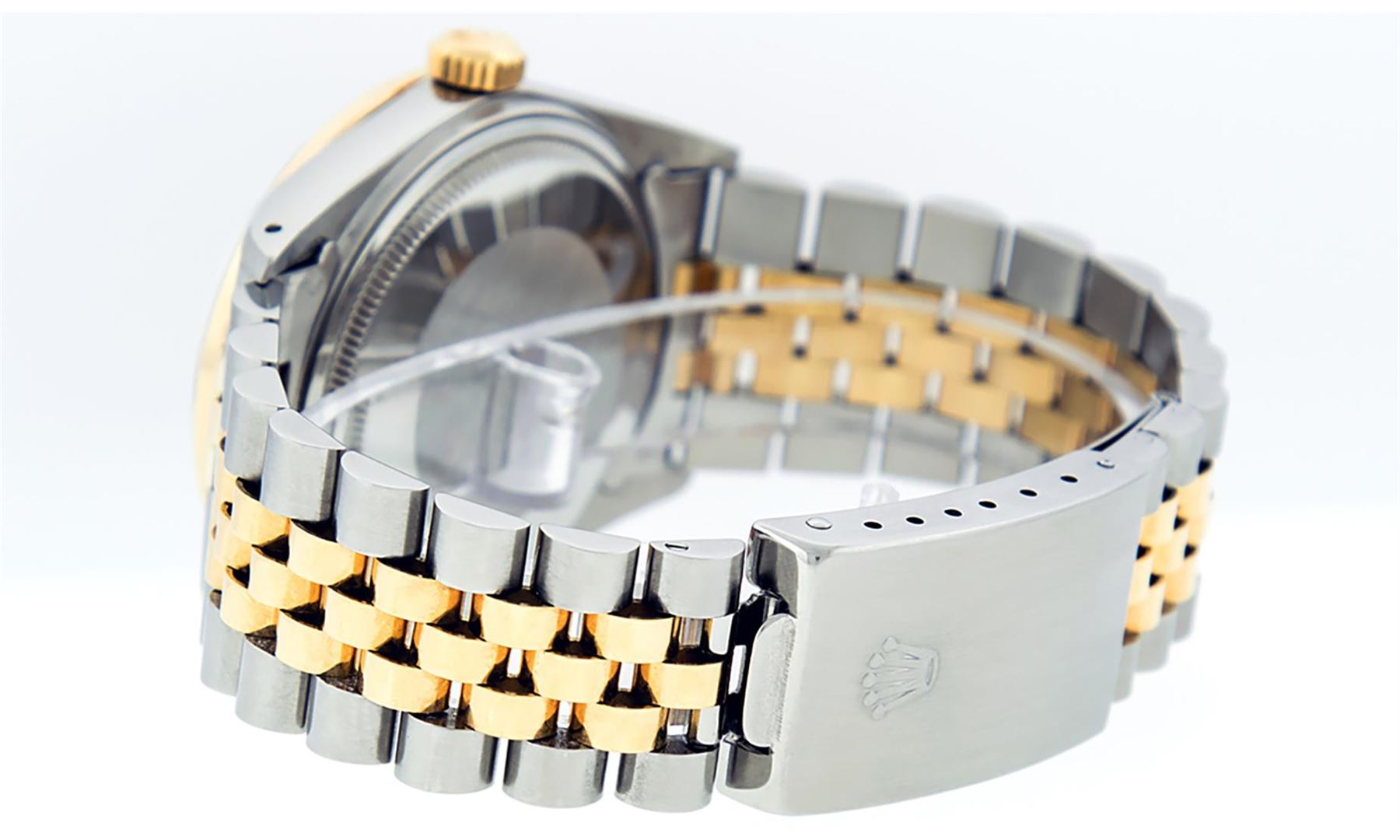 One Mens 14K Yellow Gold Two Tone Rolex Datejust Polished, Serviced & Electronically Tested, 14K Yellow Gold & Stainless Steel Case: 36mm, 14K Yellow Gold Crown, Custom Bezel: New 18K Yellow Gold Sapphire Beadset Diamond Bezel, Diamond Count: 36 Diamonds + 4 Sapphires, Total Weight 1.00 Carat, Clarity: SI-VS, Color: G to H. Custom Crystal: New Scratch Resistant Synthetic Sapphire Cyclops Lens. Movement: Automatic Winding Movement Caliber 3035. Custom Dial: Brown Dial With Diamond Hour Markers and Synthetic Sapphire Baguette Markers On 6 and 9, Stone Count: 8 Diamonds + 2 Synthetic Bagguette Sapphires In Dial. Date Window: 3 O'Clock Position Date Display, Quickset, Model: 16013 Datejust. Condition: G-6 Extra Fine. Bracelet: Two Tone 14K Yellow Gold & Stainless Steel Jubilee. Bright Polish. 7.0 Inch Length, Adjustable. Standard Clasp, With Rolex Logo. This Watch Has Been Serviced Time Tested And Is In Excellent Condition It Is Free Of All Scratches And Dents.